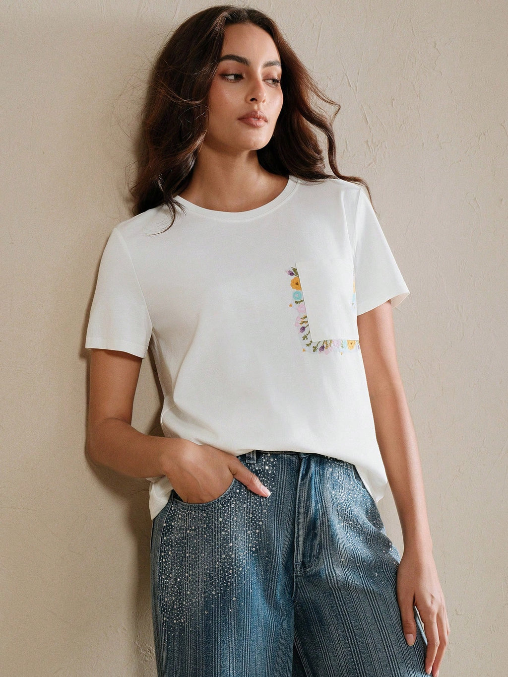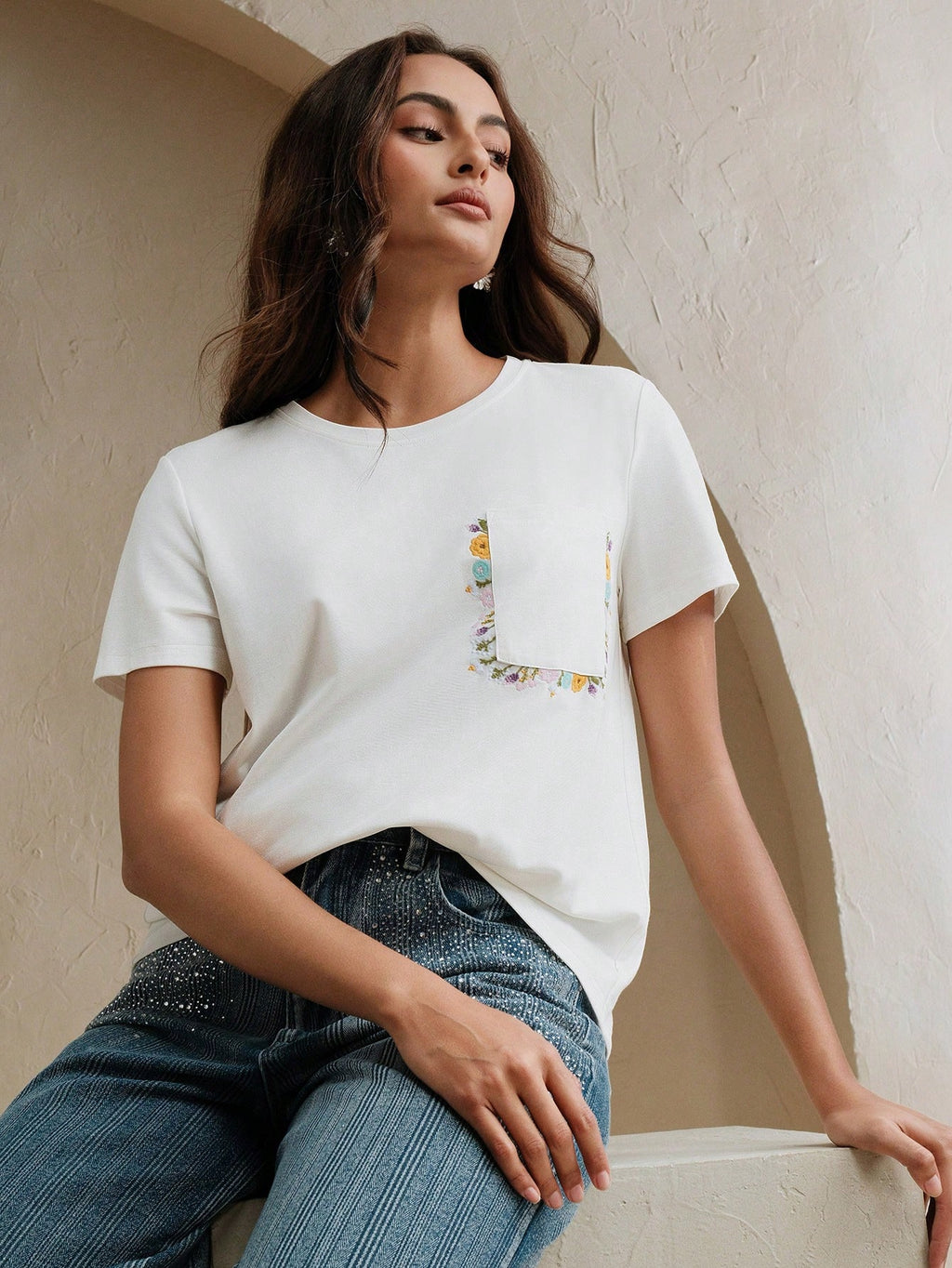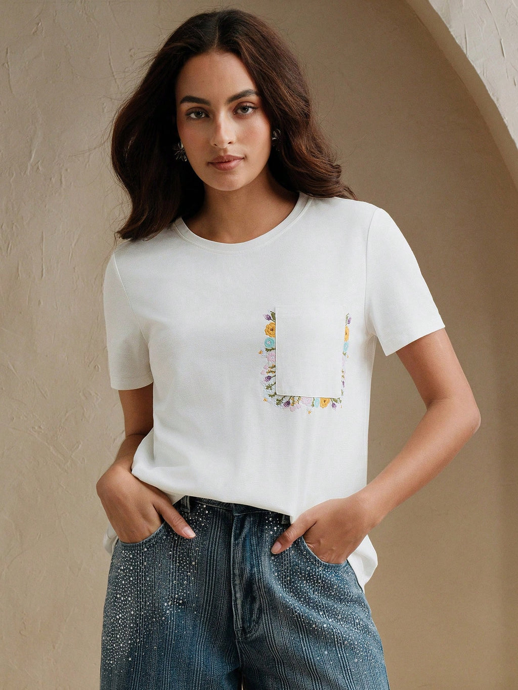 MIU Casual Embroidered Pocket Short Sleeve T-Shirt, Summer