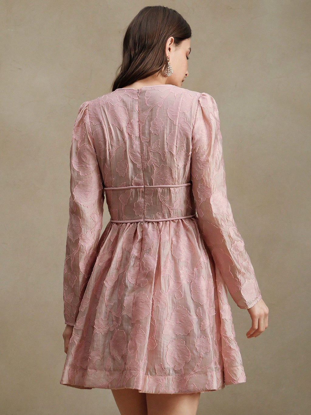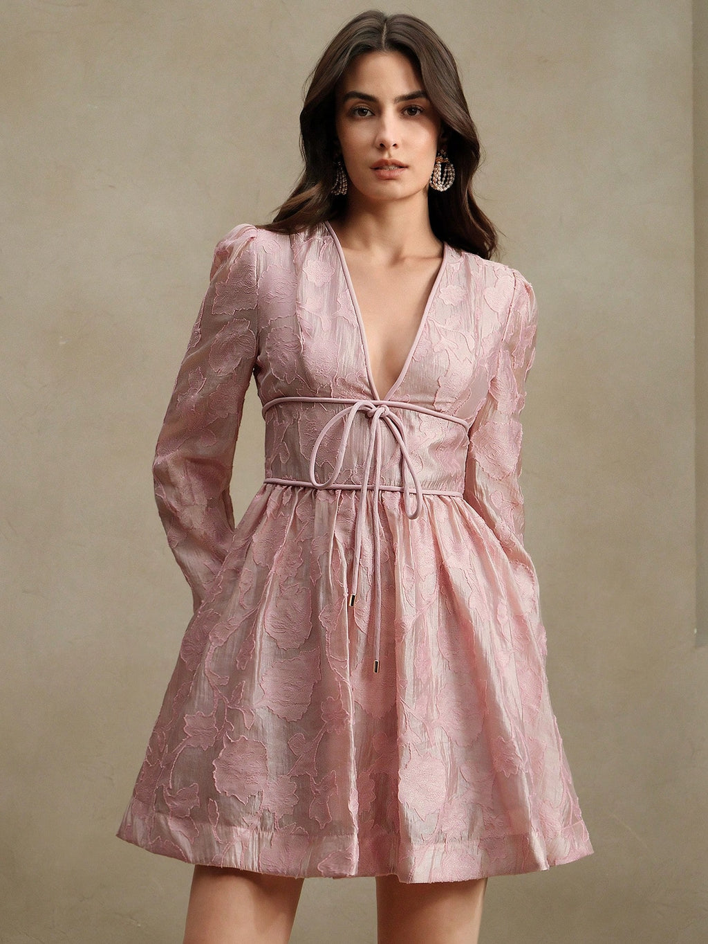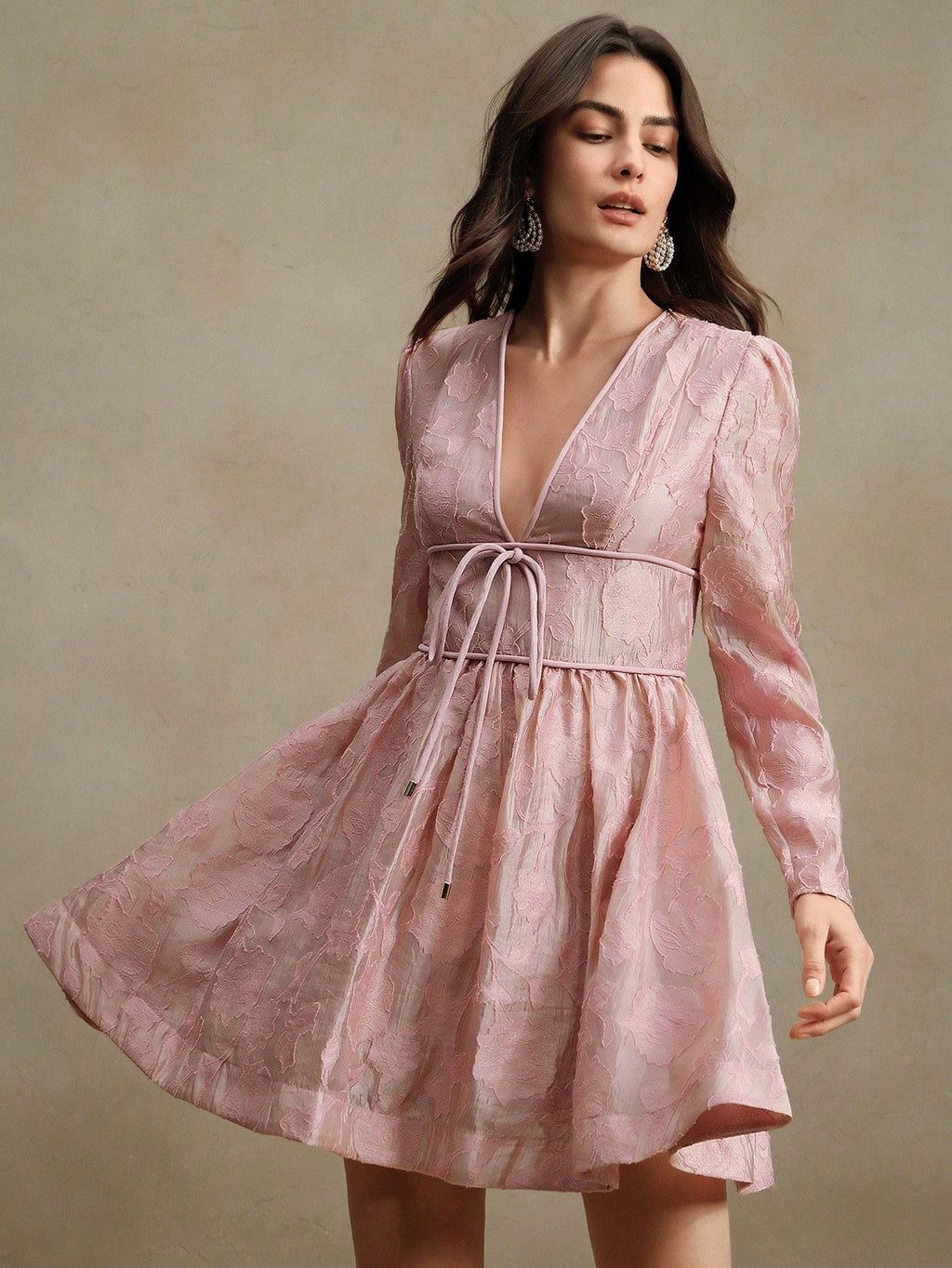 MIU Chiffon Floral Burnout V-Neck High-Low Bowknot Waist Summer Dress, Valentine's Day