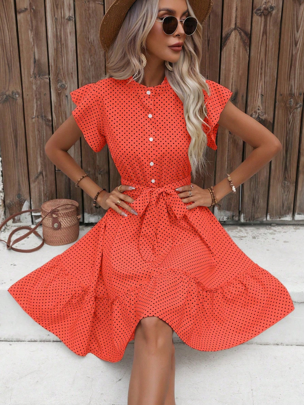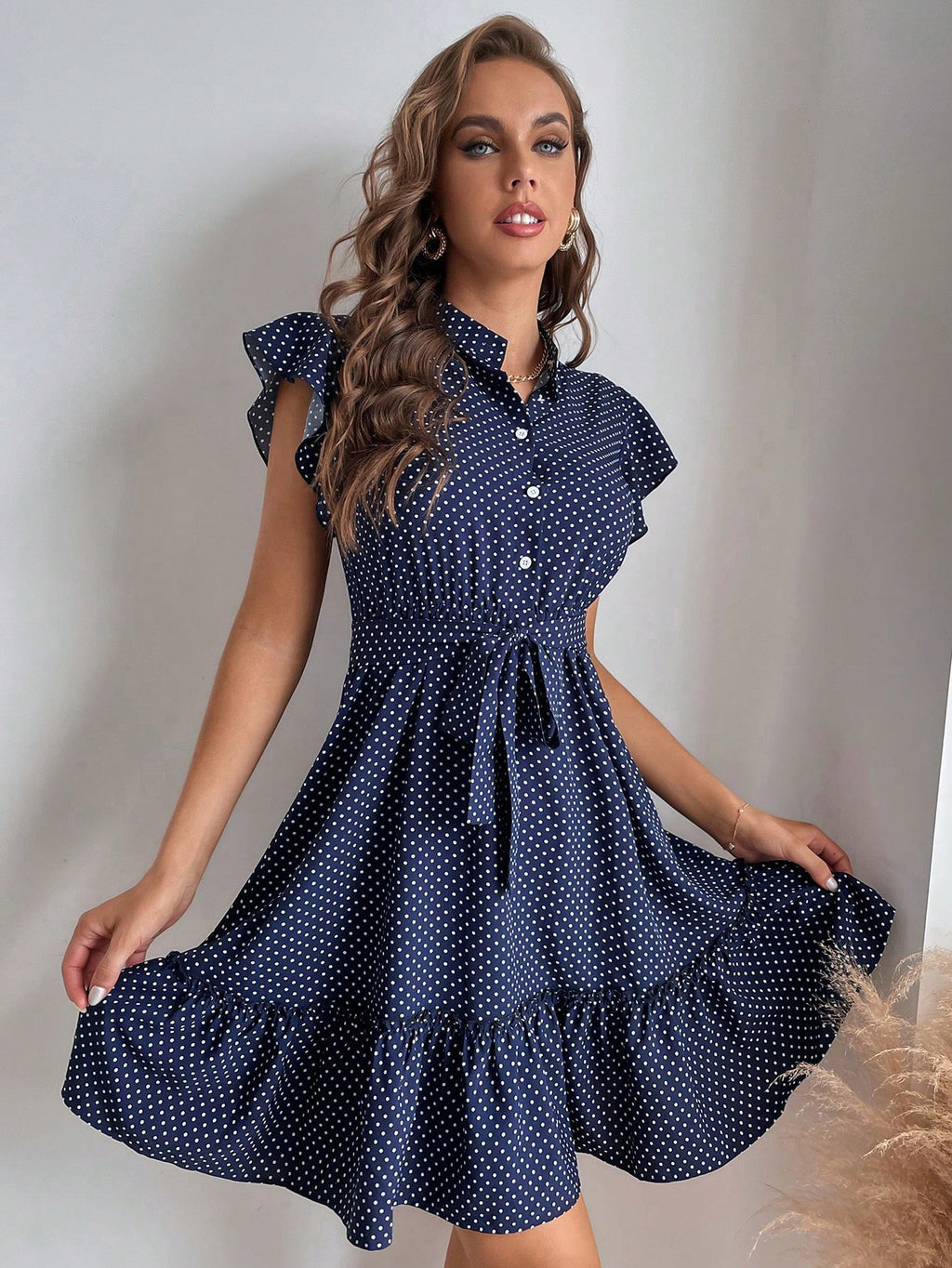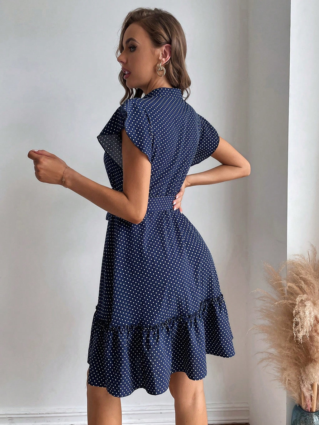 MIU Clasi Polka Dot Print Ruffle Hem Belted Dress