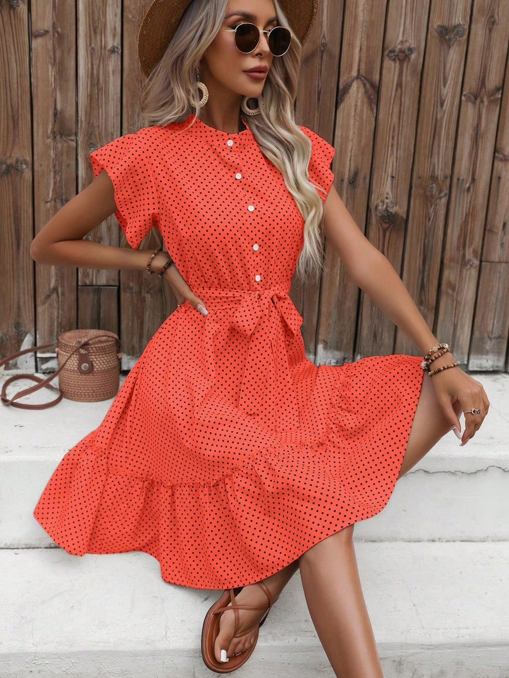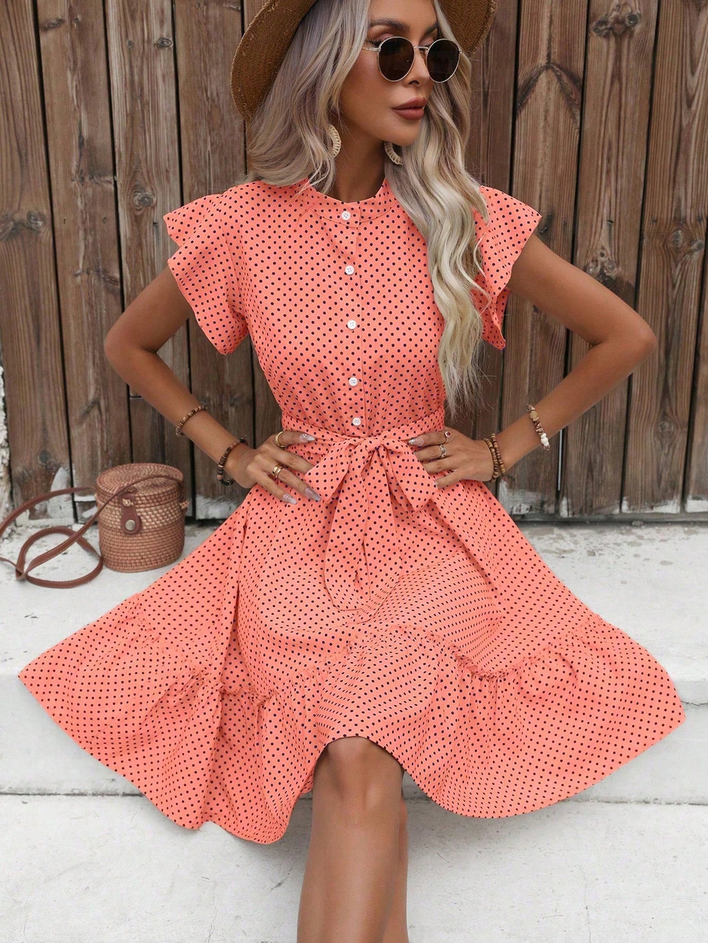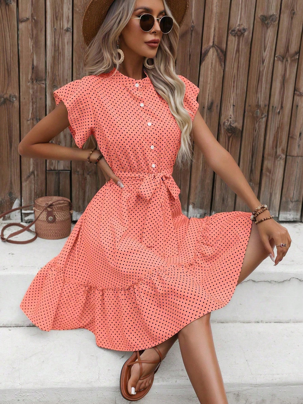 MIU Clasi Polka Dot Print Ruffle Hem Belted Dress