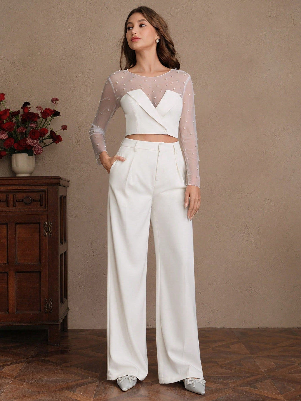 MIU Classic Spring/Summer Formal Date Party Birthday Pearl Decor V-Neck Sheer Top Pants 2 Pieces Set For Business Casual Office Wear