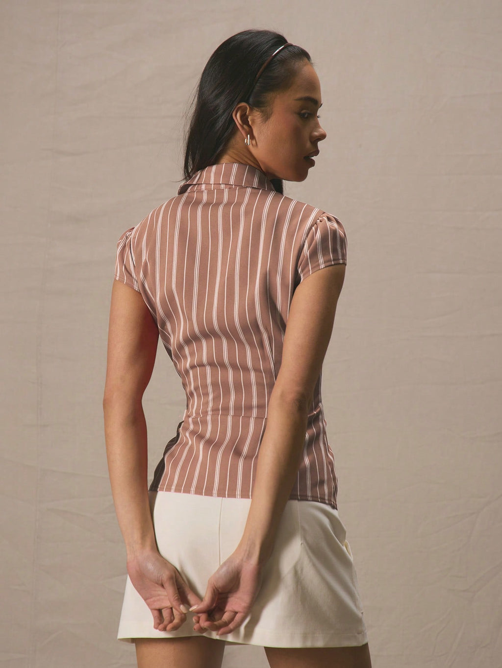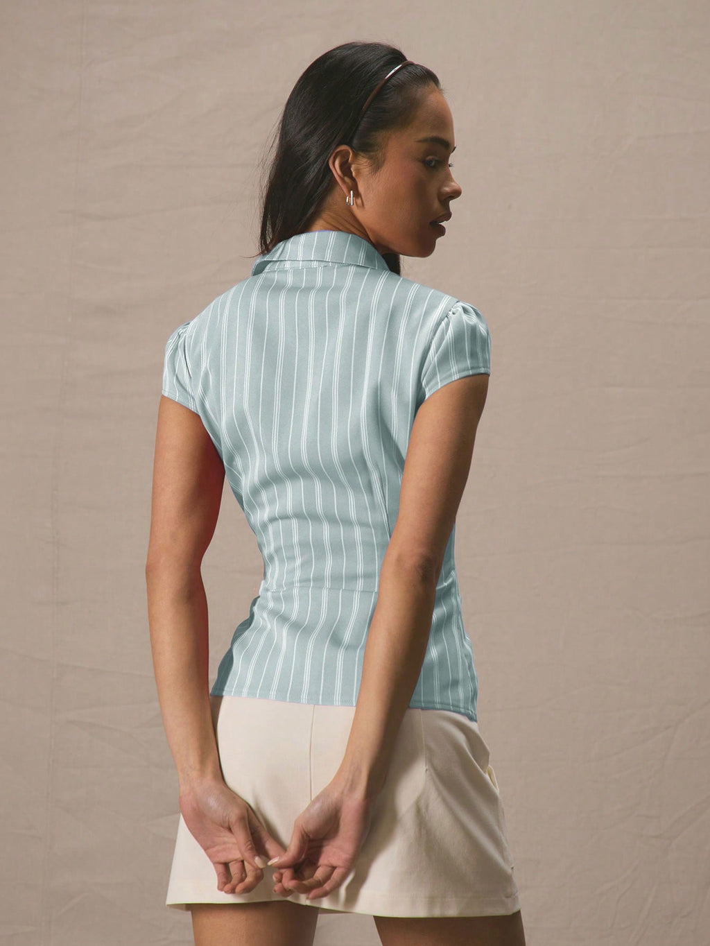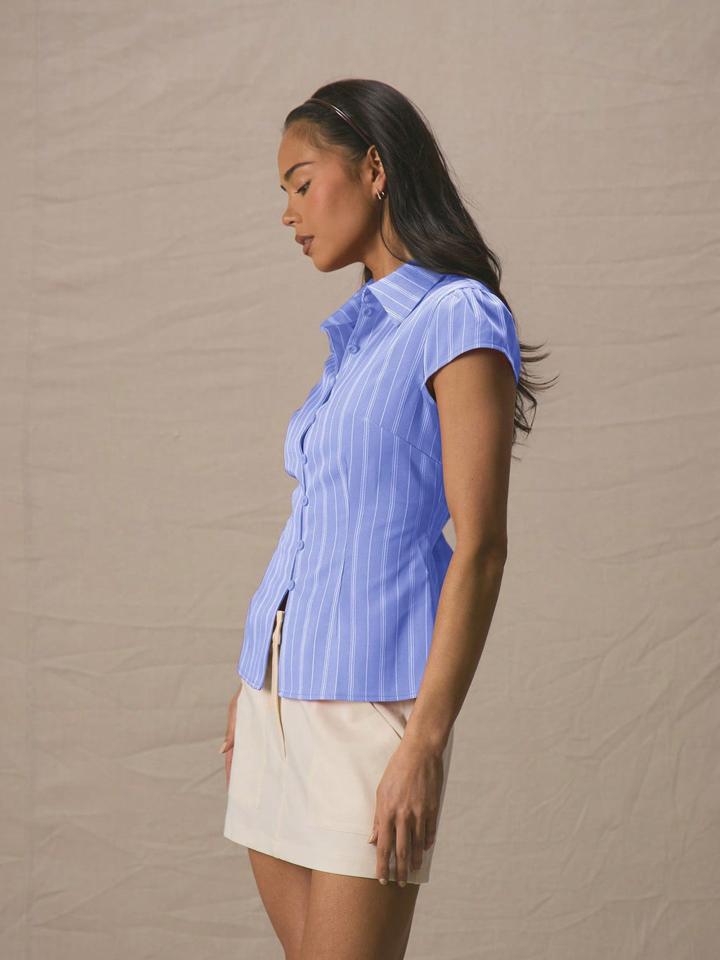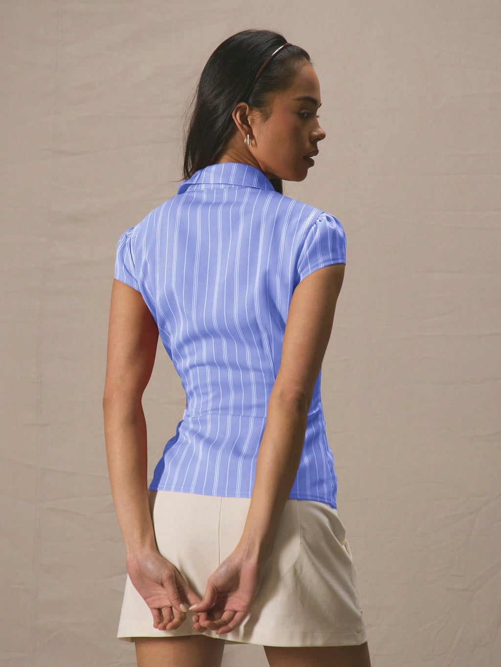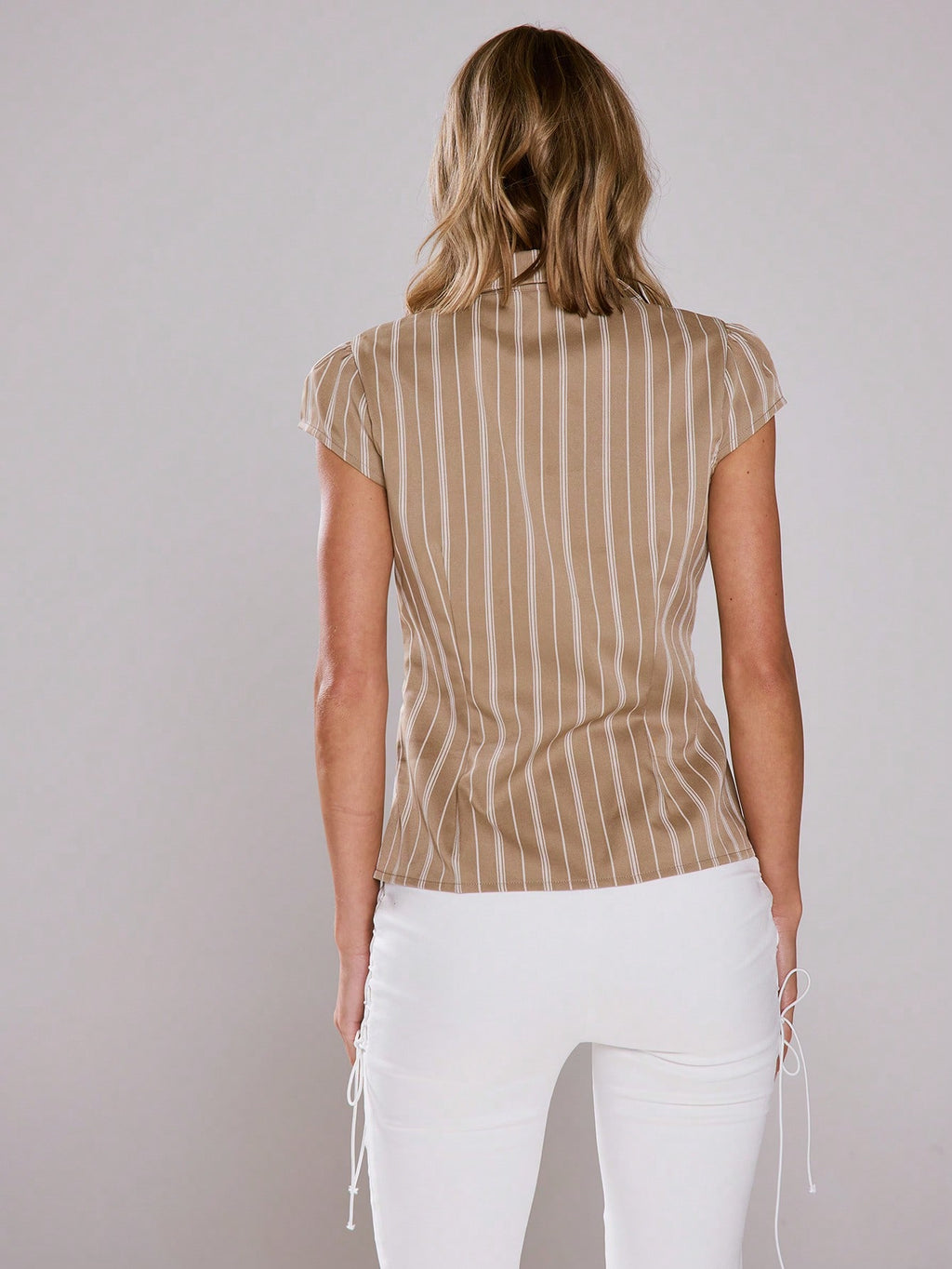 MIU Collared Cinch Waist Fitted Cute Cap Sleeve Shirt For Spring Summer Vacation Stripe Al Fresco Work Everyday Casual Holiday Airport Festival
