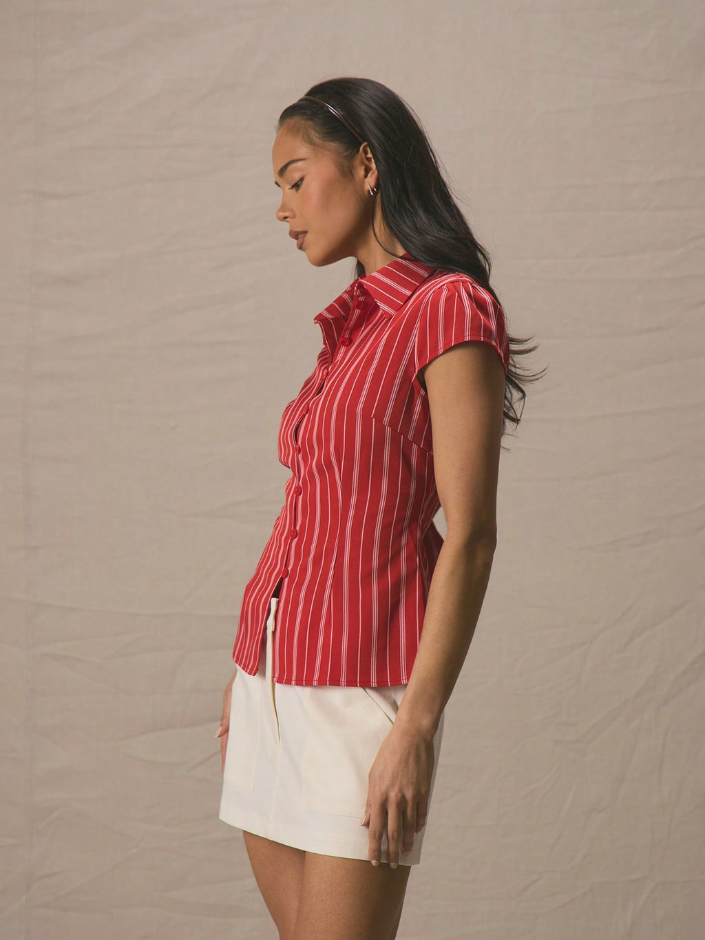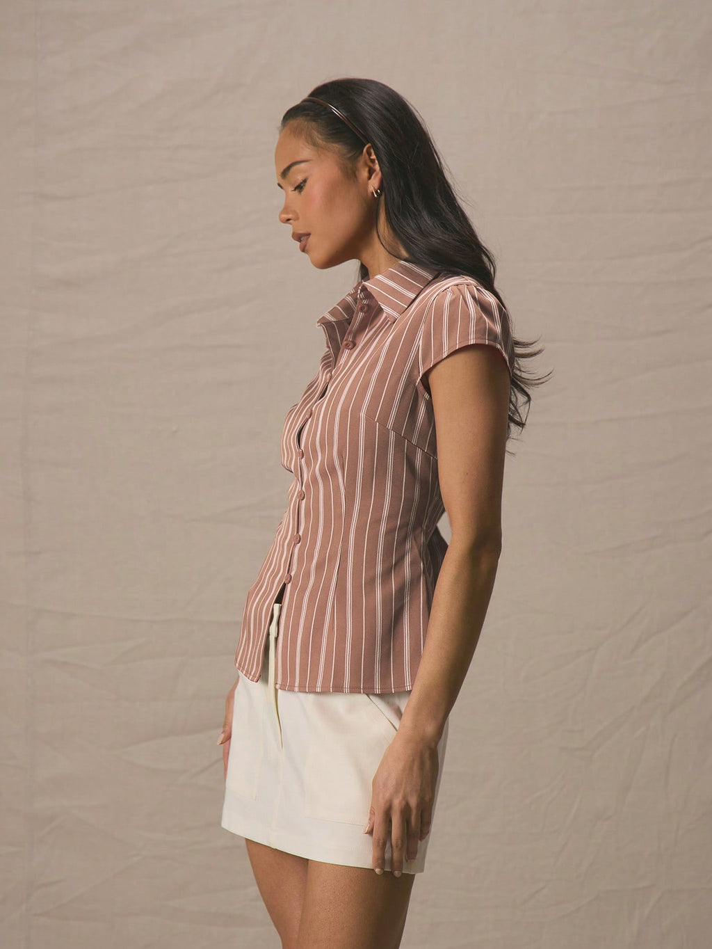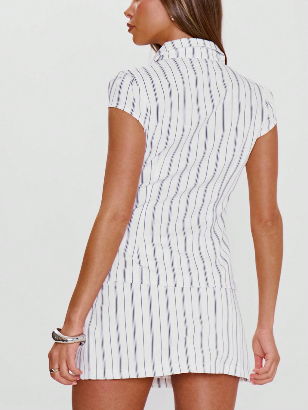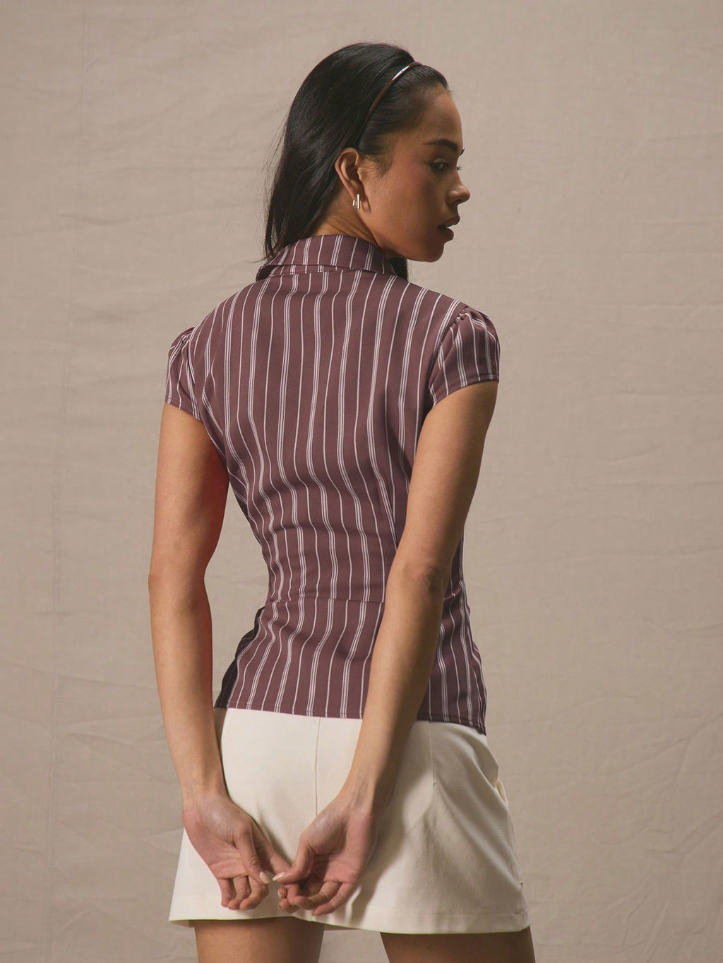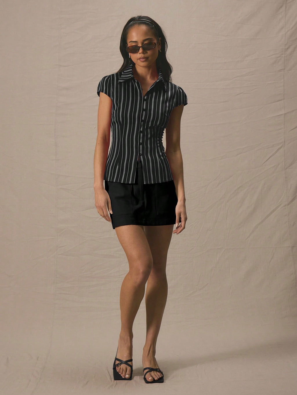 MIU Collared Cinch Waist Fitted Cute Cap Sleeve Shirt For Spring Summer Vacation Stripe Al Fresco Work Everyday Casual Holiday Airport Festival