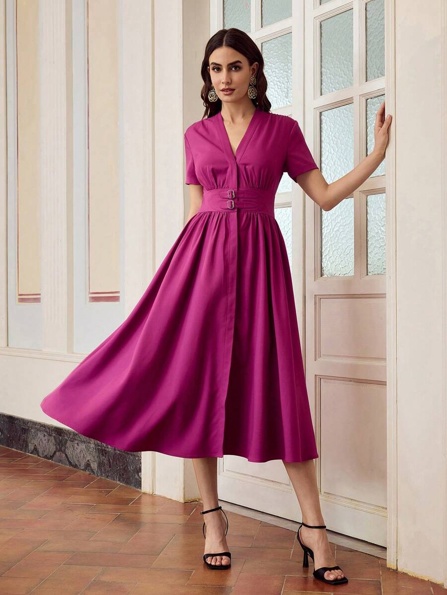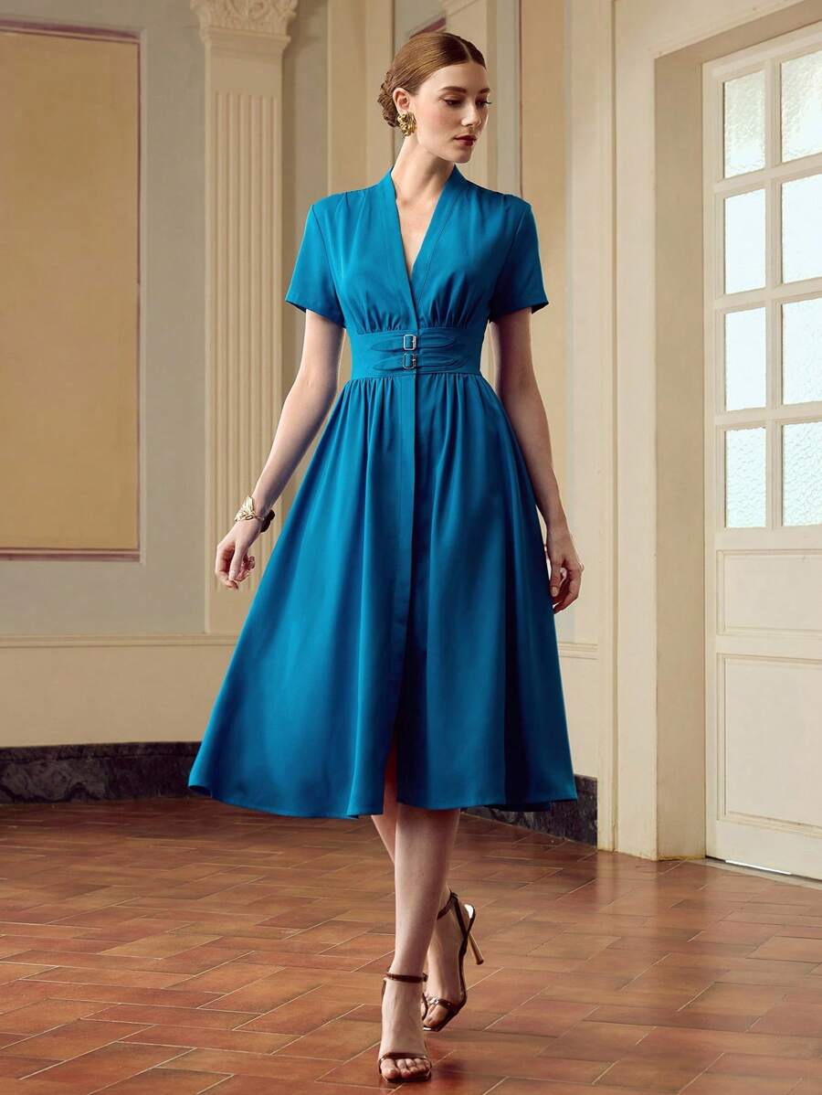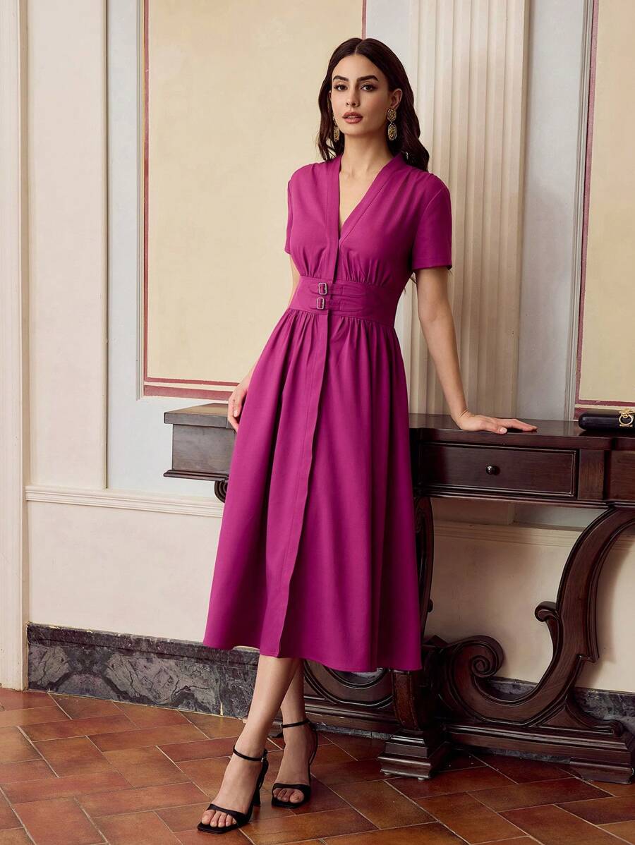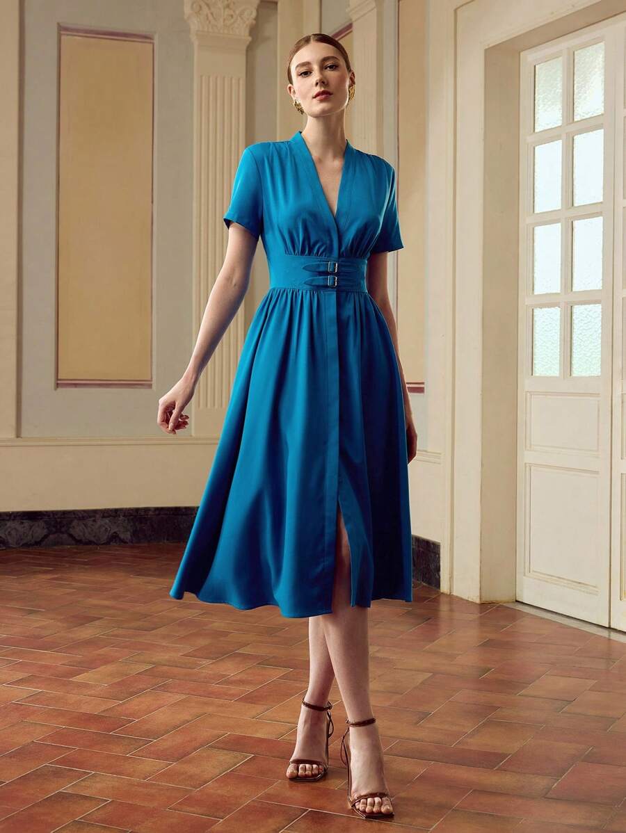 MIU Deep V-Neck Metal Buckle Waist Belt Decor Short Sleeve Midi Dress