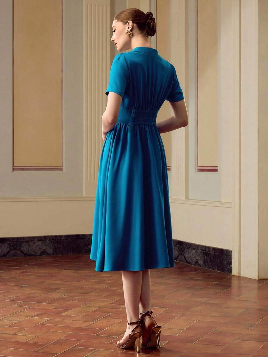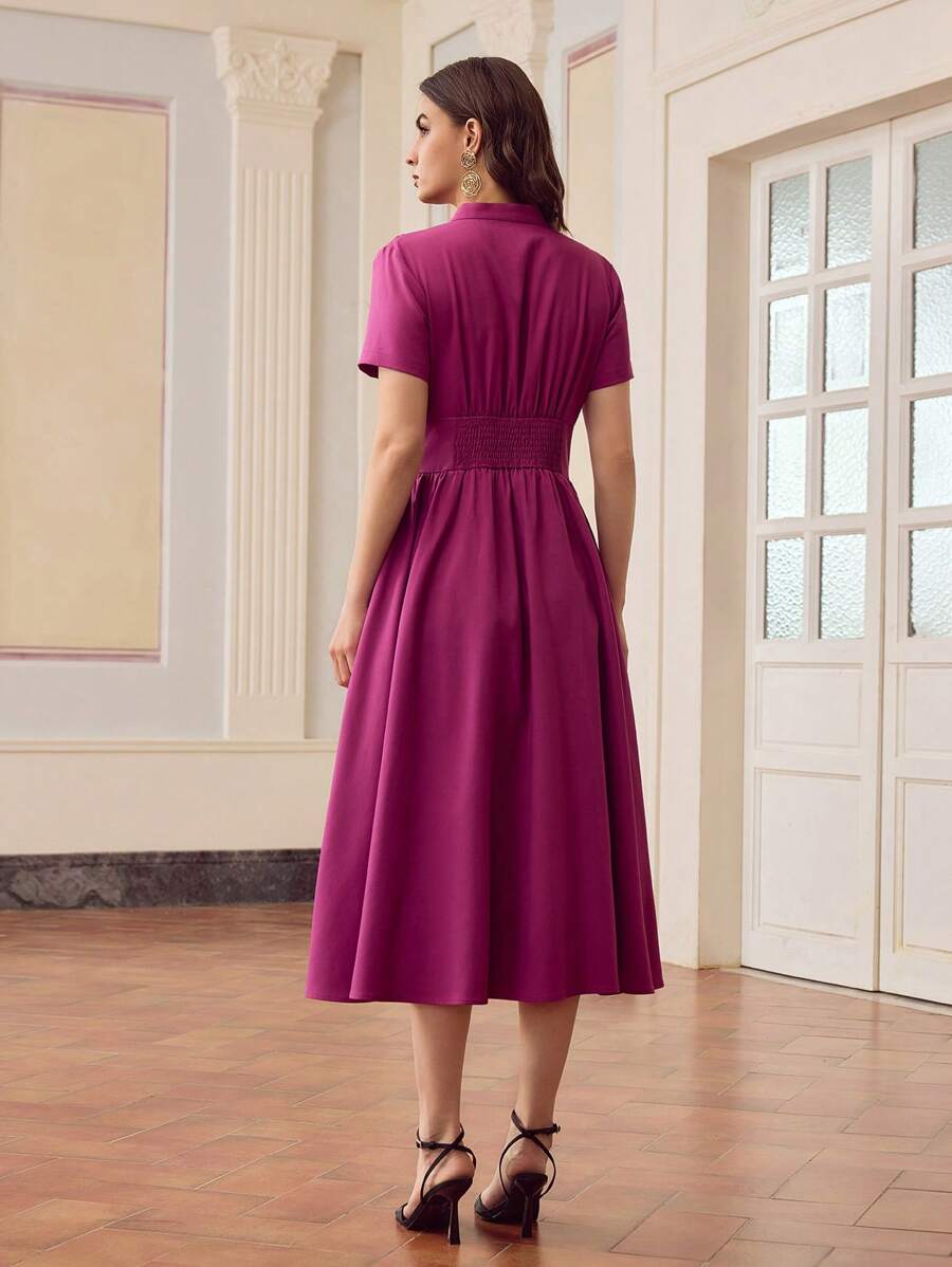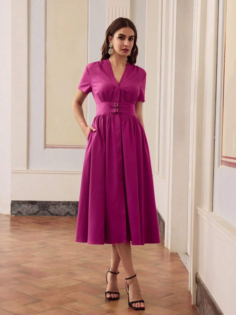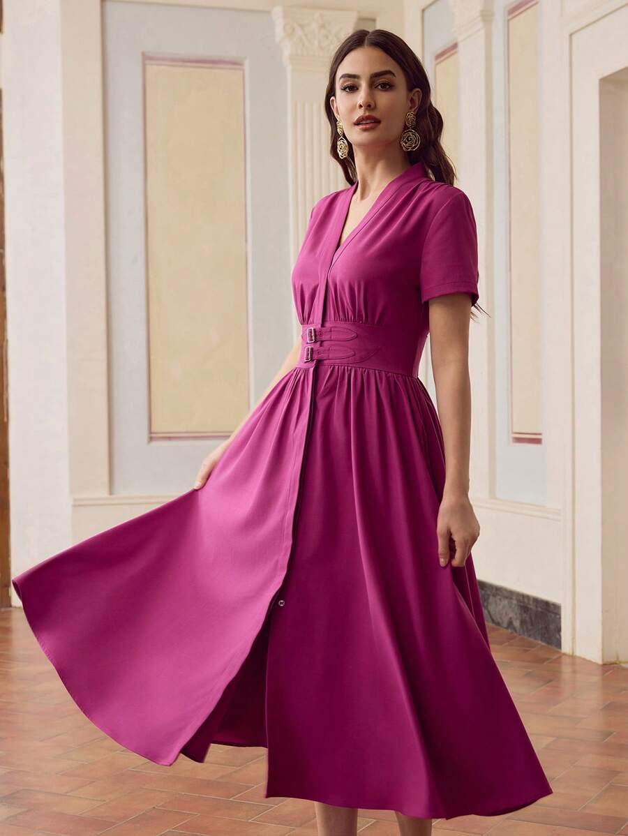 MIU Deep V-Neck Metal Buckle Waist Belt Decor Short Sleeve Midi Dress