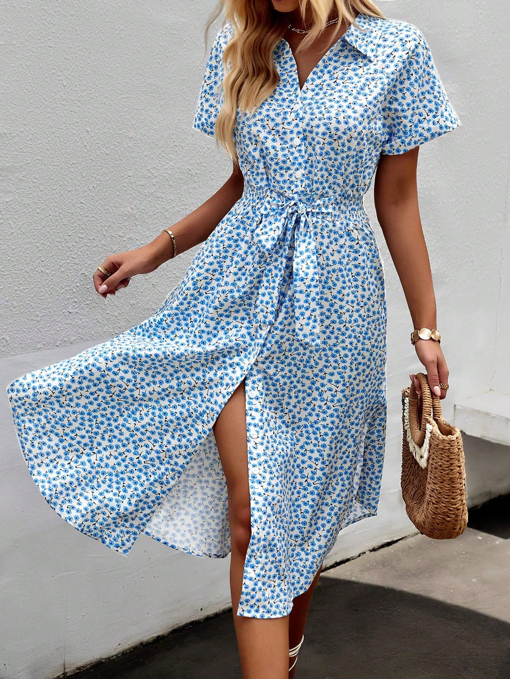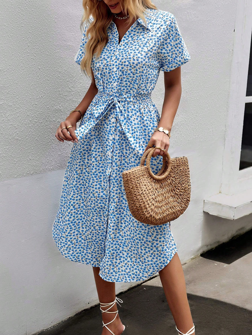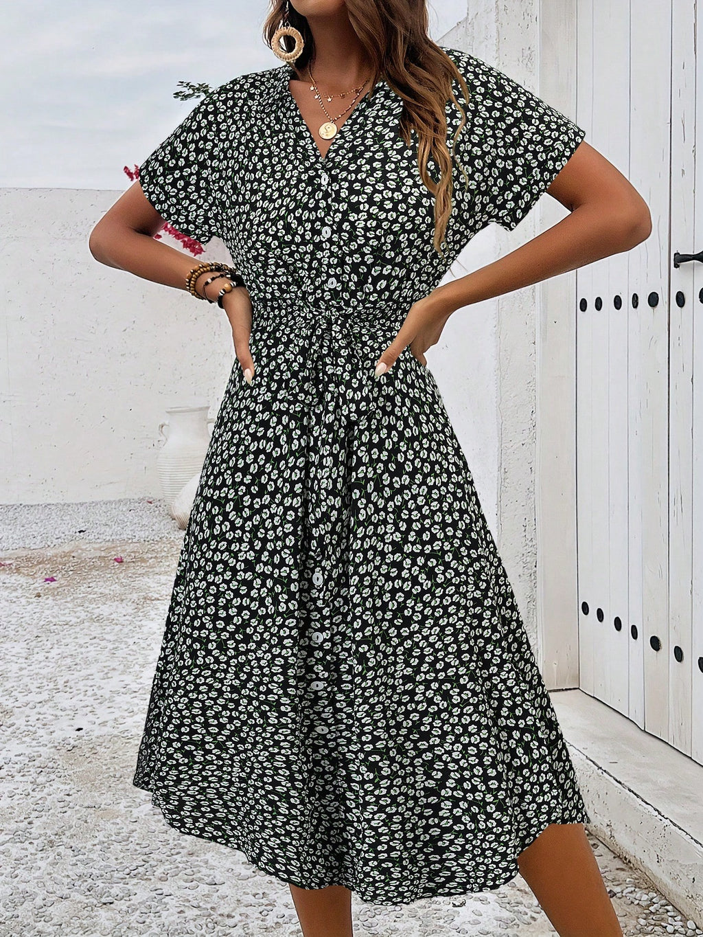 MIU Ditsy Floral Tie Front Button Through Dress Maxi Vacation Beach Outfits Women