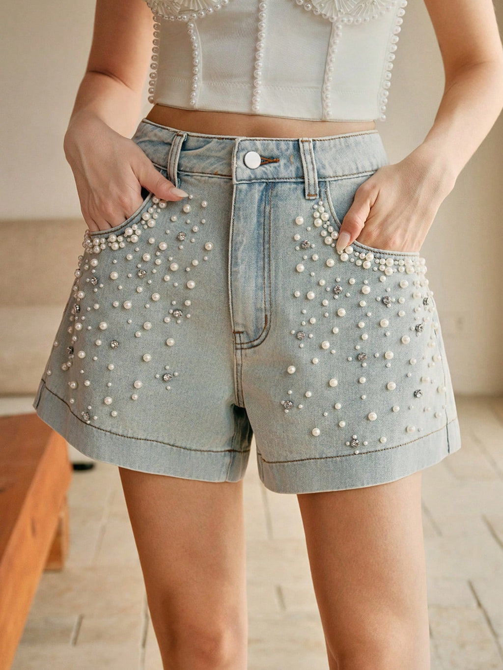 MIU Elegant Beaded Oversized Versatile Ladies' Denim Shorts