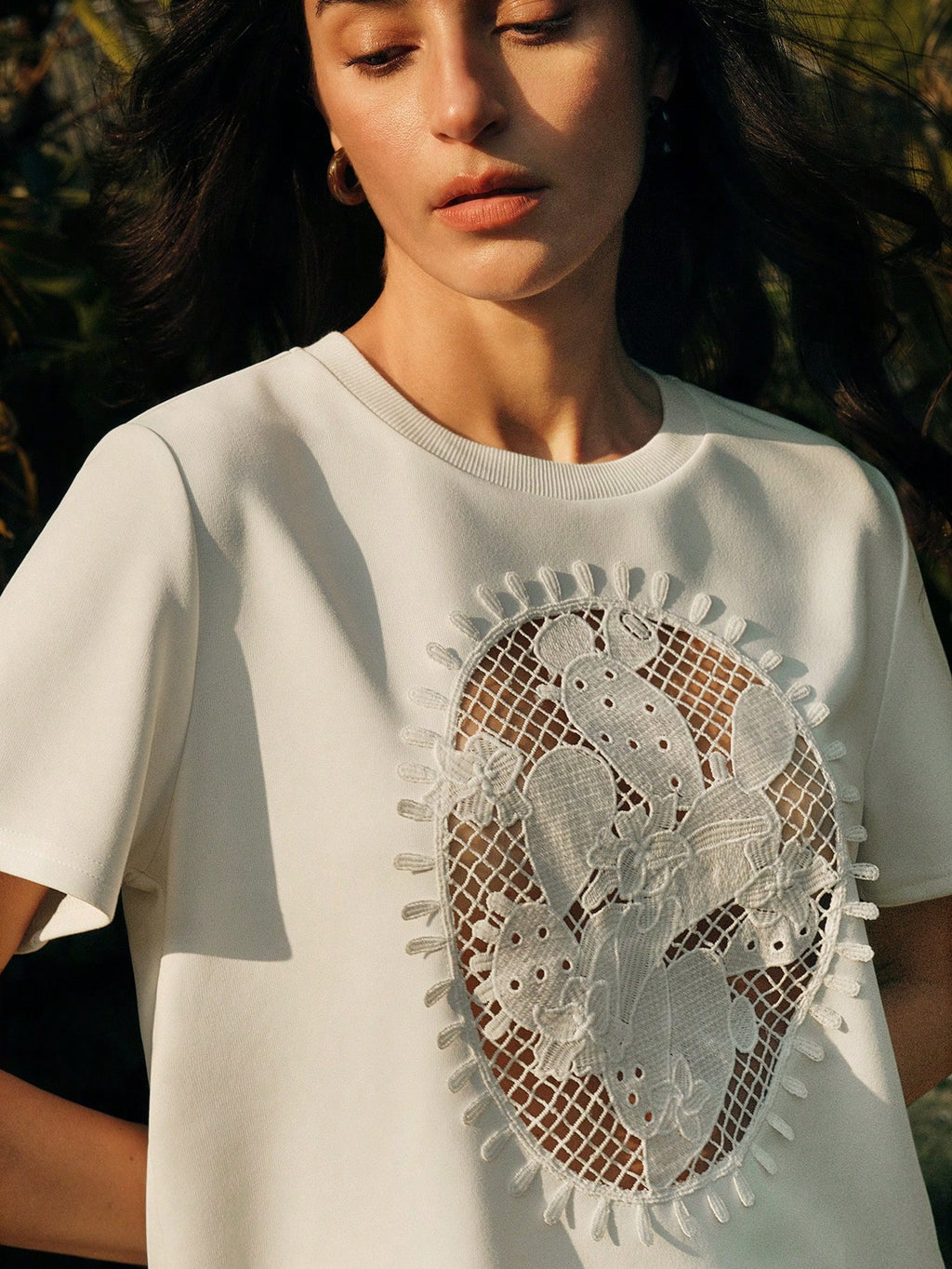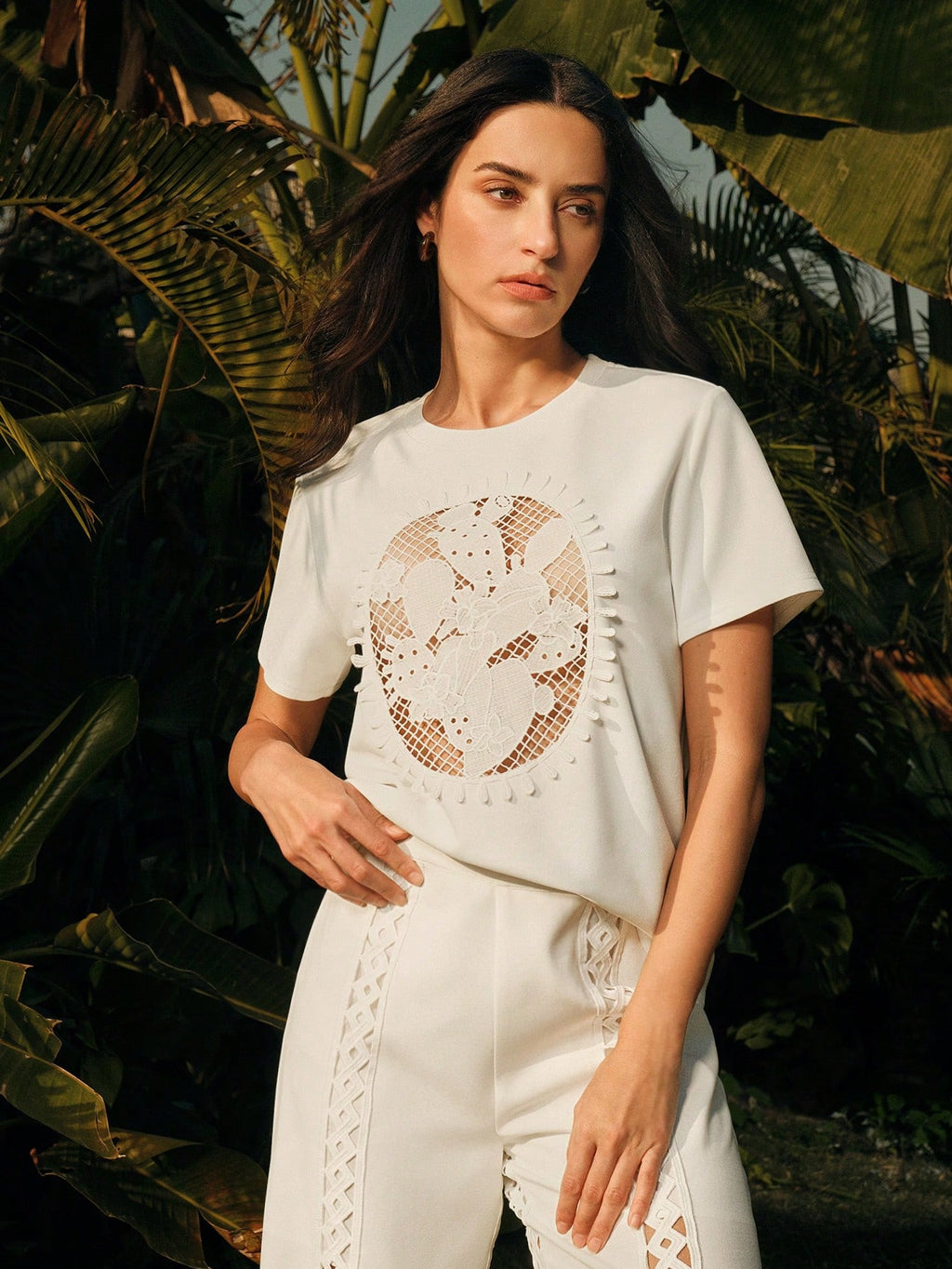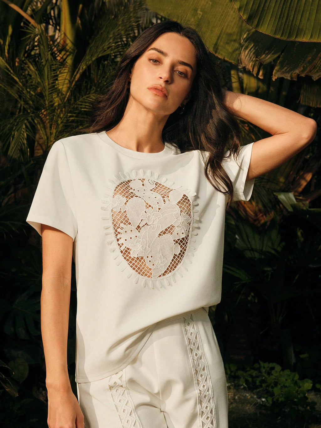 MIU Elegant Boho Casual Beach Women Hollow Floral Lace Patchwork Round Neck Casual T-Shirt, Suitable For Spring