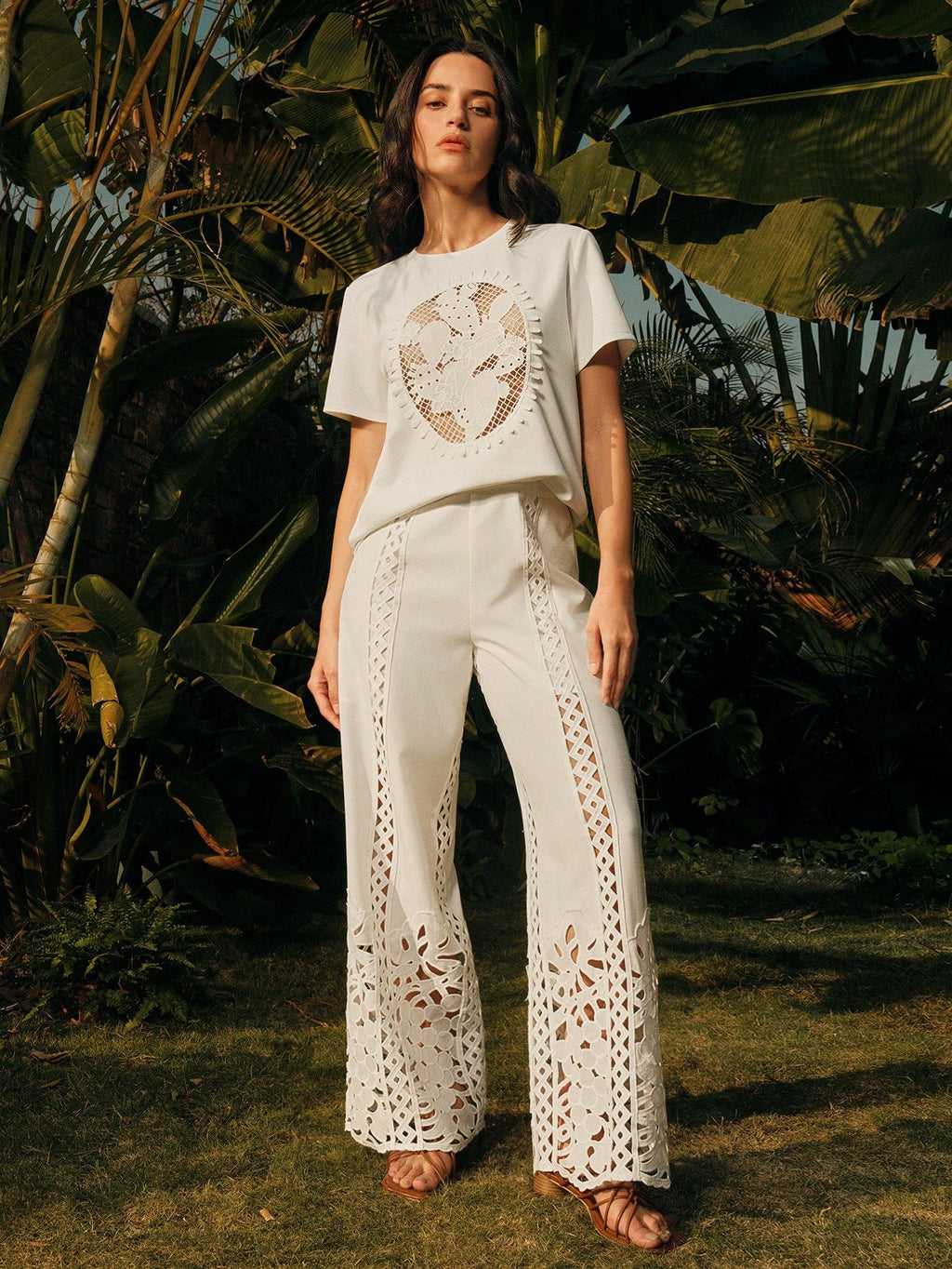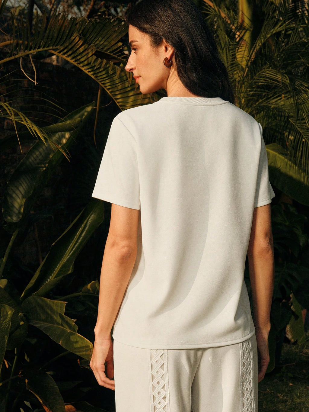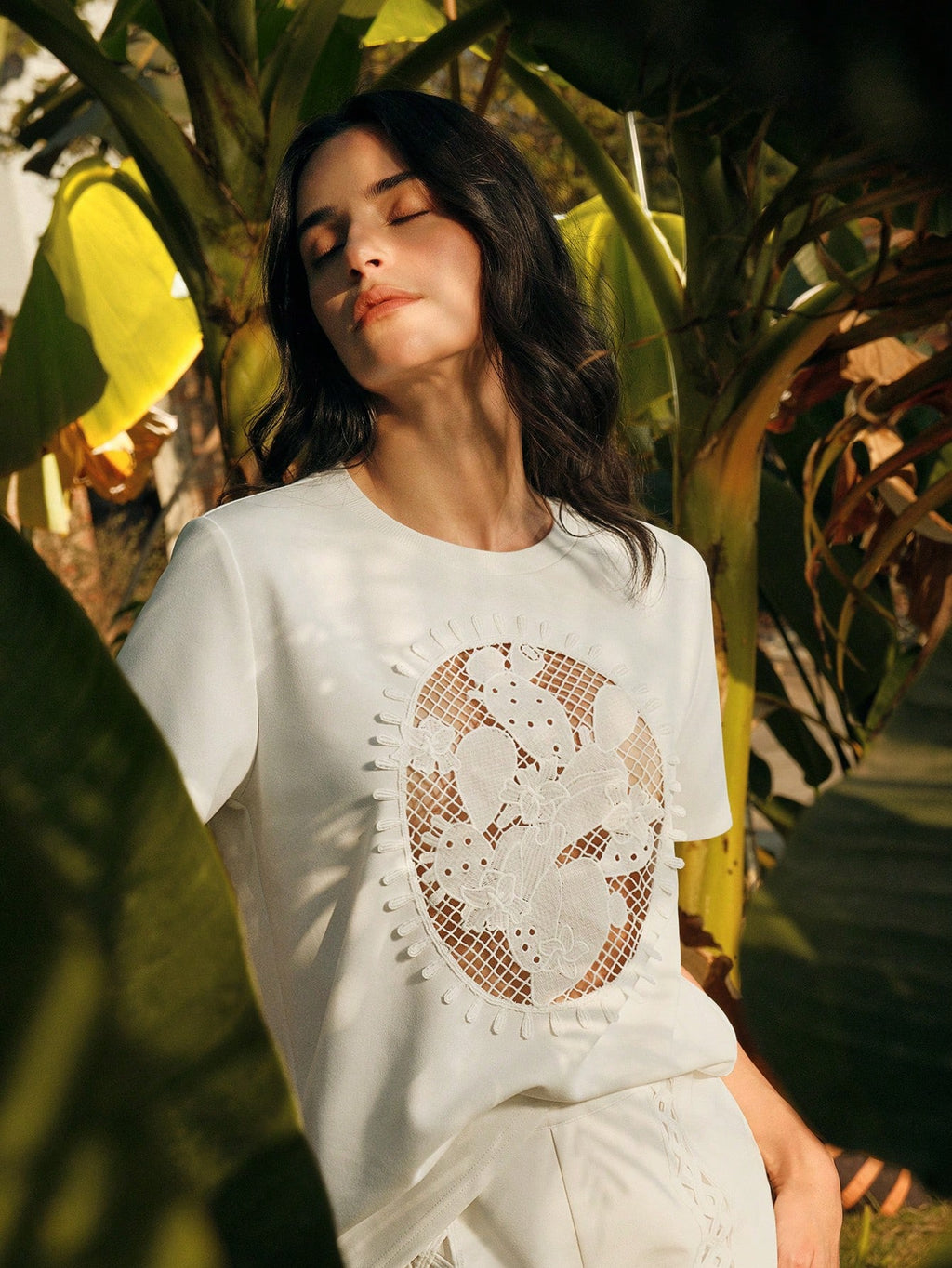 MIU Elegant Boho Casual Beach Women Hollow Floral Lace Patchwork Round Neck Casual T-Shirt, Suitable For Spring