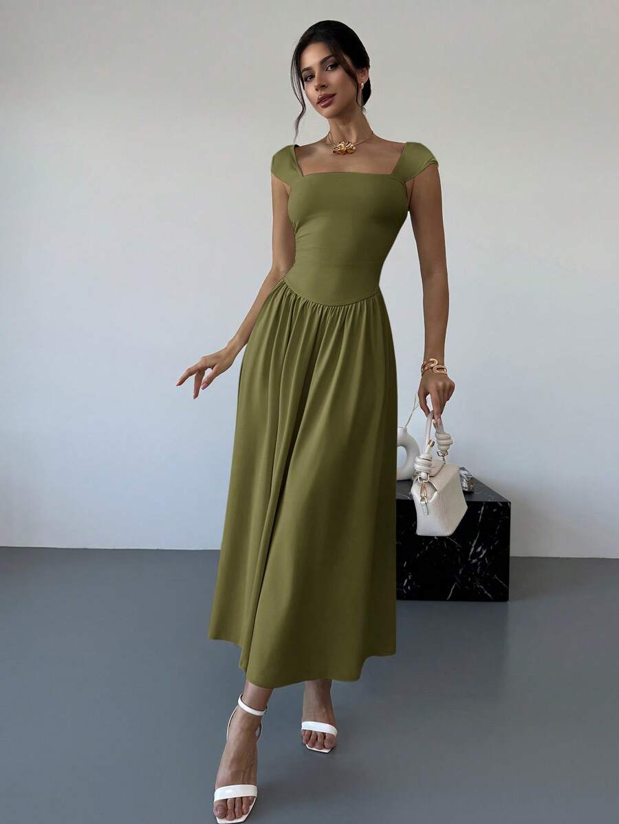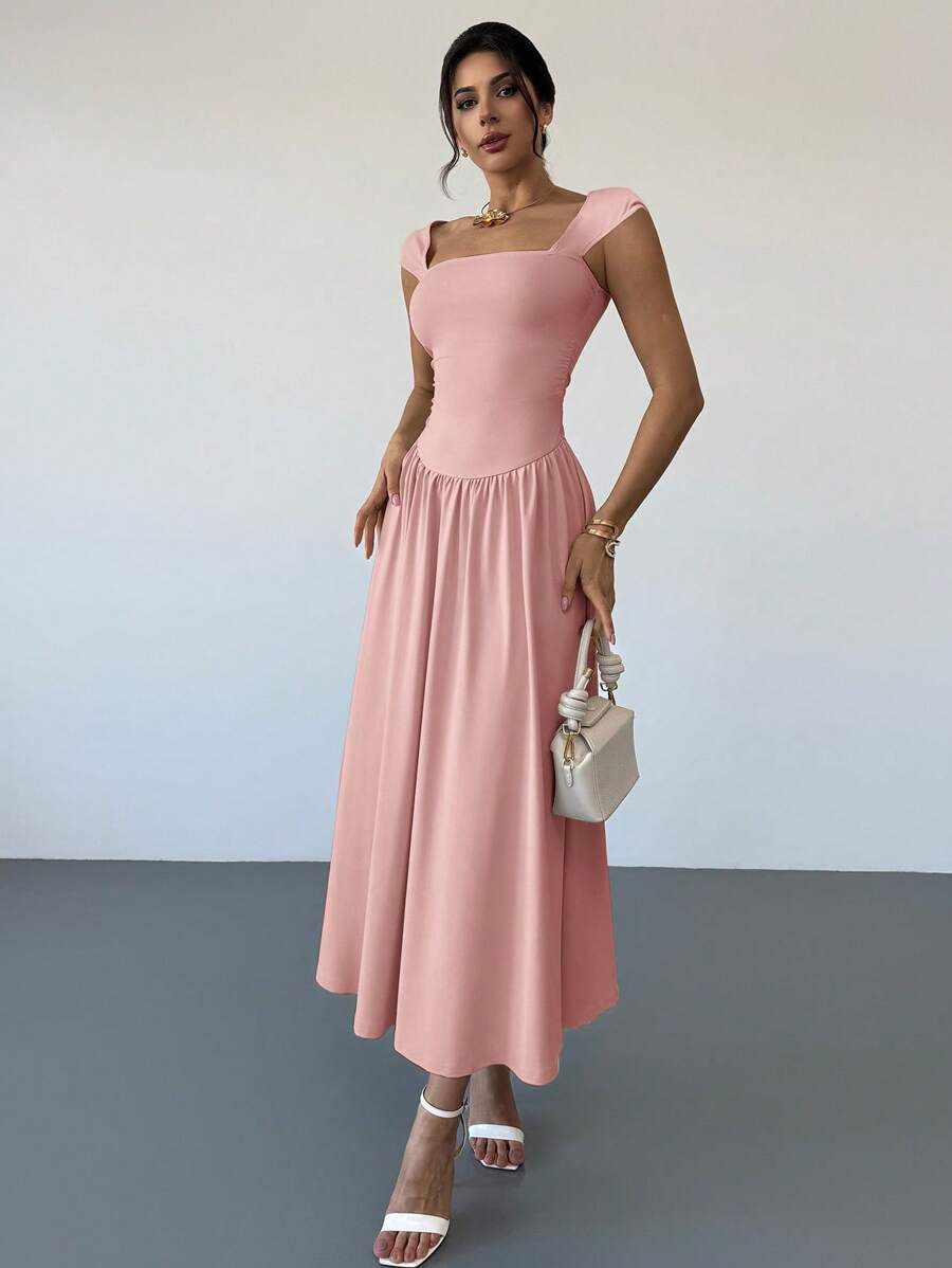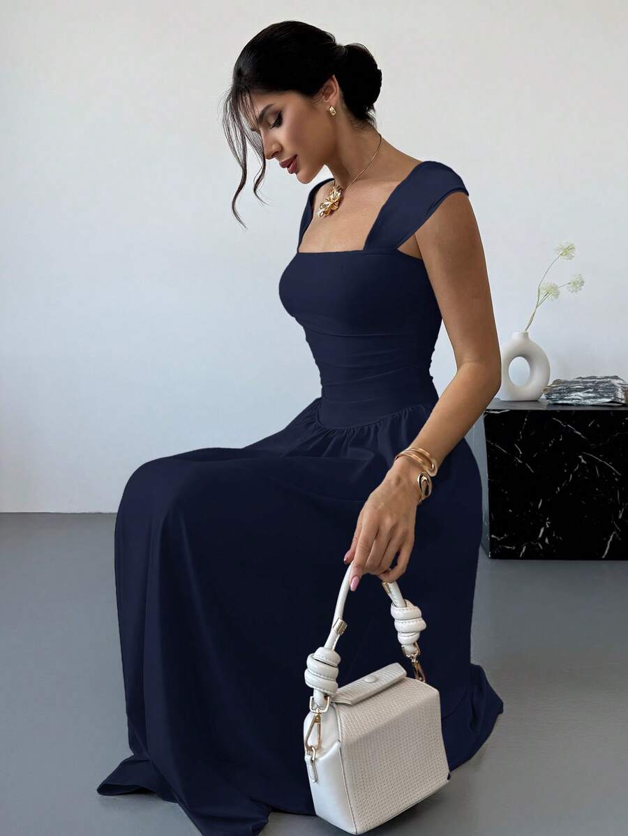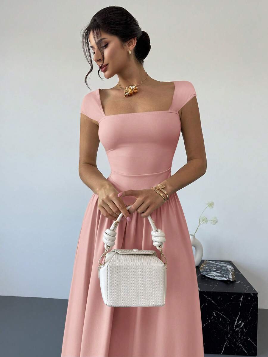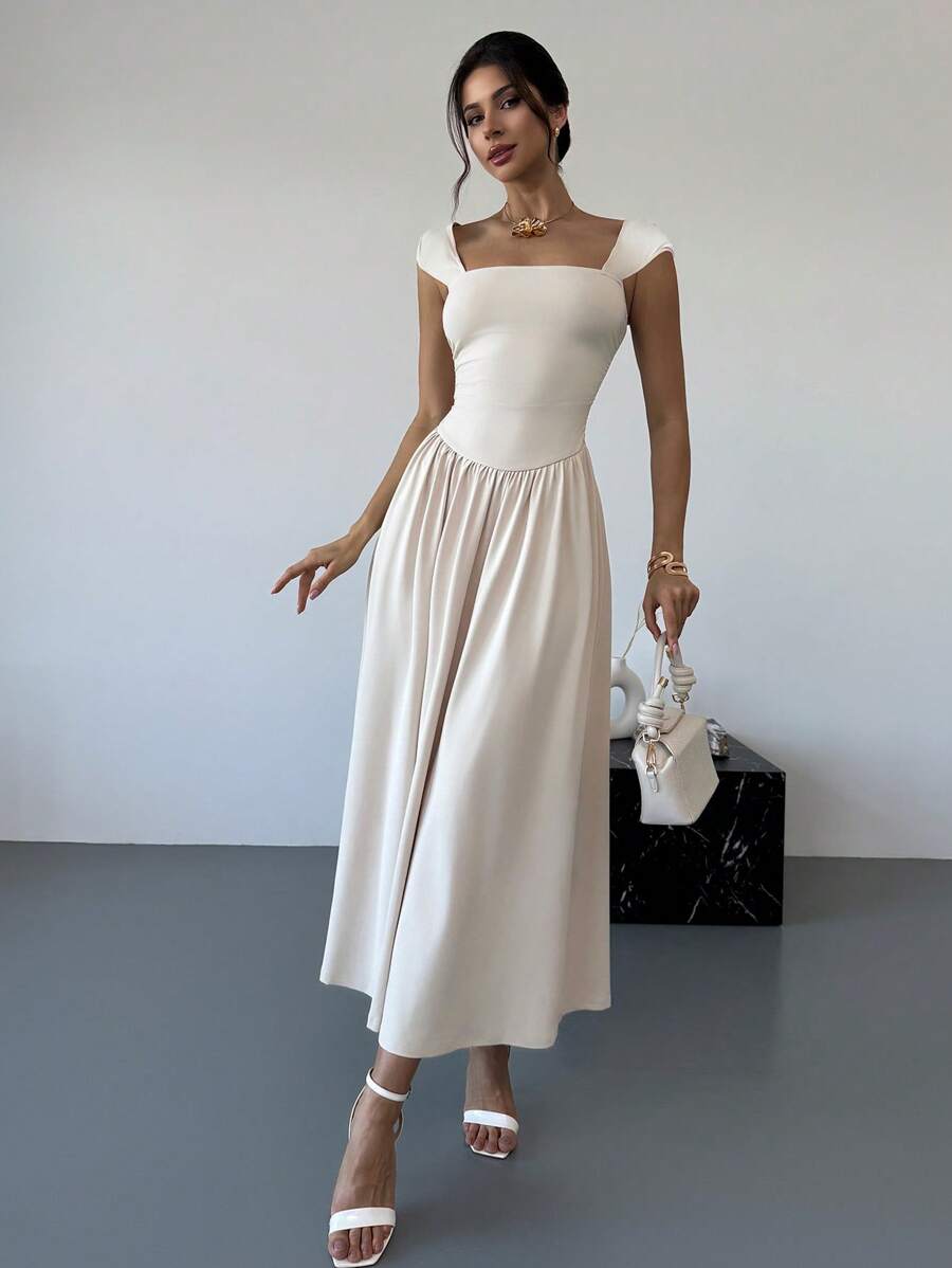 MIU Elegant Bowknot Tie Waist Ruffled Square Neck Sleeveless A-Line Maxi Dress,Apricot,Suitable For Daily Date, Spring/Summer
