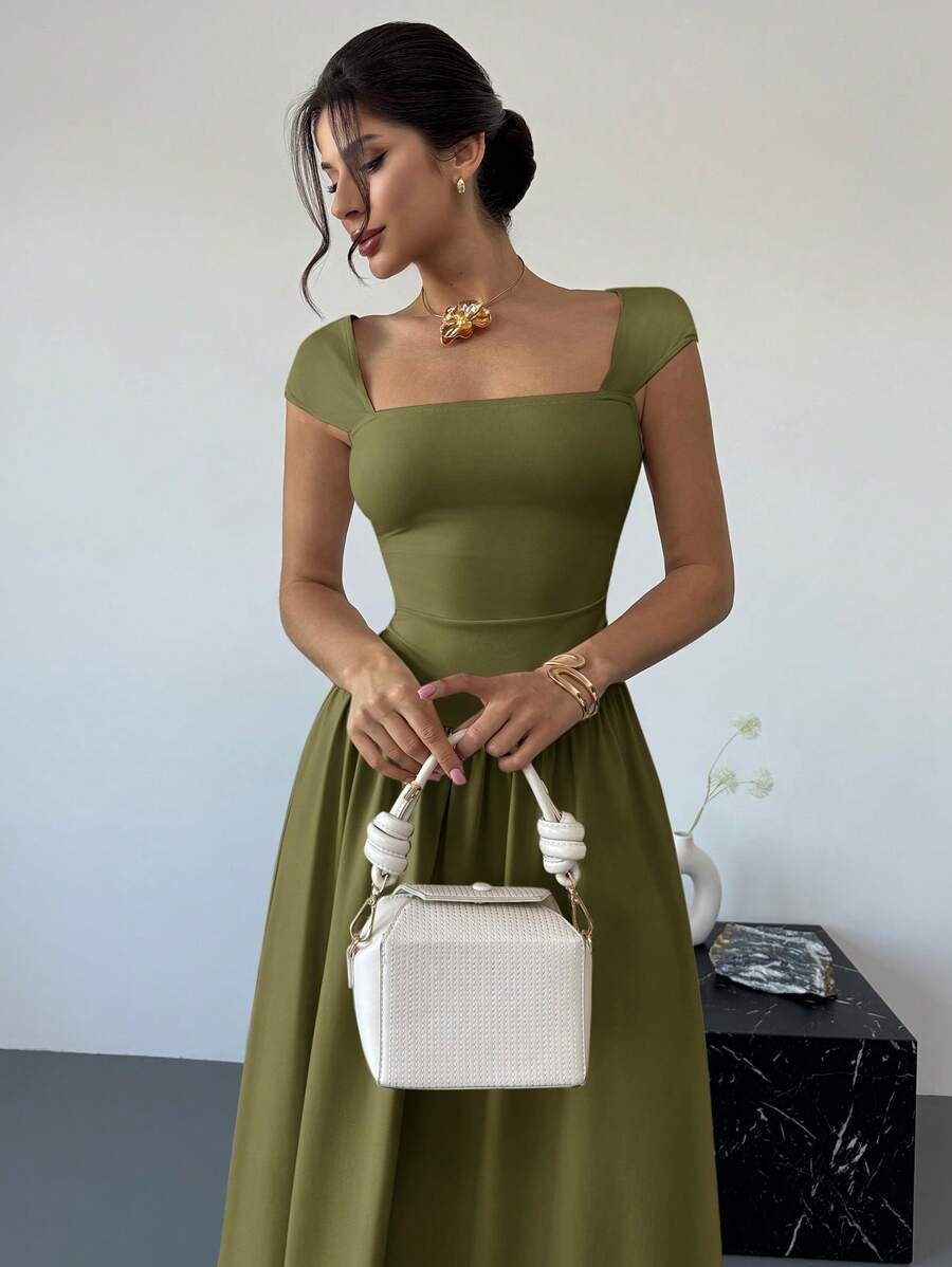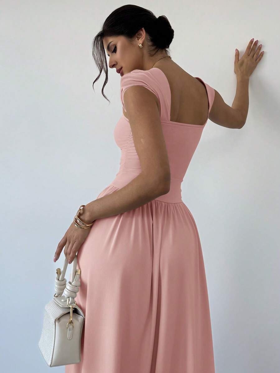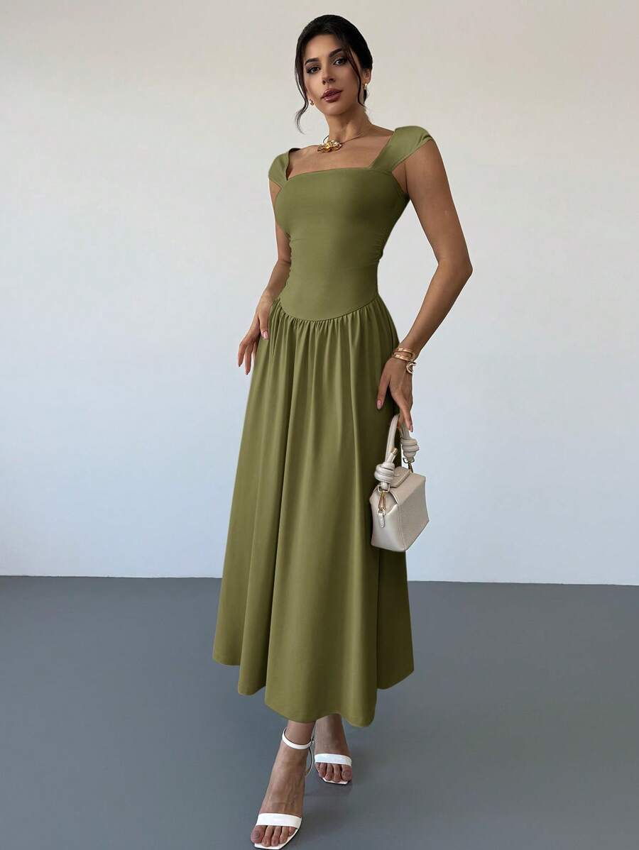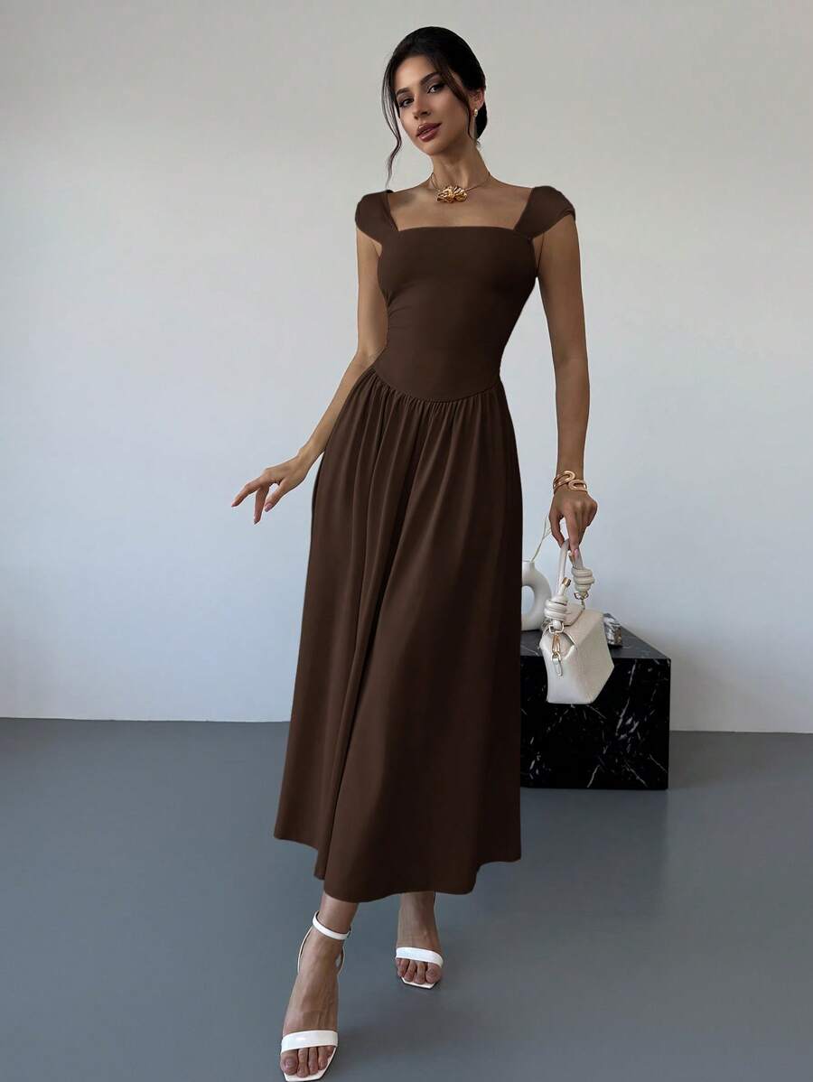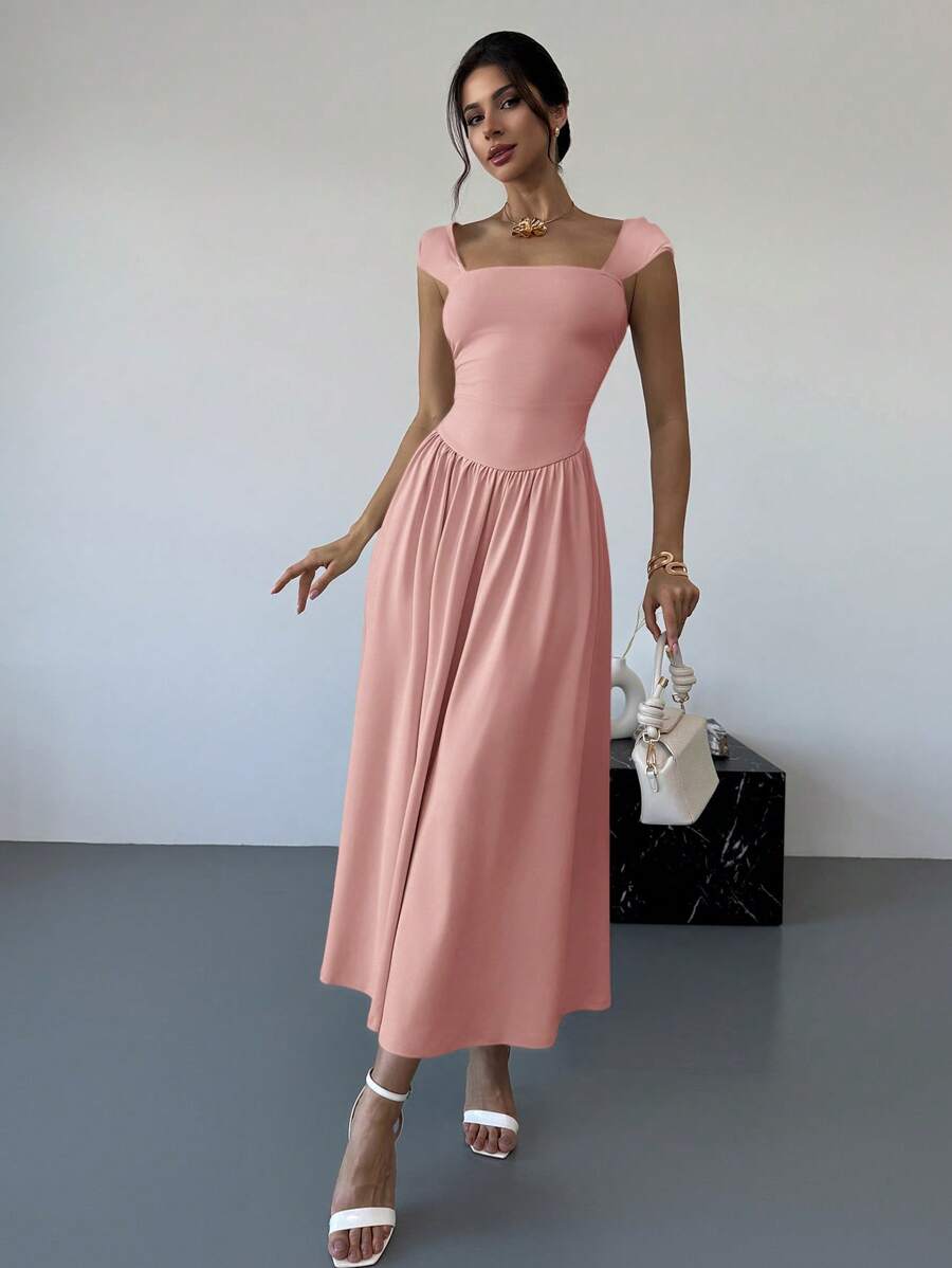 MIU Elegant Bowknot Tie Waist Ruffled Square Neck Sleeveless A-Line Maxi Dress,Apricot,Suitable For Daily Date, Spring/Summer