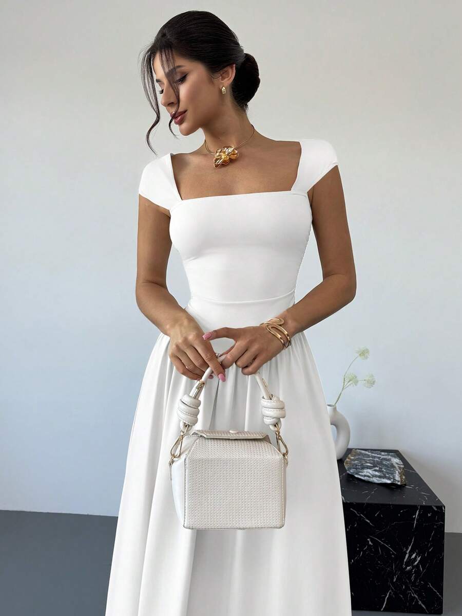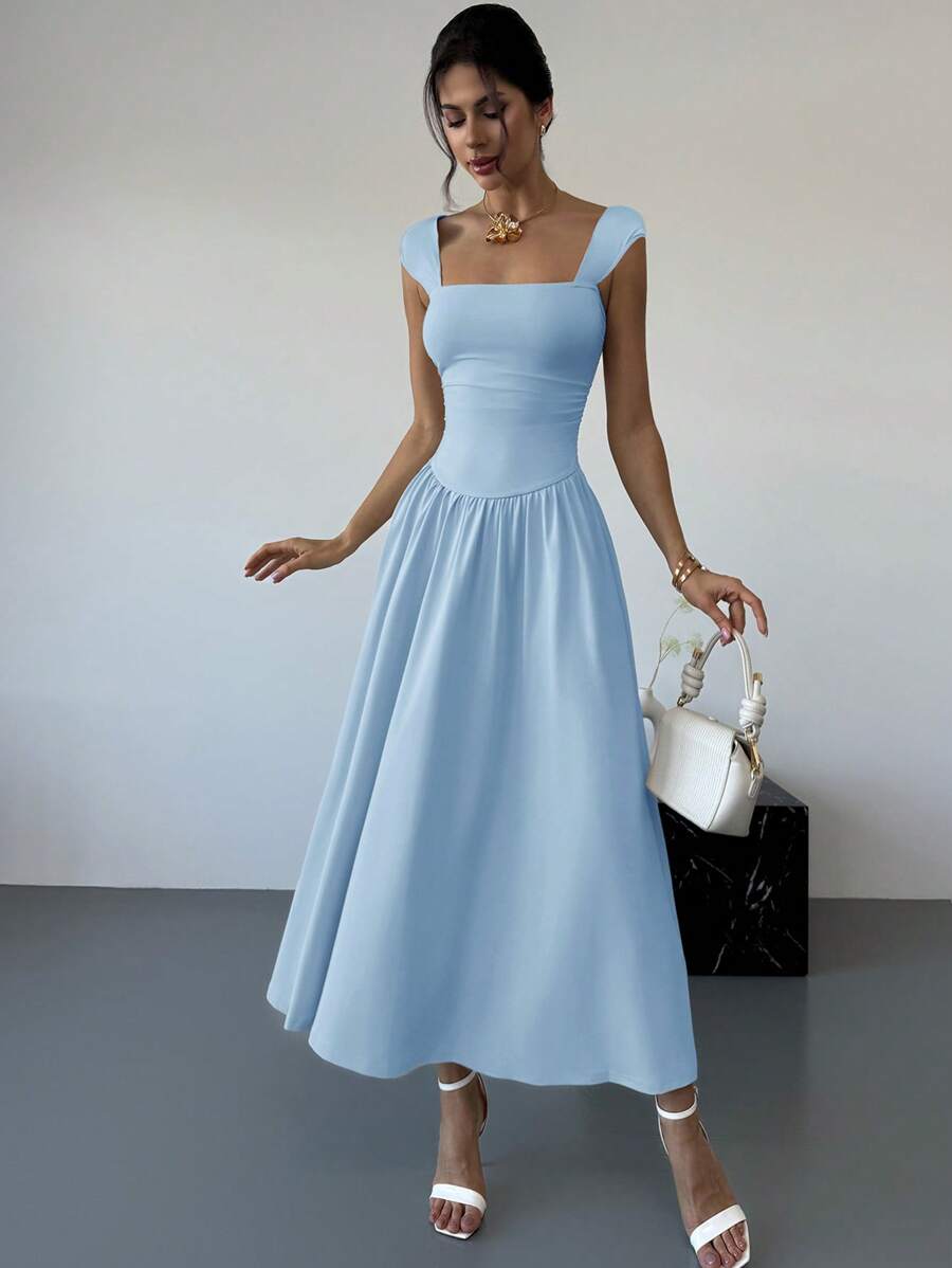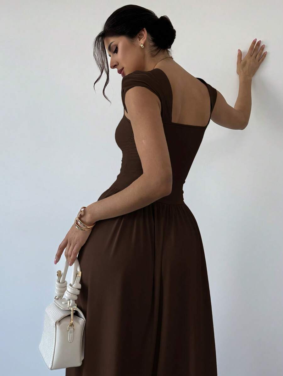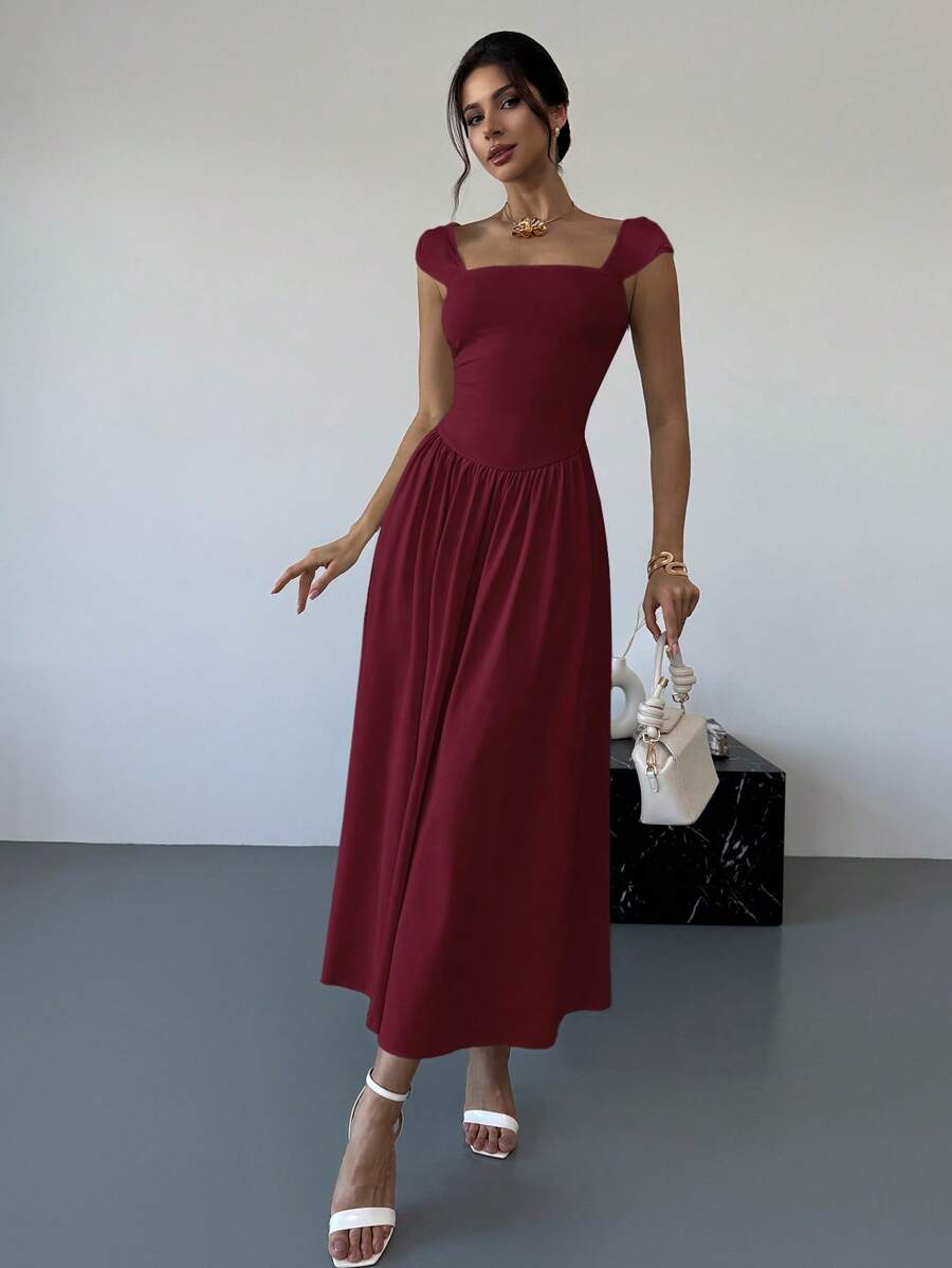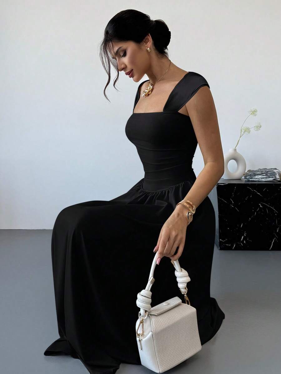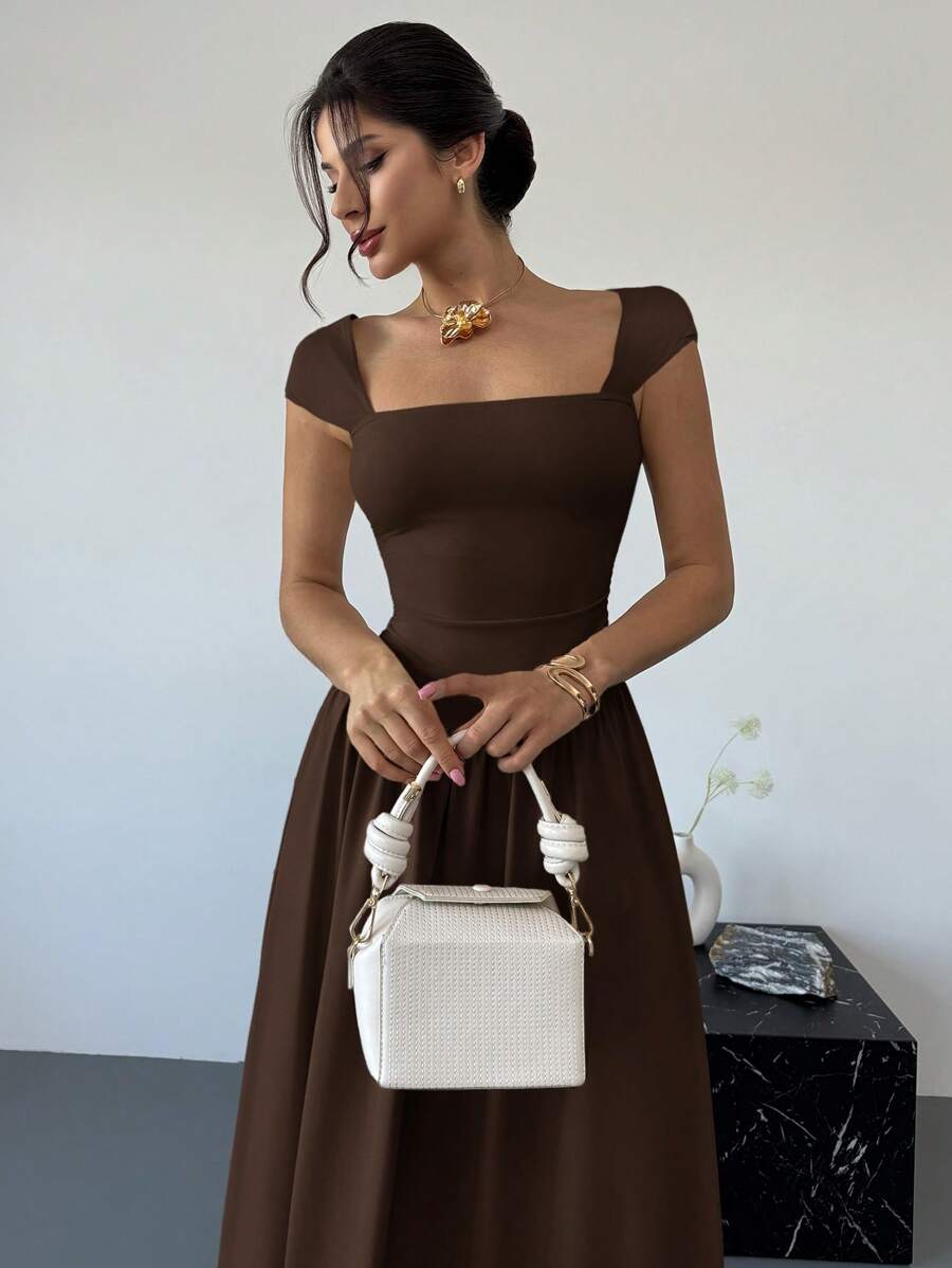 MIU Elegant Bowknot Tie Waist Ruffled Square Neck Sleeveless A-Line Maxi Dress,Apricot,Suitable For Daily Date, Spring/Summer