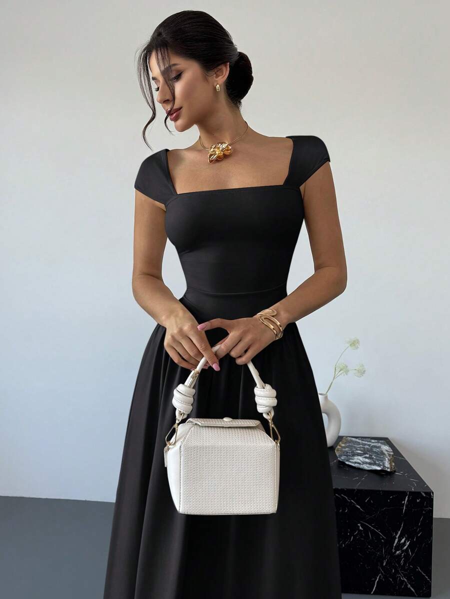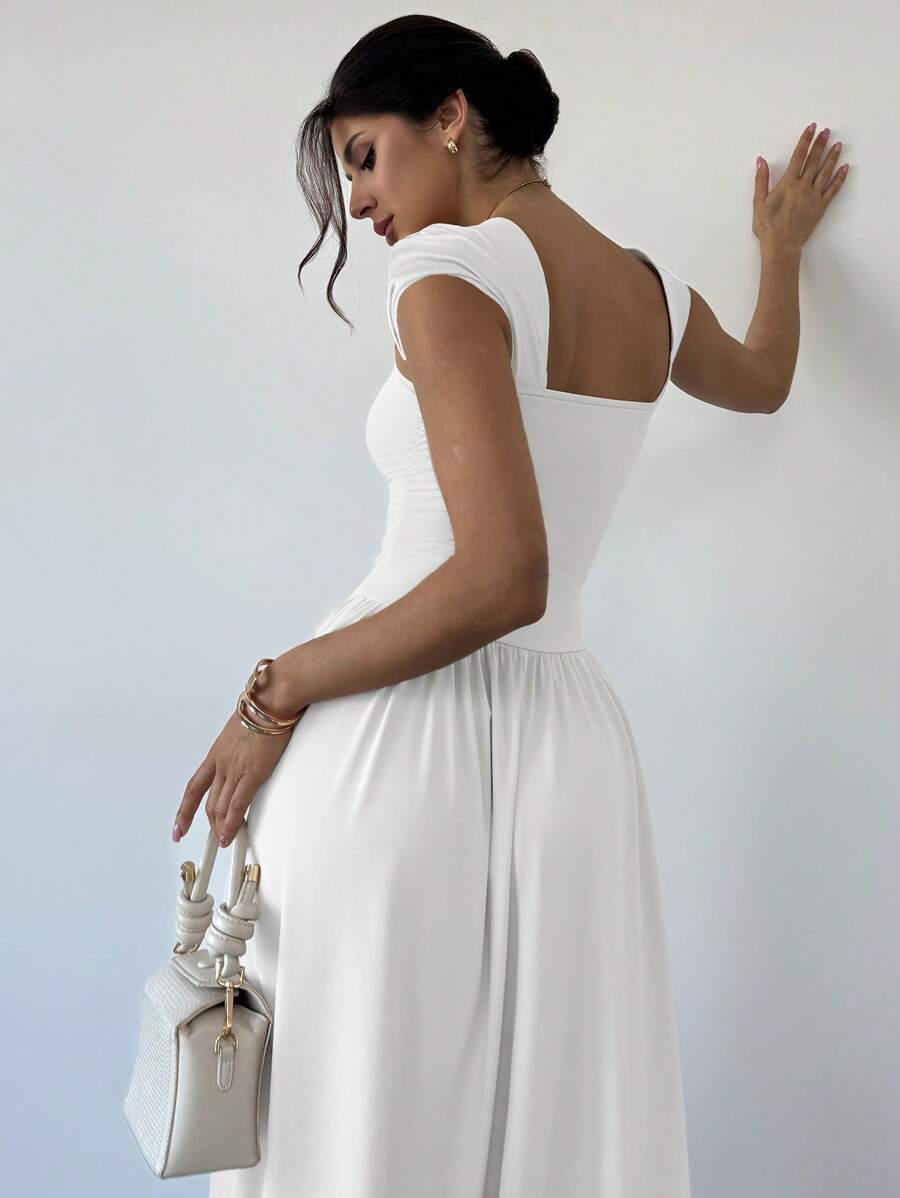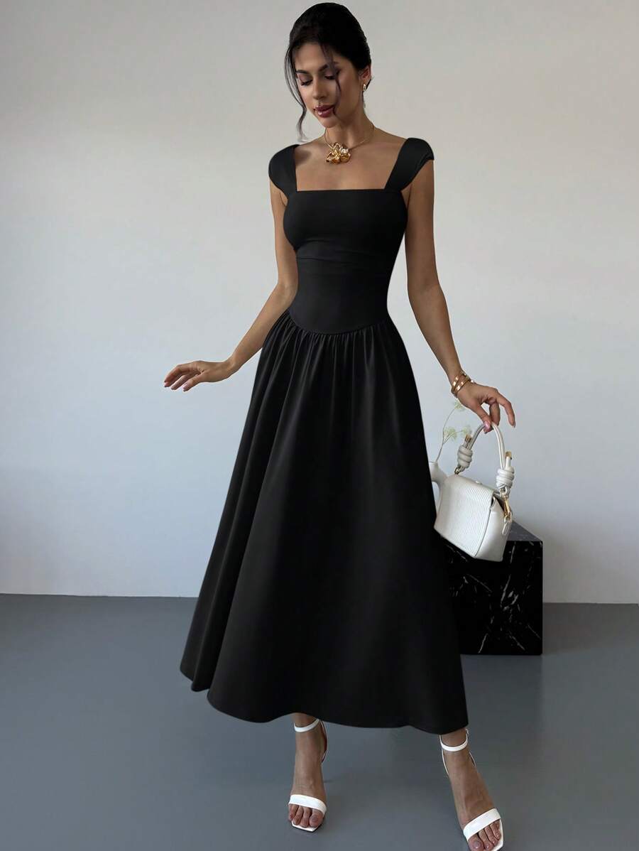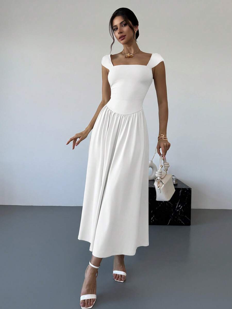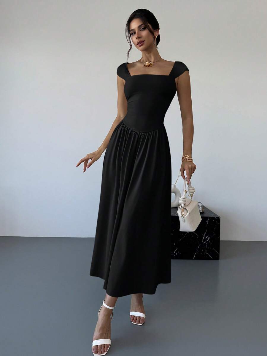 MIU Elegant Bowknot Tie Waist Ruffled Square Neck Sleeveless A-Line Maxi Dress,Apricot,Suitable For Daily Date, Spring/Summer