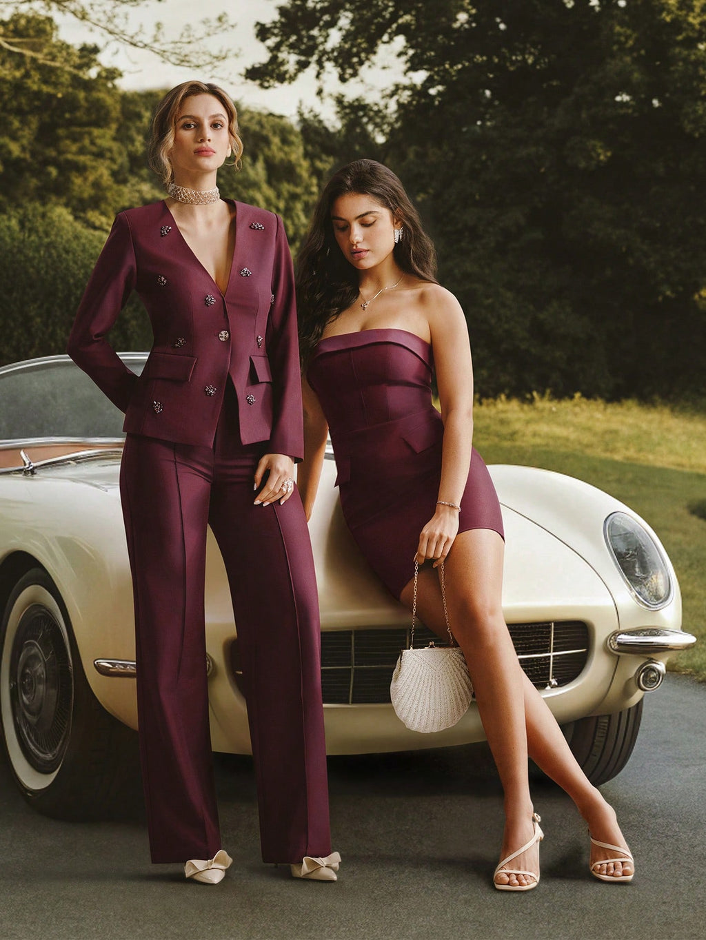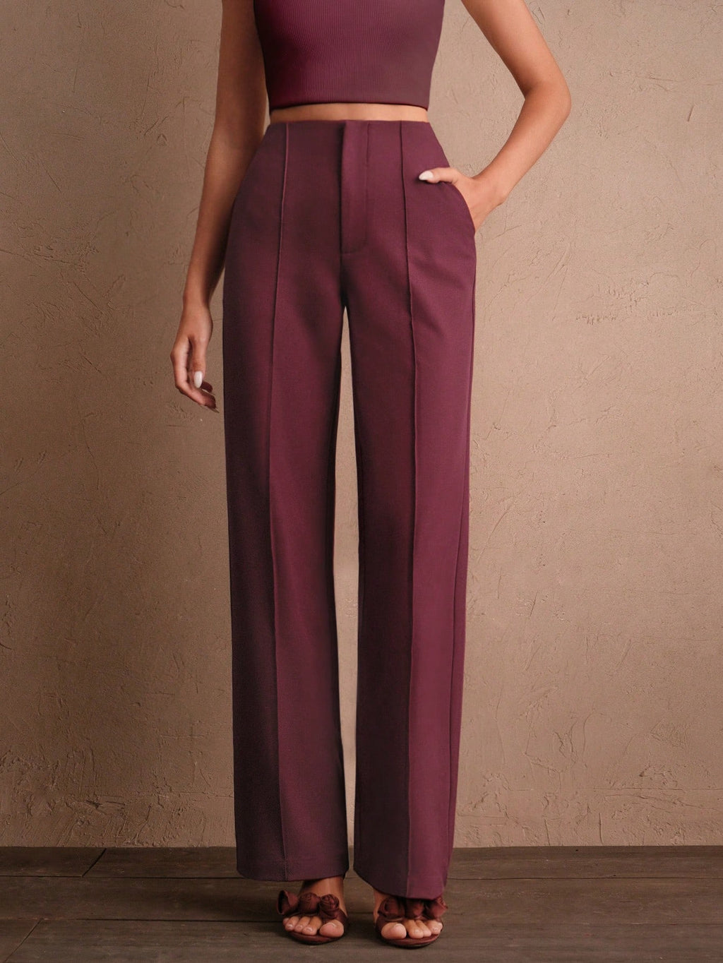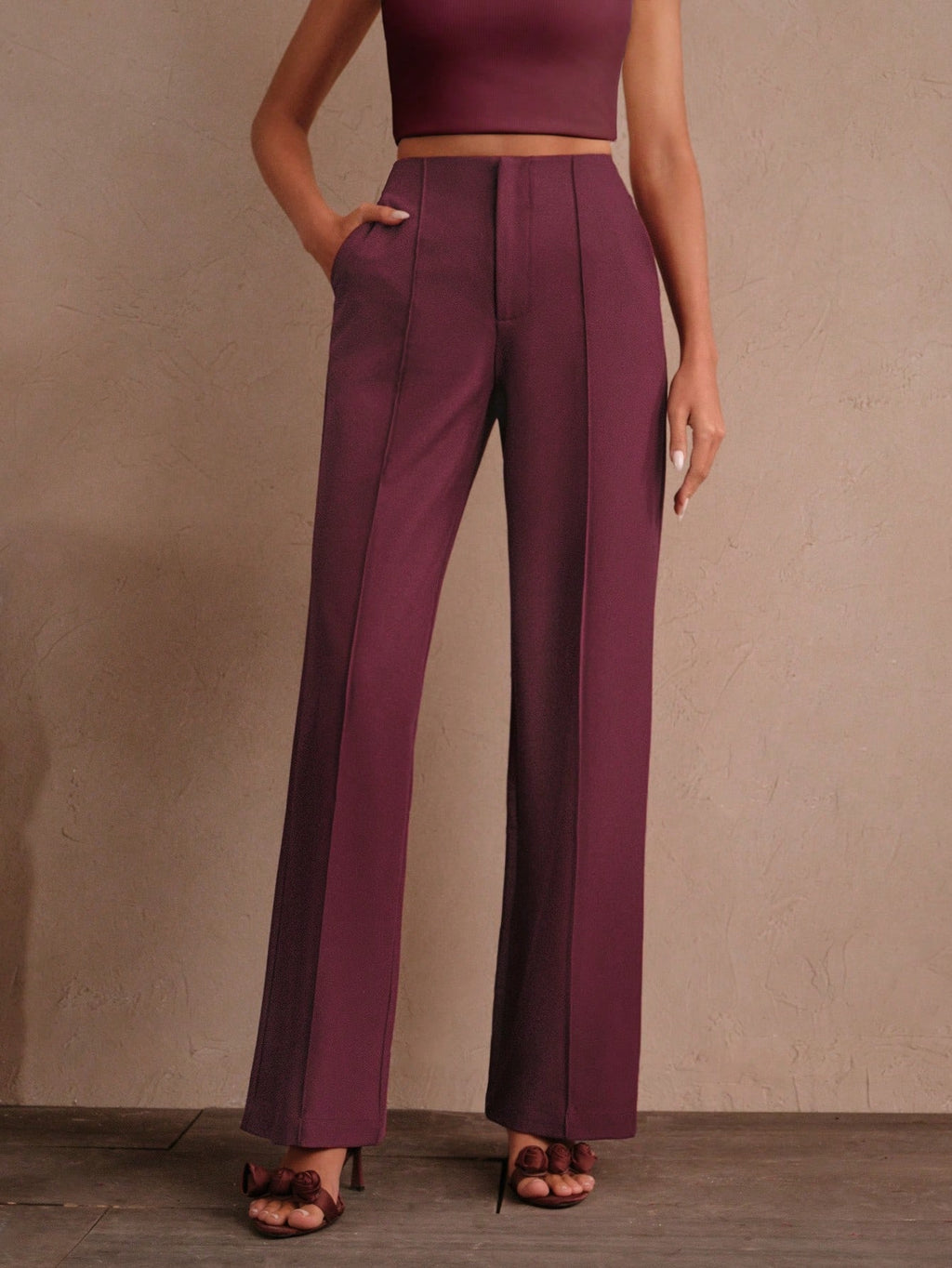 MIU Elegant, Business-Casual Burgundy Straight-Leg Relaxed Fit Women's Suit Pants, Appropriate For Valentine's Day, New Year