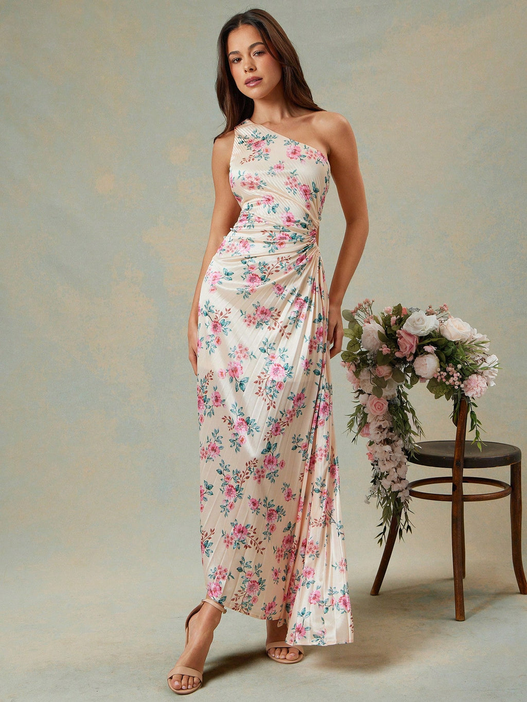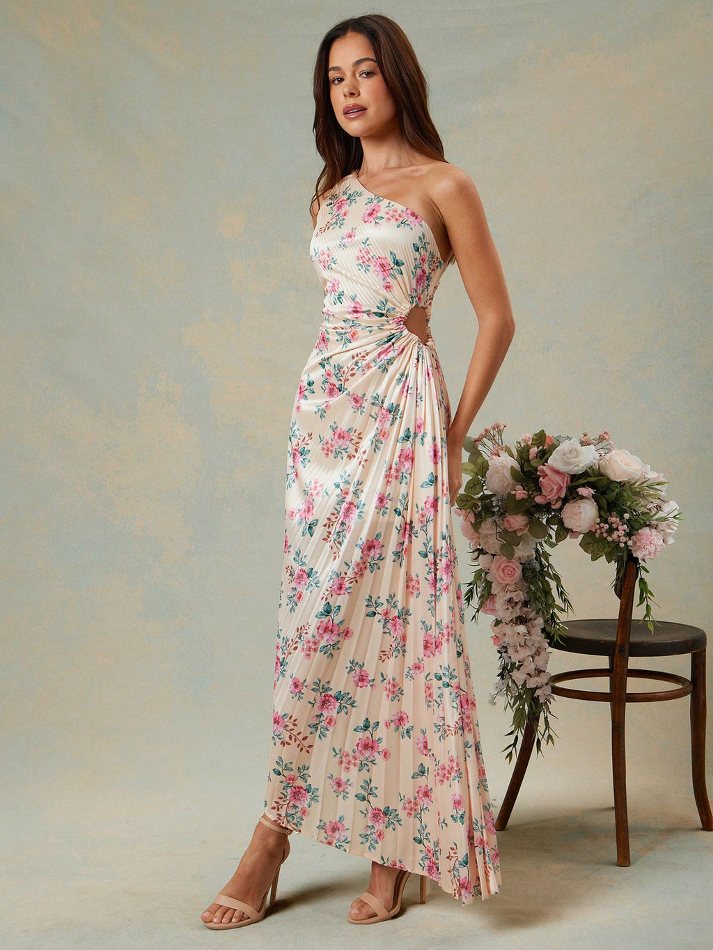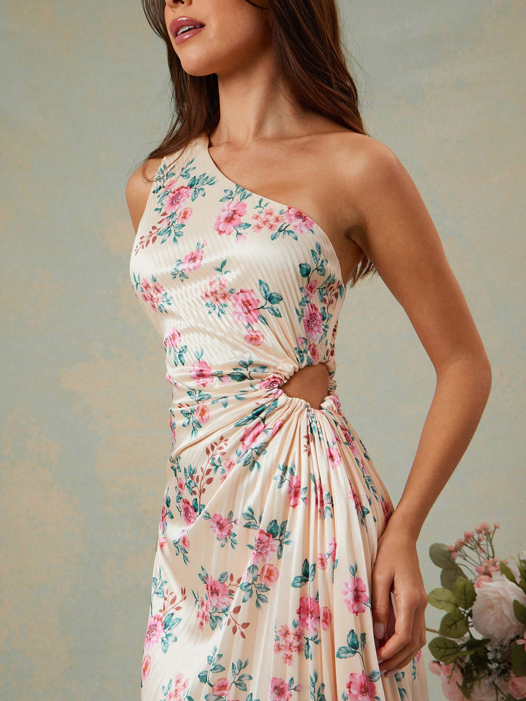 MIU Elegant Floral Pleated One Shoulder Satin Side Cut Out Asymmetric Spring Summer Vacation Maxi Sun Dress, Easter Dress Women, Summer Outfits For Women, Beach Outfits For Women