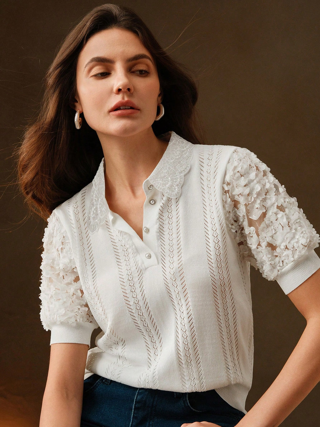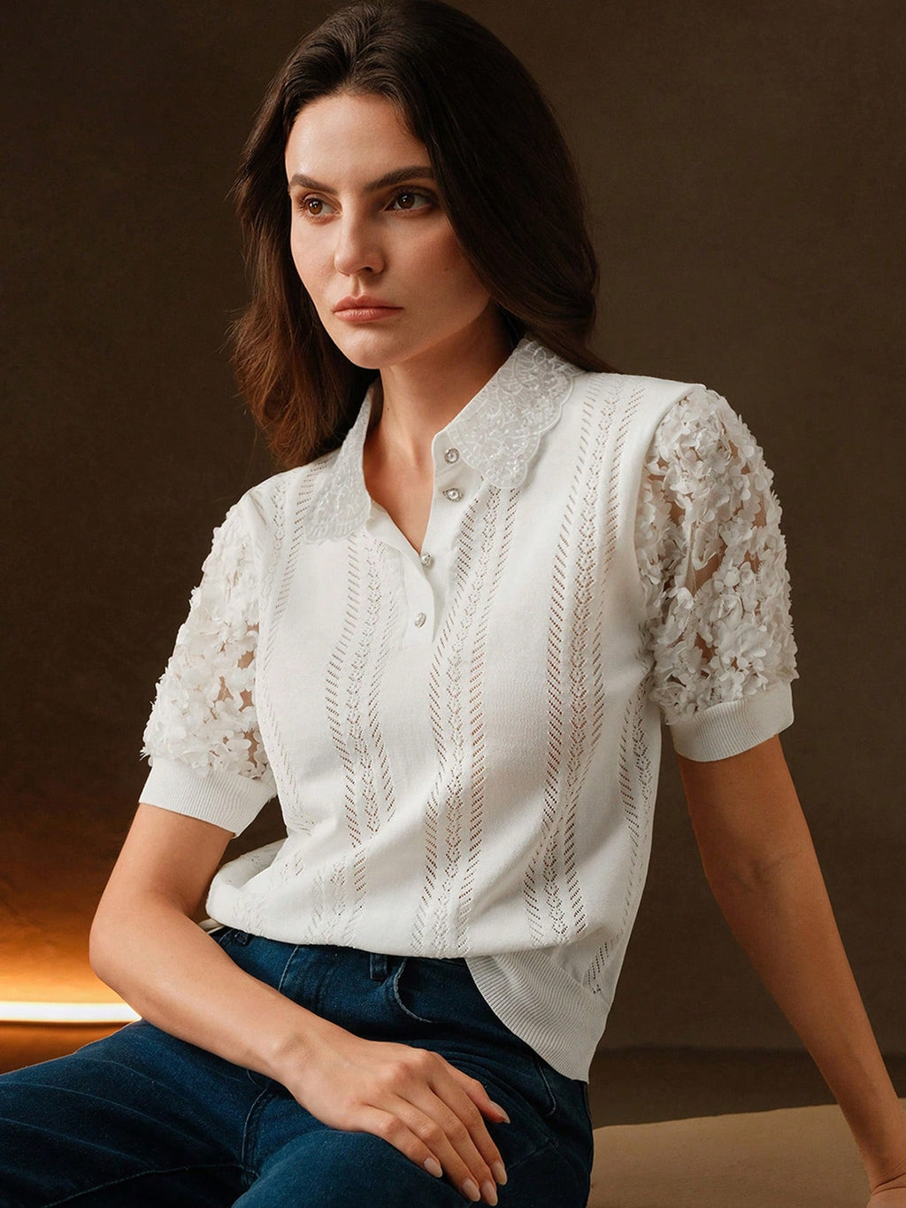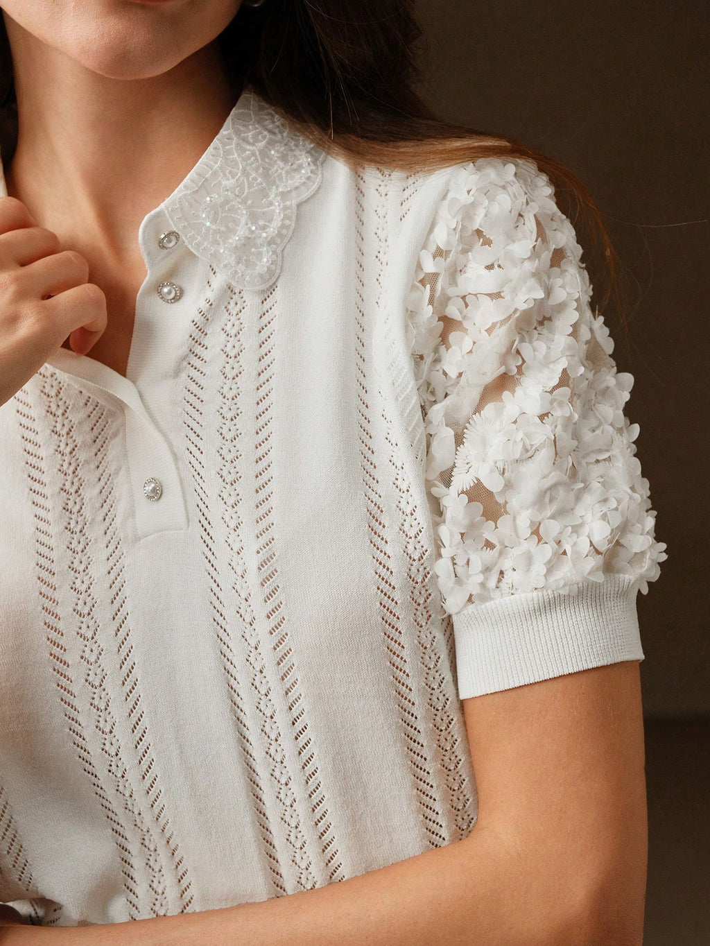 MIU Elegant Modern Pearl Rhinestone Decor Polo Collar Patchwork 3D Floral Sleeve Hollow Women Knit Top T-Shirt Blouse, Valentine's Day, Summer Vacation, New Year's Outfit