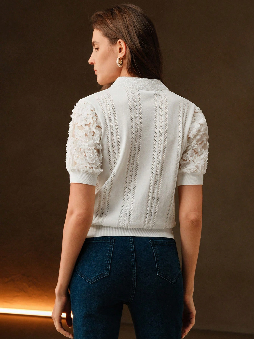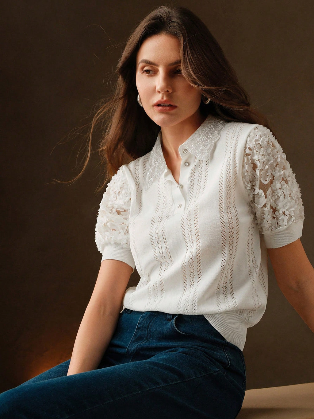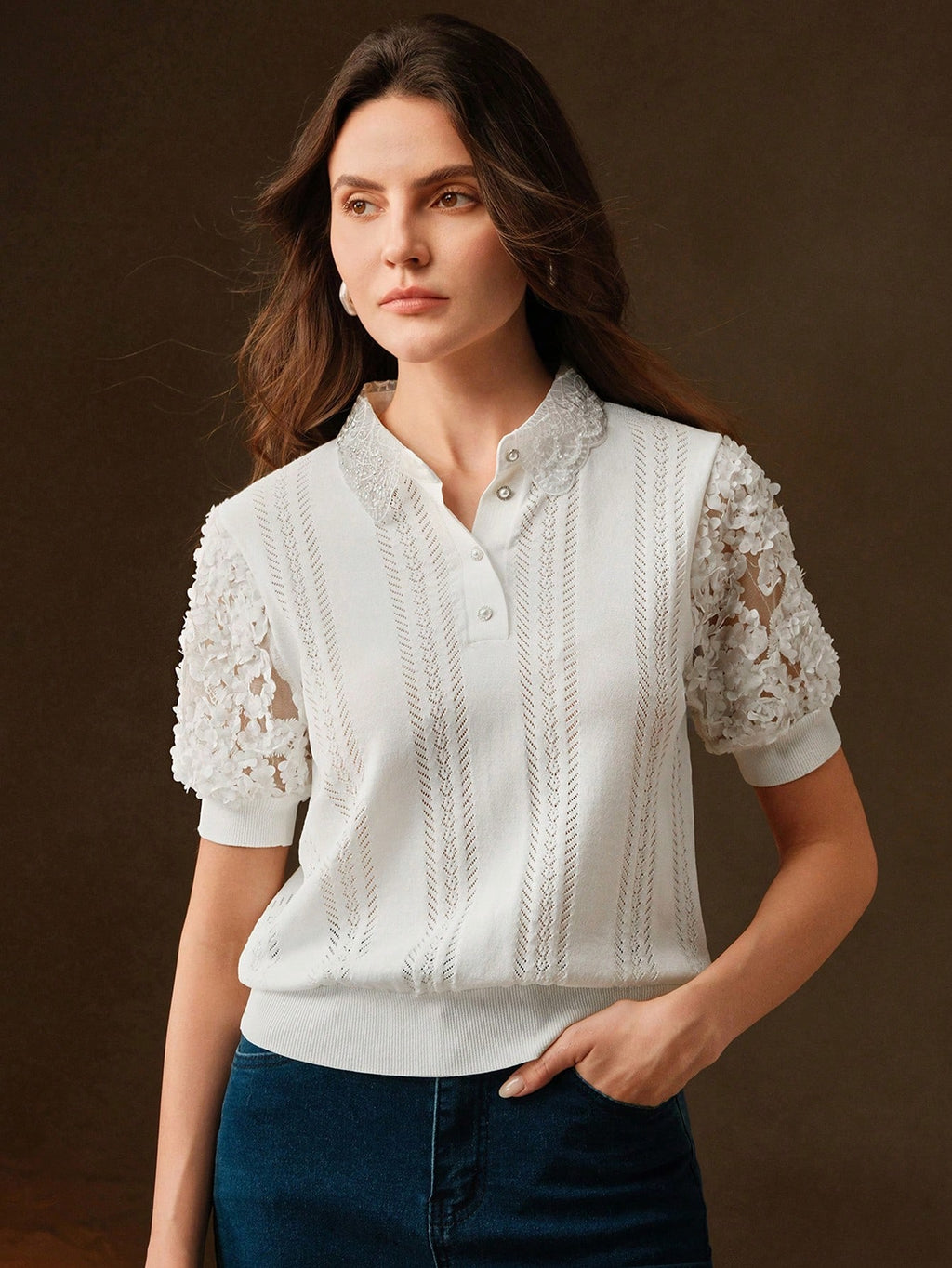 MIU Elegant Modern Pearl Rhinestone Decor Polo Collar Patchwork 3D Floral Sleeve Hollow Women Knit Top T-Shirt Blouse, Valentine's Day, Summer Vacation, New Year's Outfit