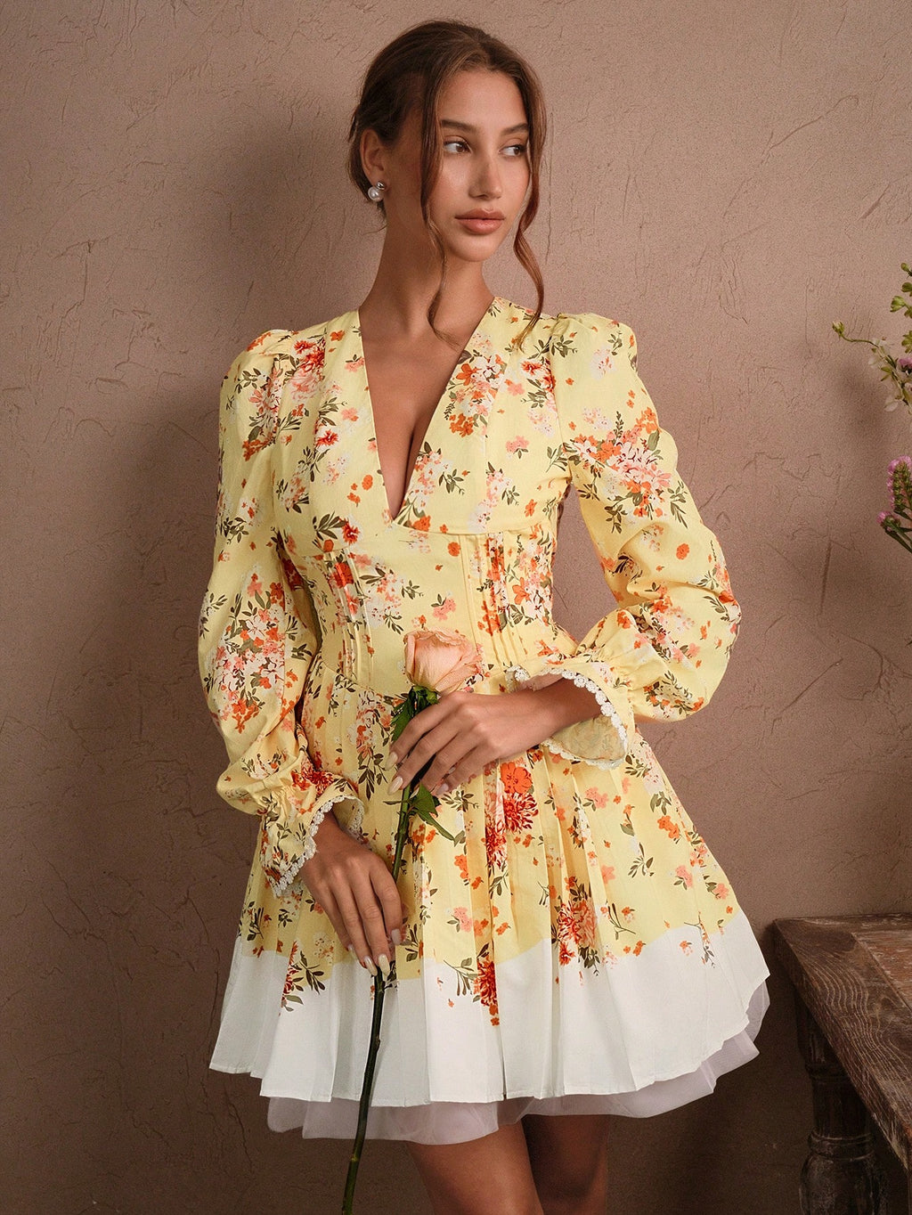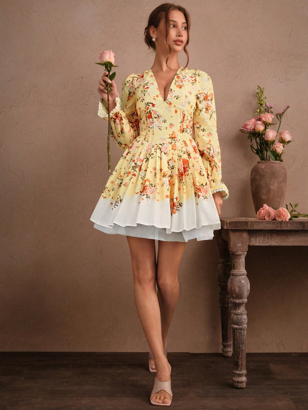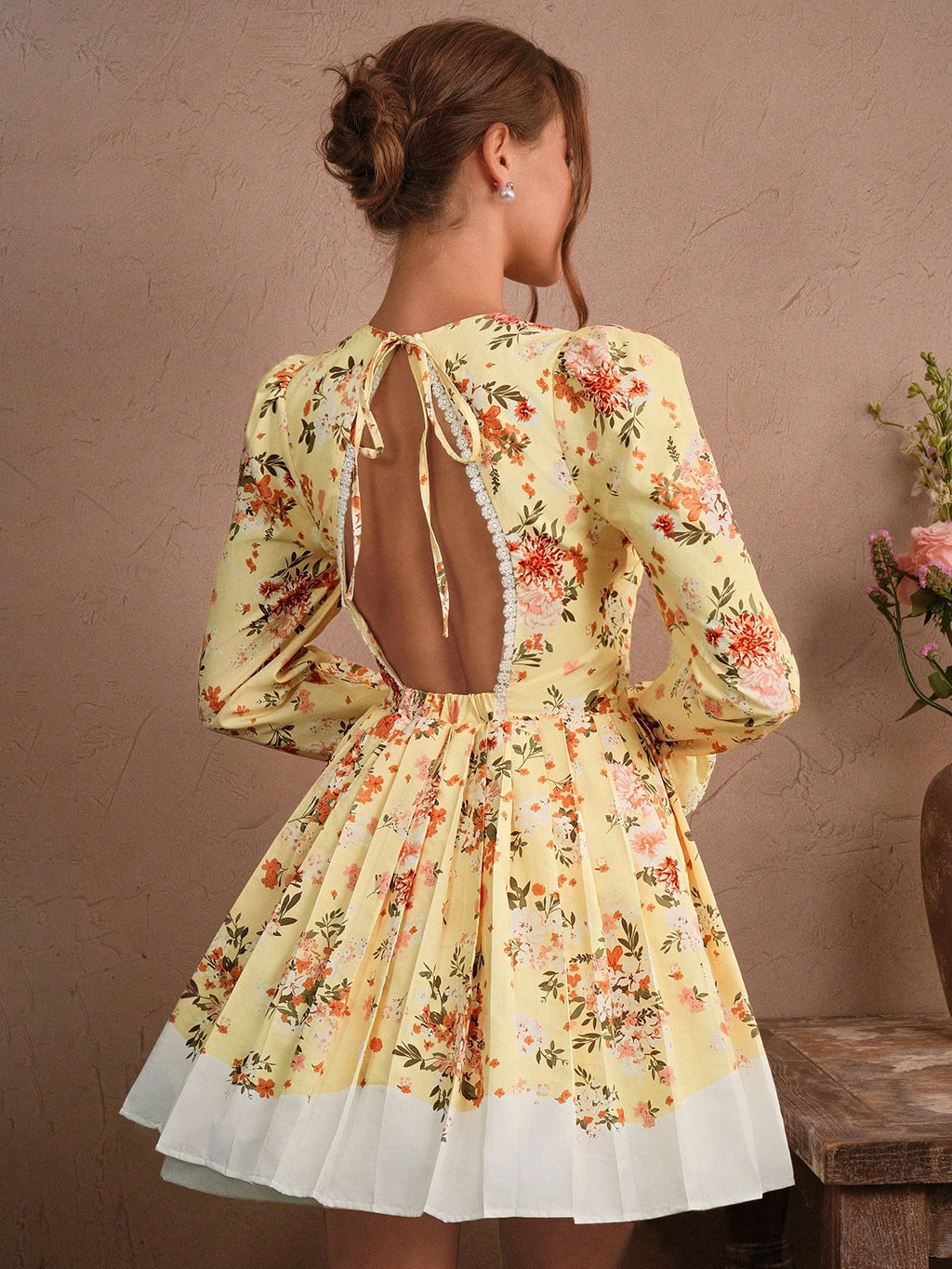 MIU Elegant Romantic Mini Dress With Ruffle Hem, Bowknot Backless Design, Ditsy Floral, Cinched Waist, Suitable For Spring/Summer, Holiday, Festival, Vacation, Valentine's Day