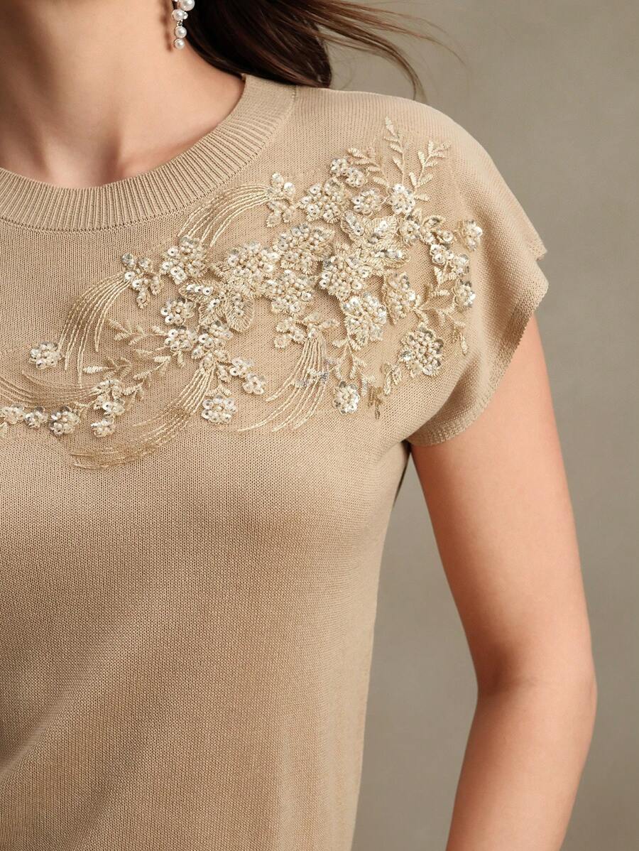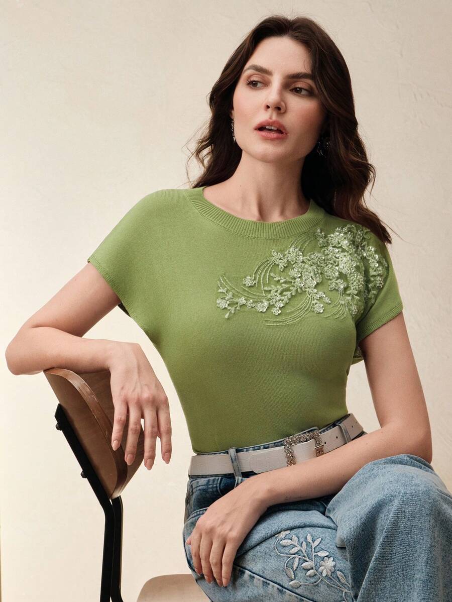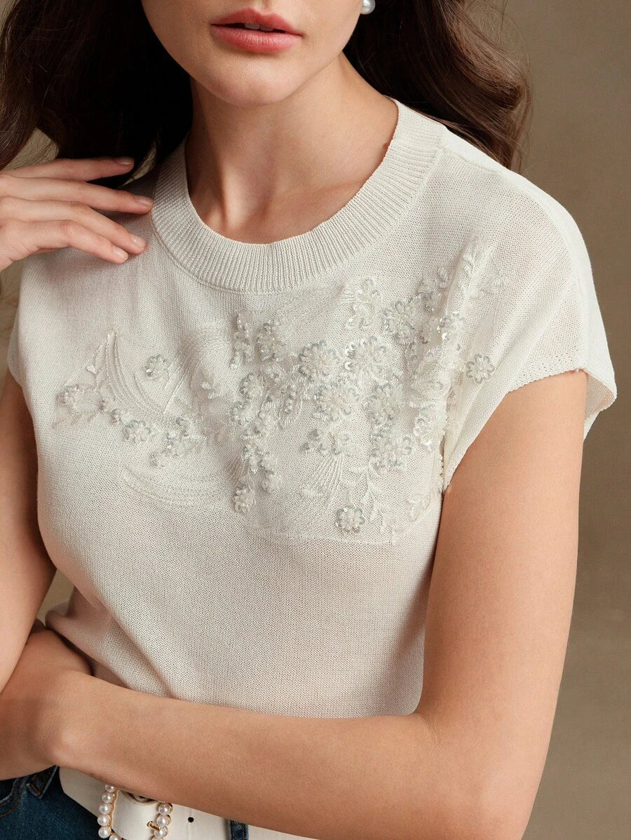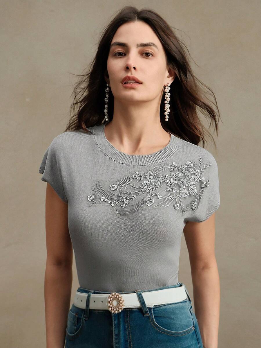 MIU Elegant Round Neck Embroidered Short Sleeve T-Shirt, Spring/Summer Knit Top, Valentine's Day, Summer Vacation, New Year's