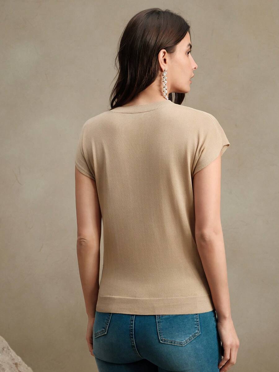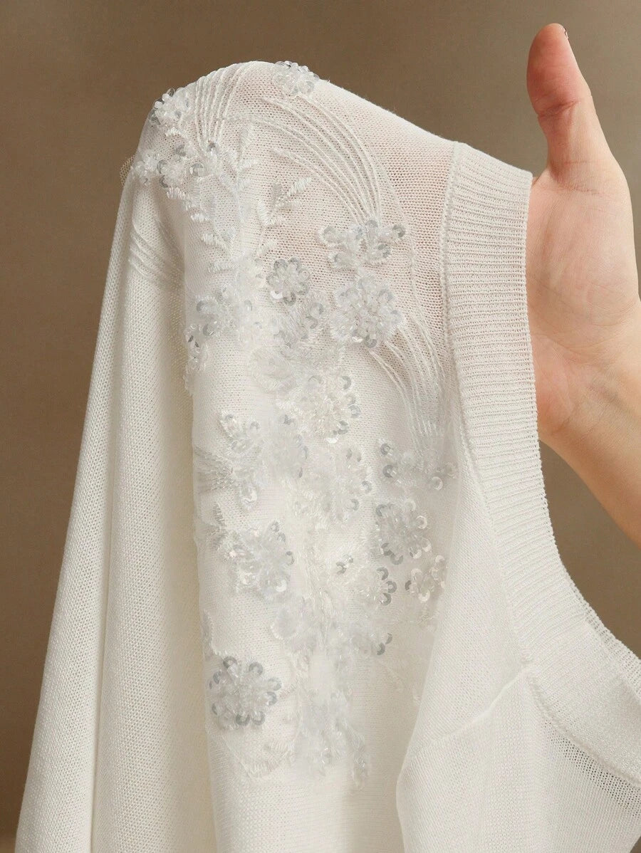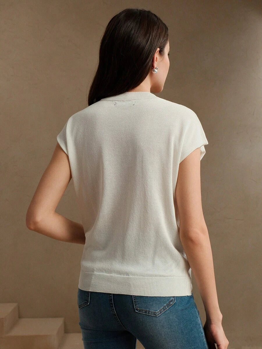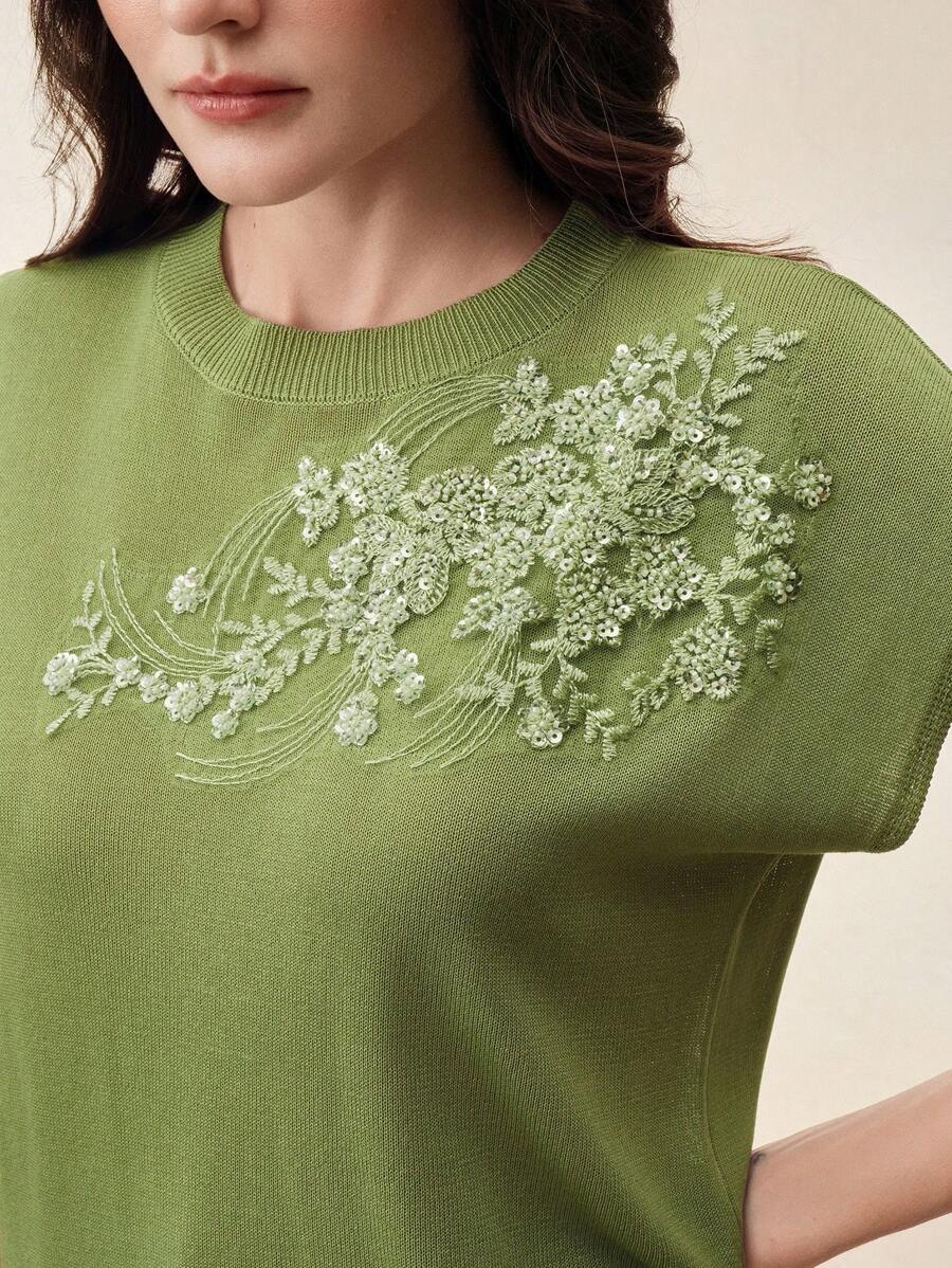 MIU Elegant Round Neck Embroidered Short Sleeve T-Shirt, Spring/Summer Knit Top, Valentine's Day, Summer Vacation, New Year's