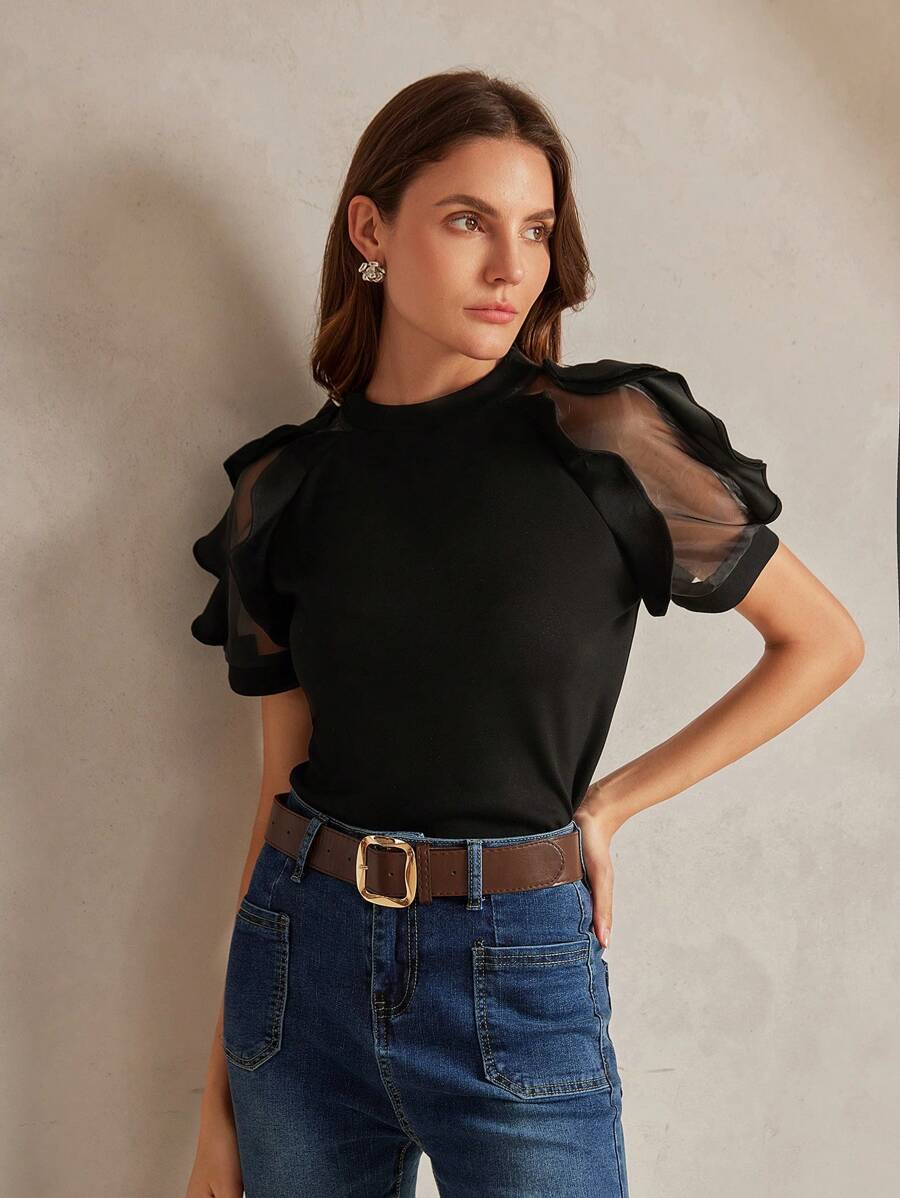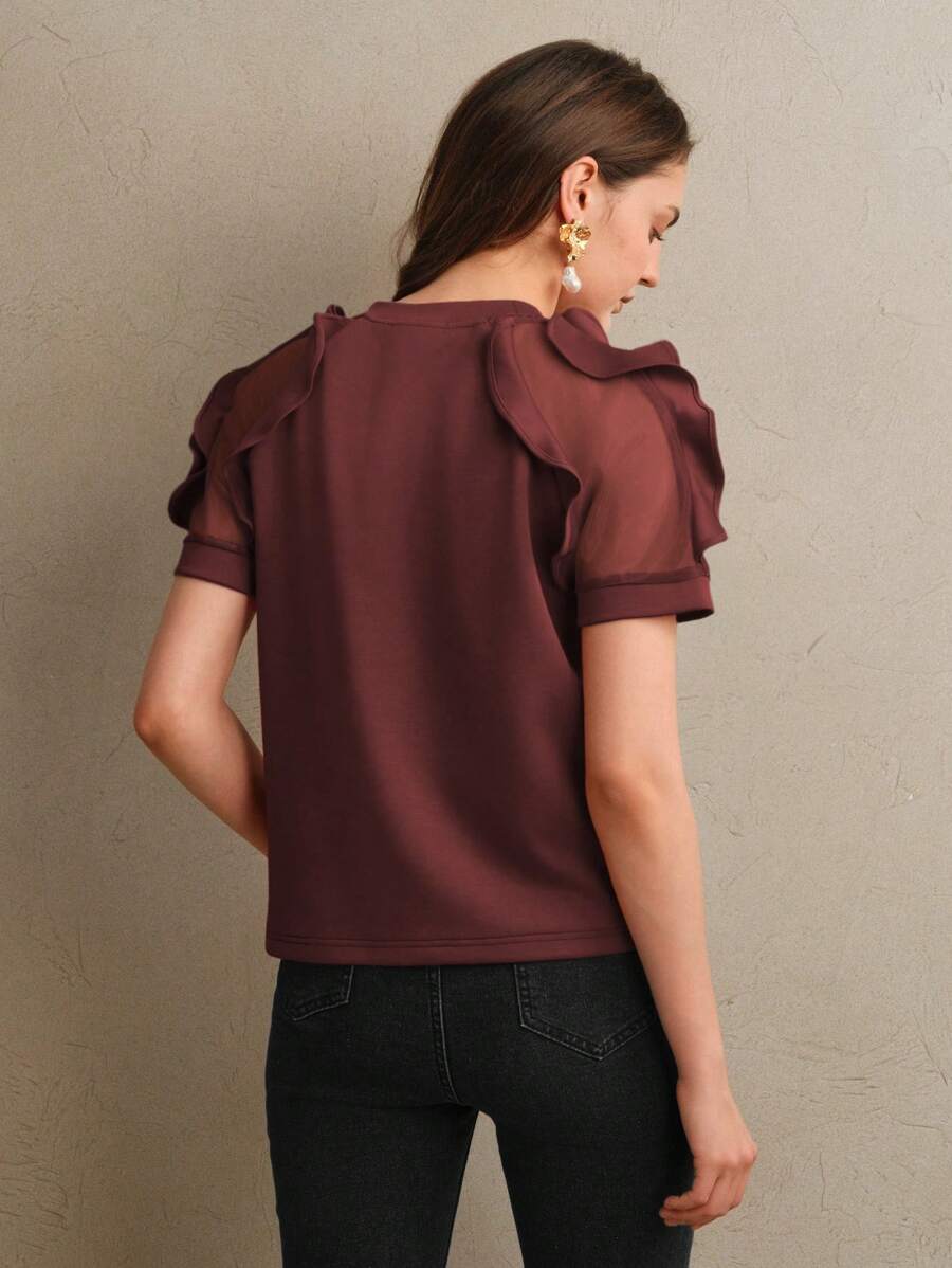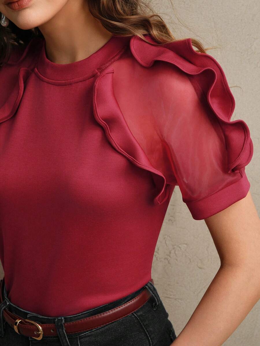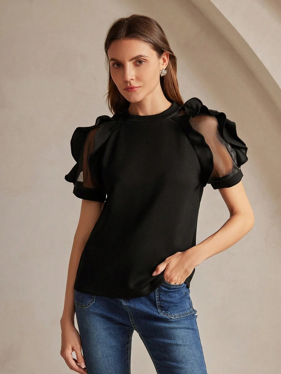 MIU Elegant Sheer Net Patchwork Ruffle Trim Short Sleeve T-Shirt