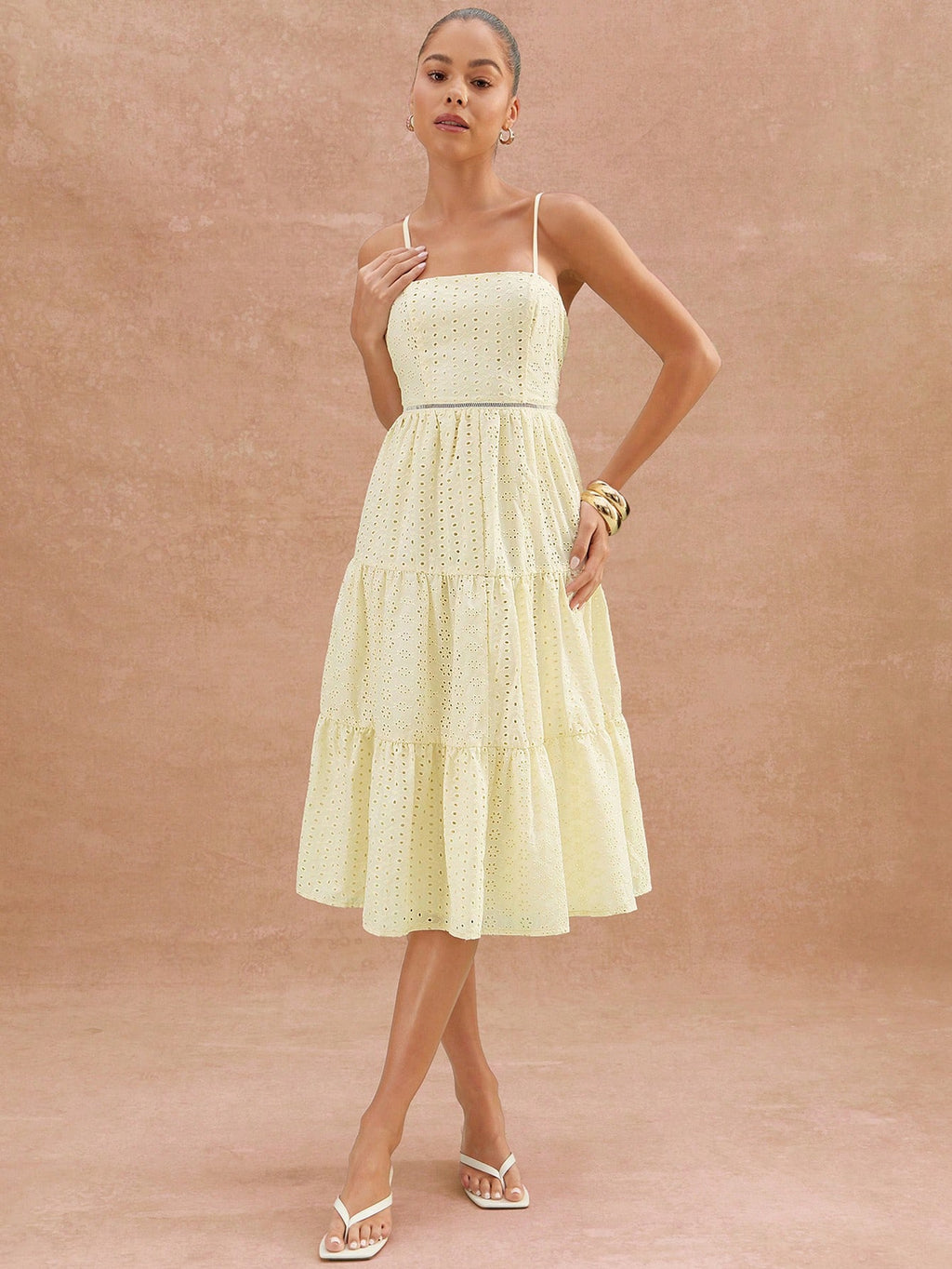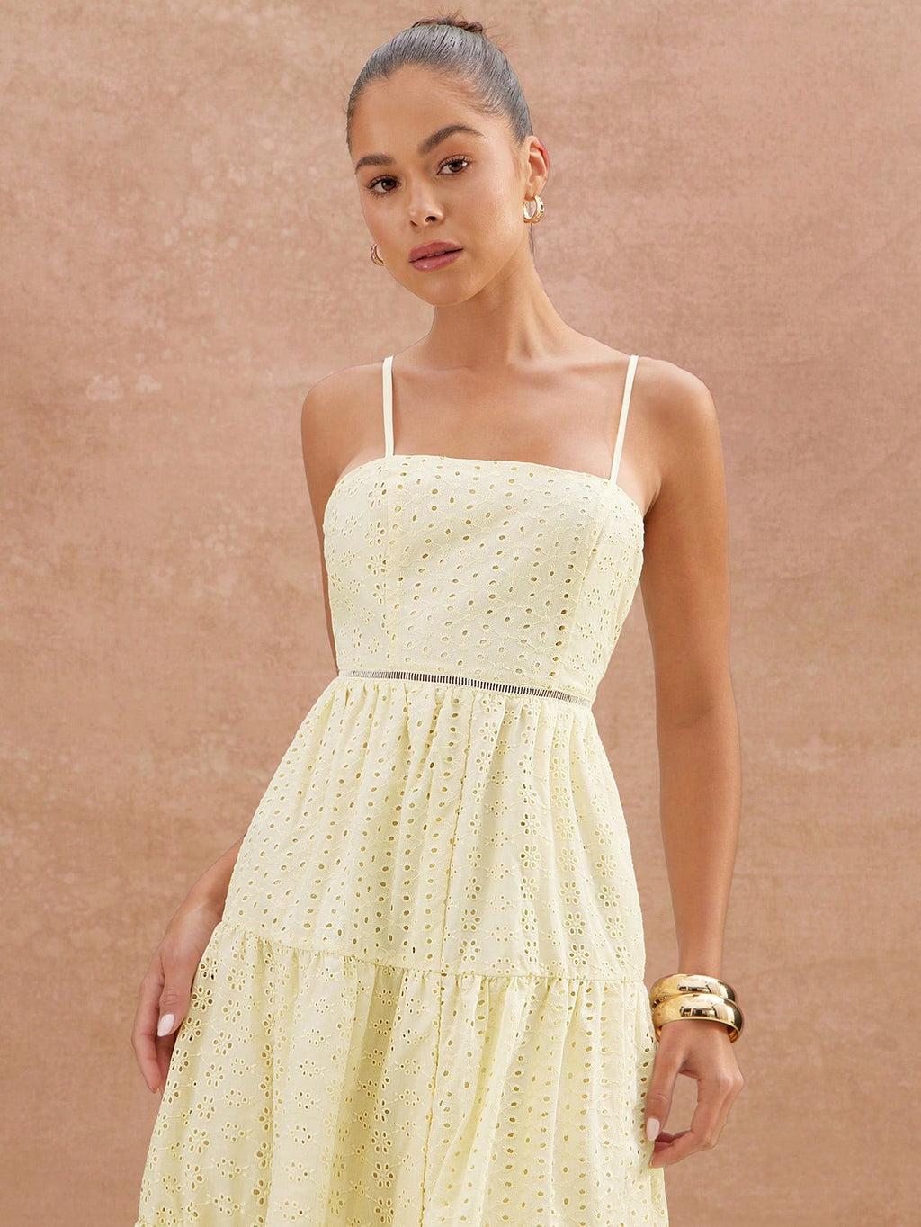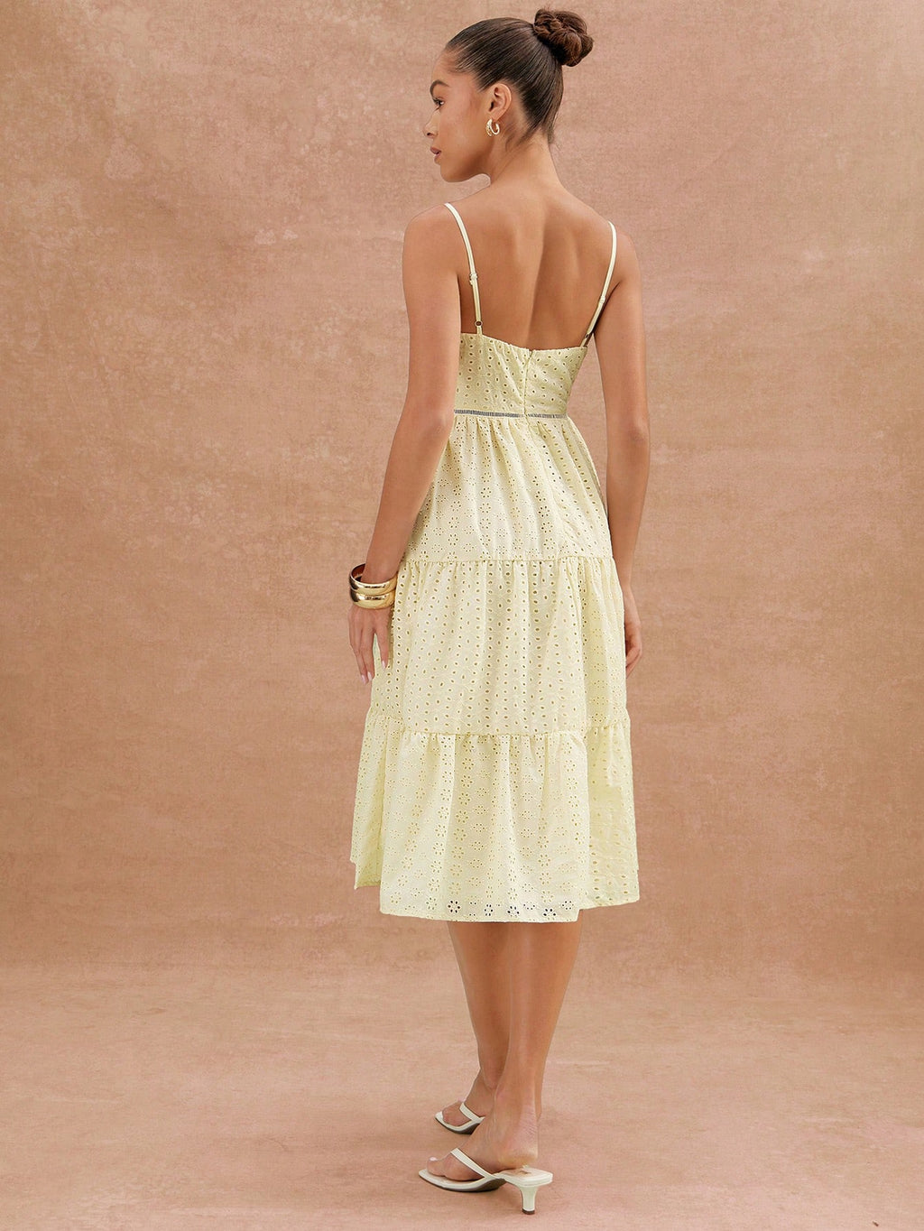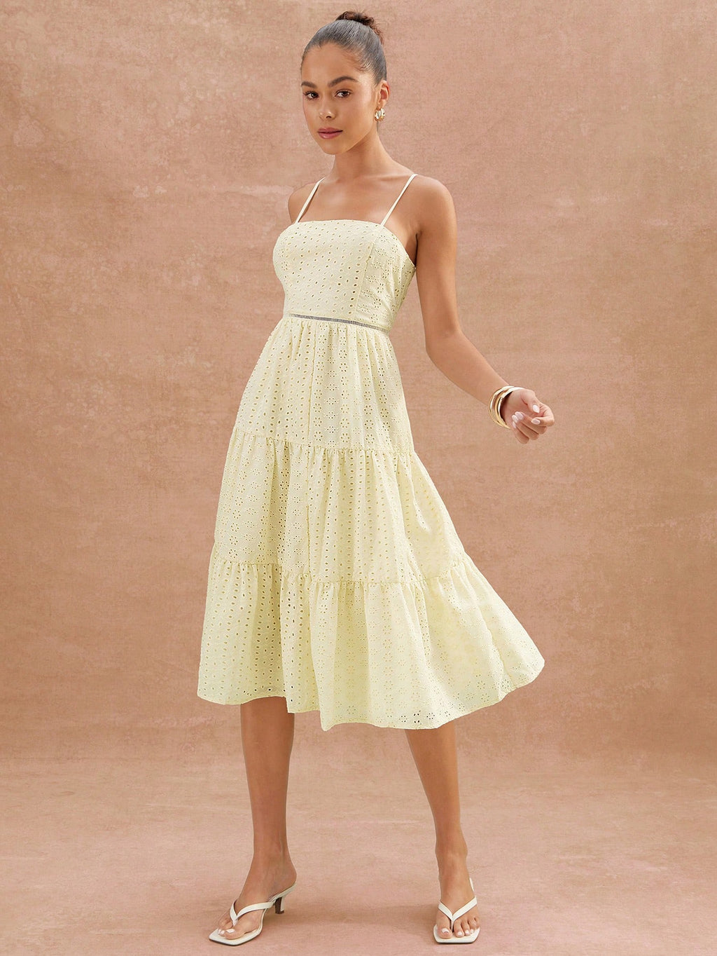 MIU Elegant Summer Pastel Yellow Eyelet Tiered Sleeveless Midi Sun Dress, Beach Outfit, Summer Outfits For WOmen