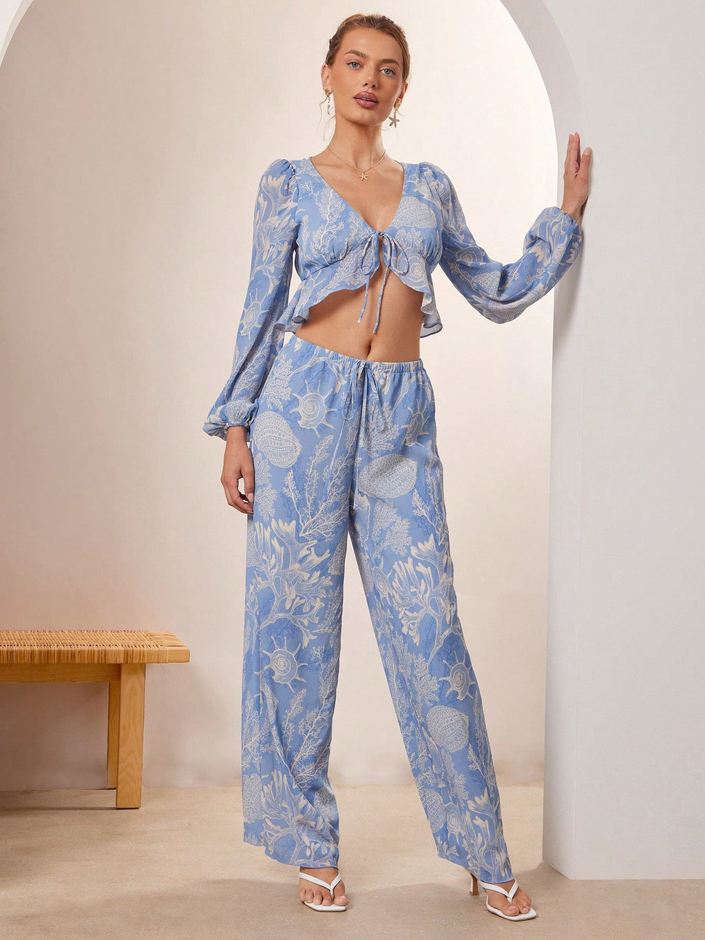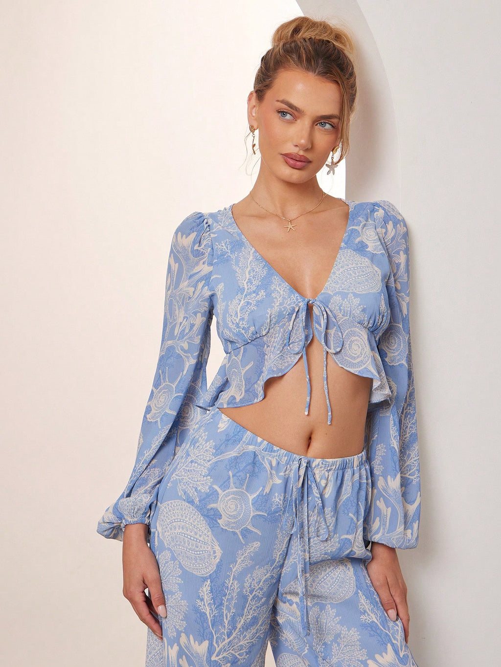 MIU Elegant Tie Front Tropical Shell Print Ruffle Hem Cropped Summer Top, Summer Outfits For Women, Beach Outfits For Women