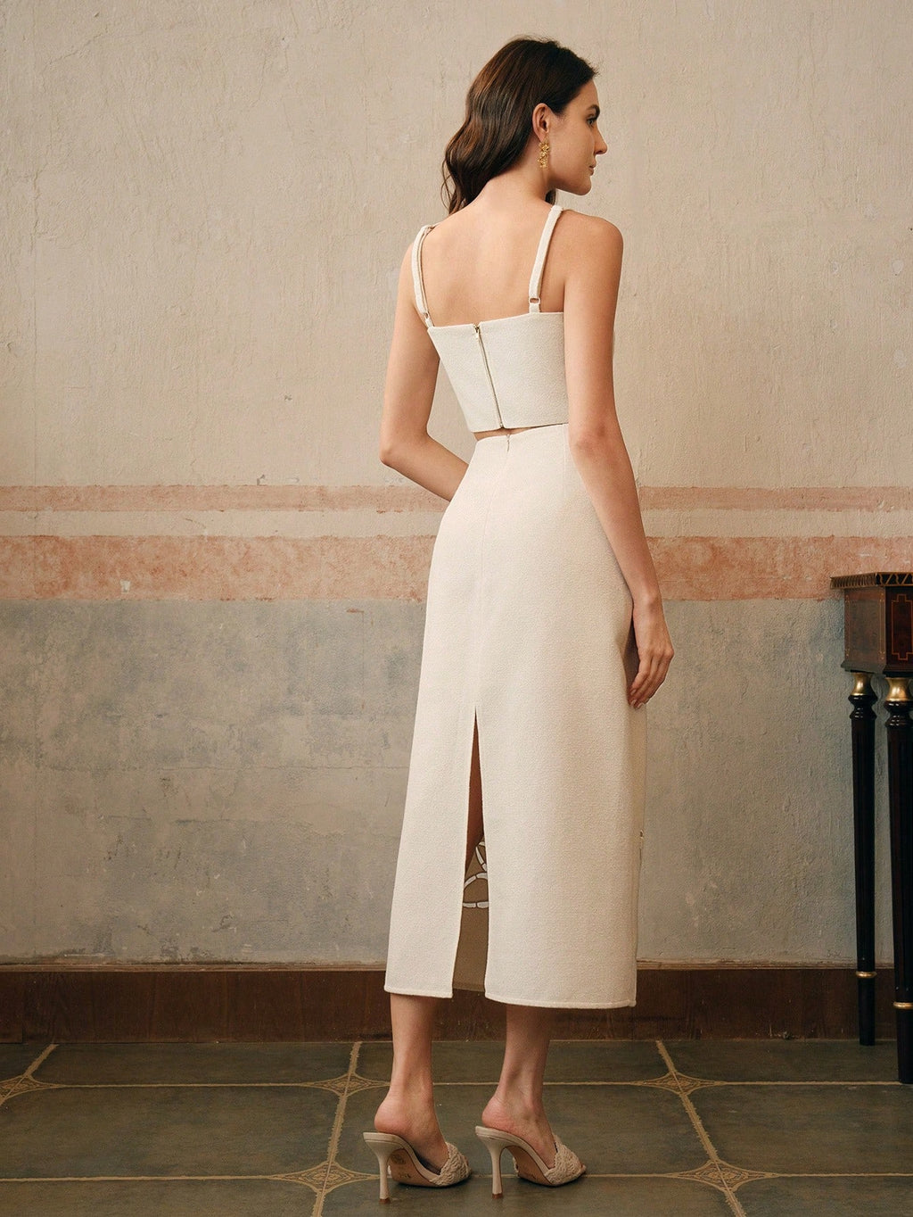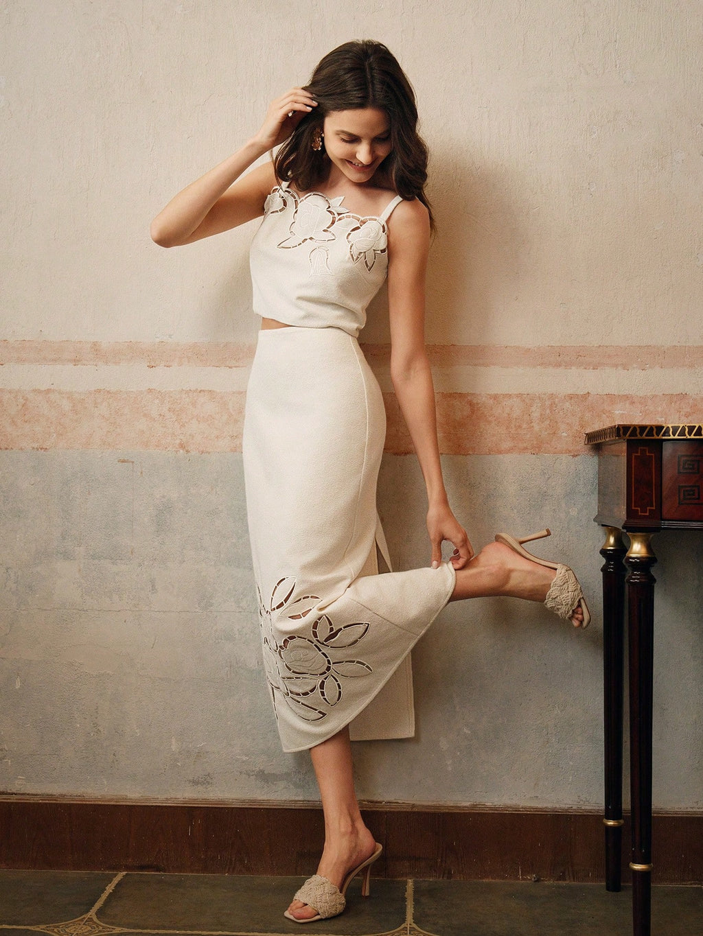 MIU Elegant Urban 2 Pieces Set: High-End Burn-Cut Hollow Embroidery Spaghetti Strap Bustier Top