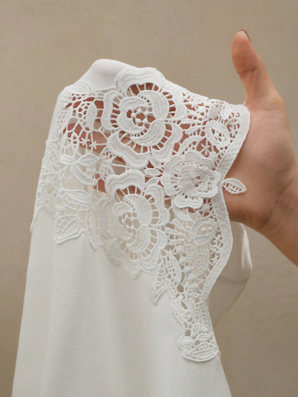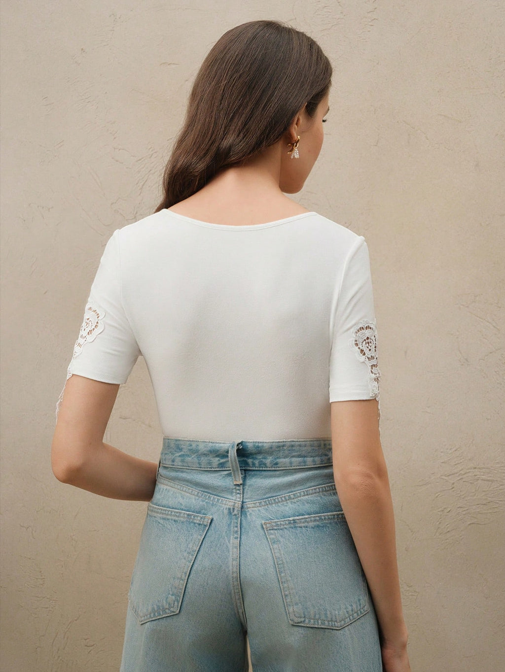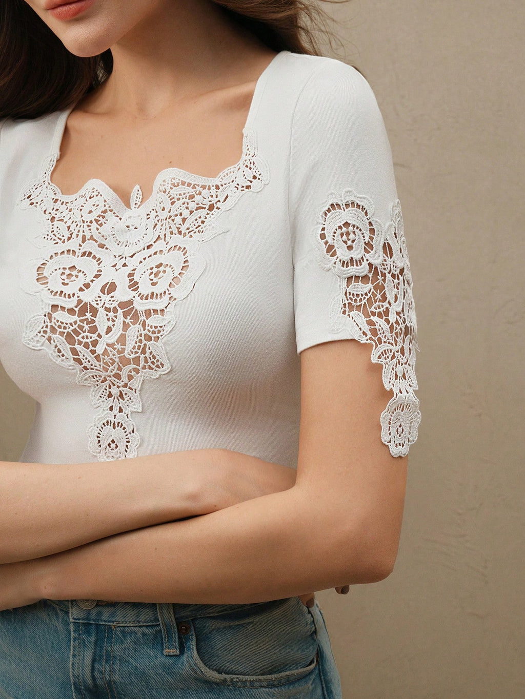 MIU Elegant Urban White Lace Patchwork Knitted Elastic Bodysuit With Short Sleeves, Sexy