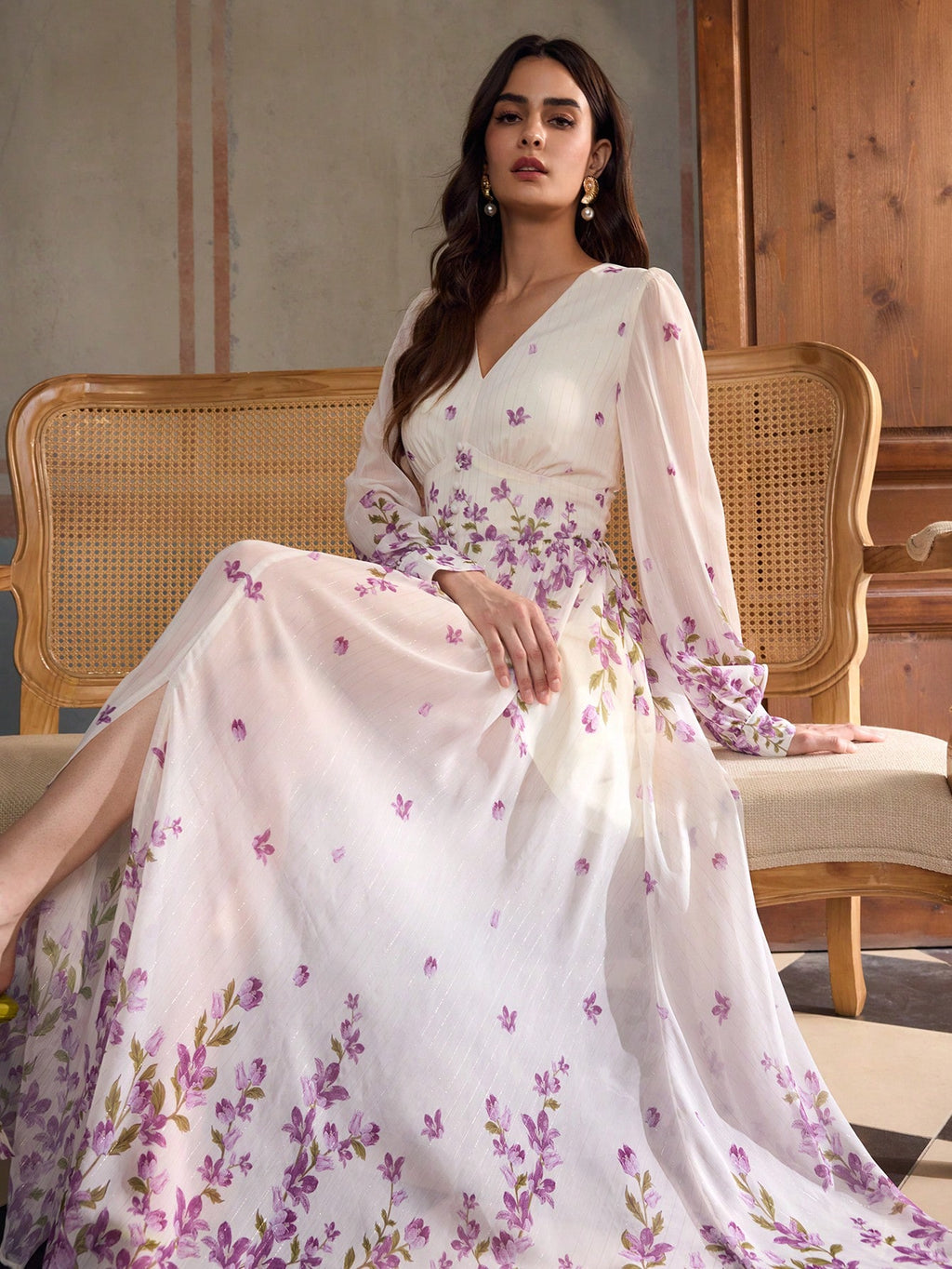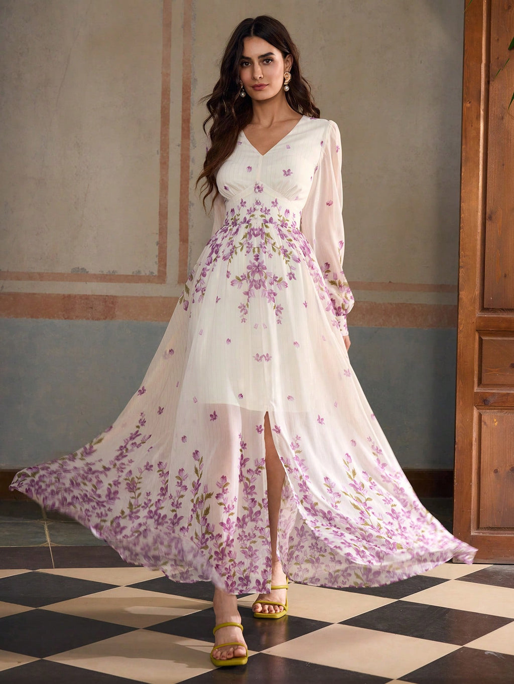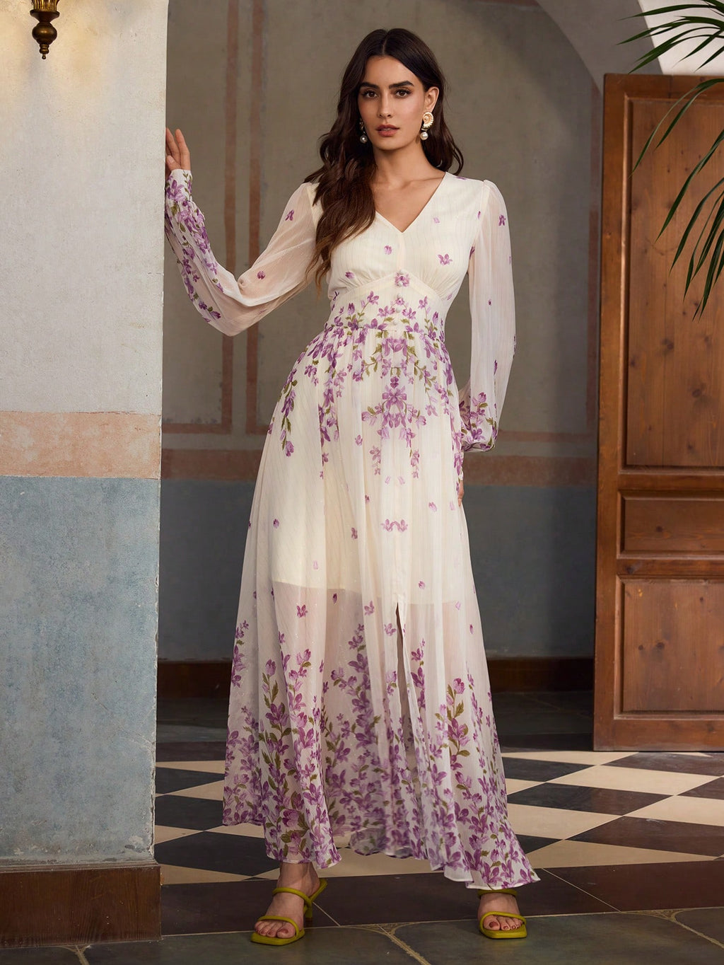 MIU Elegant V-Neck Long Sleeve Floral Placement Print Dress, Vacation Dress, Spring/Summer