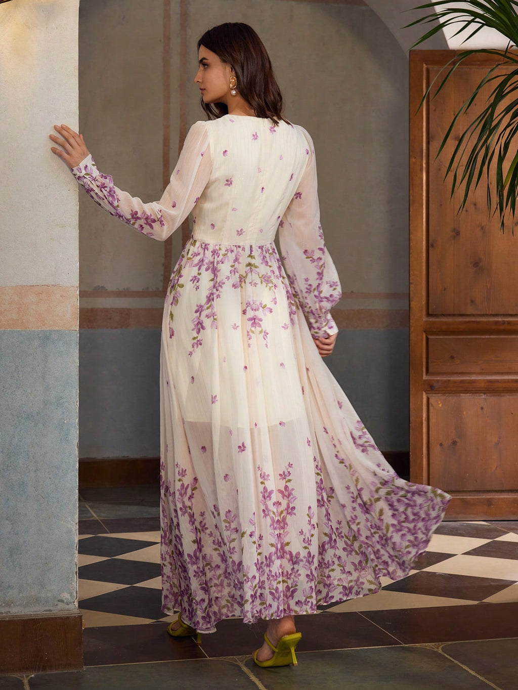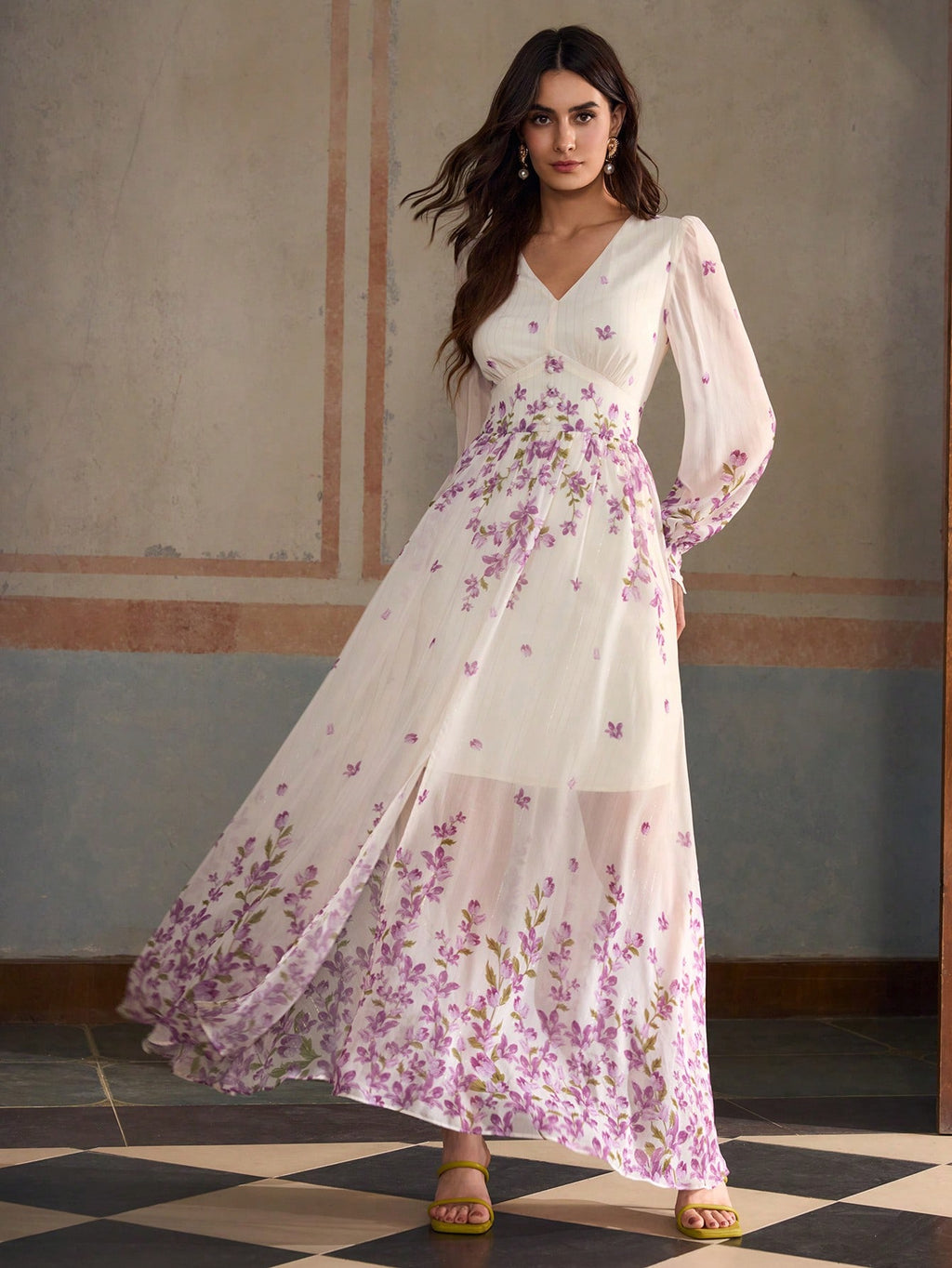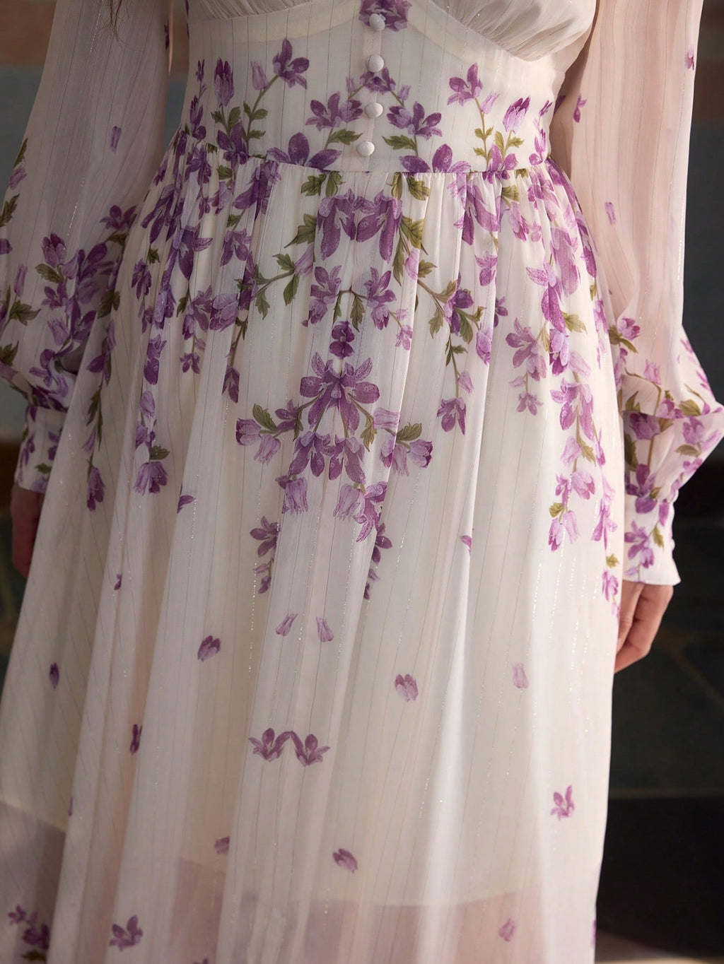 MIU Elegant V-Neck Long Sleeve Floral Placement Print Dress, Vacation Dress, Spring/Summer