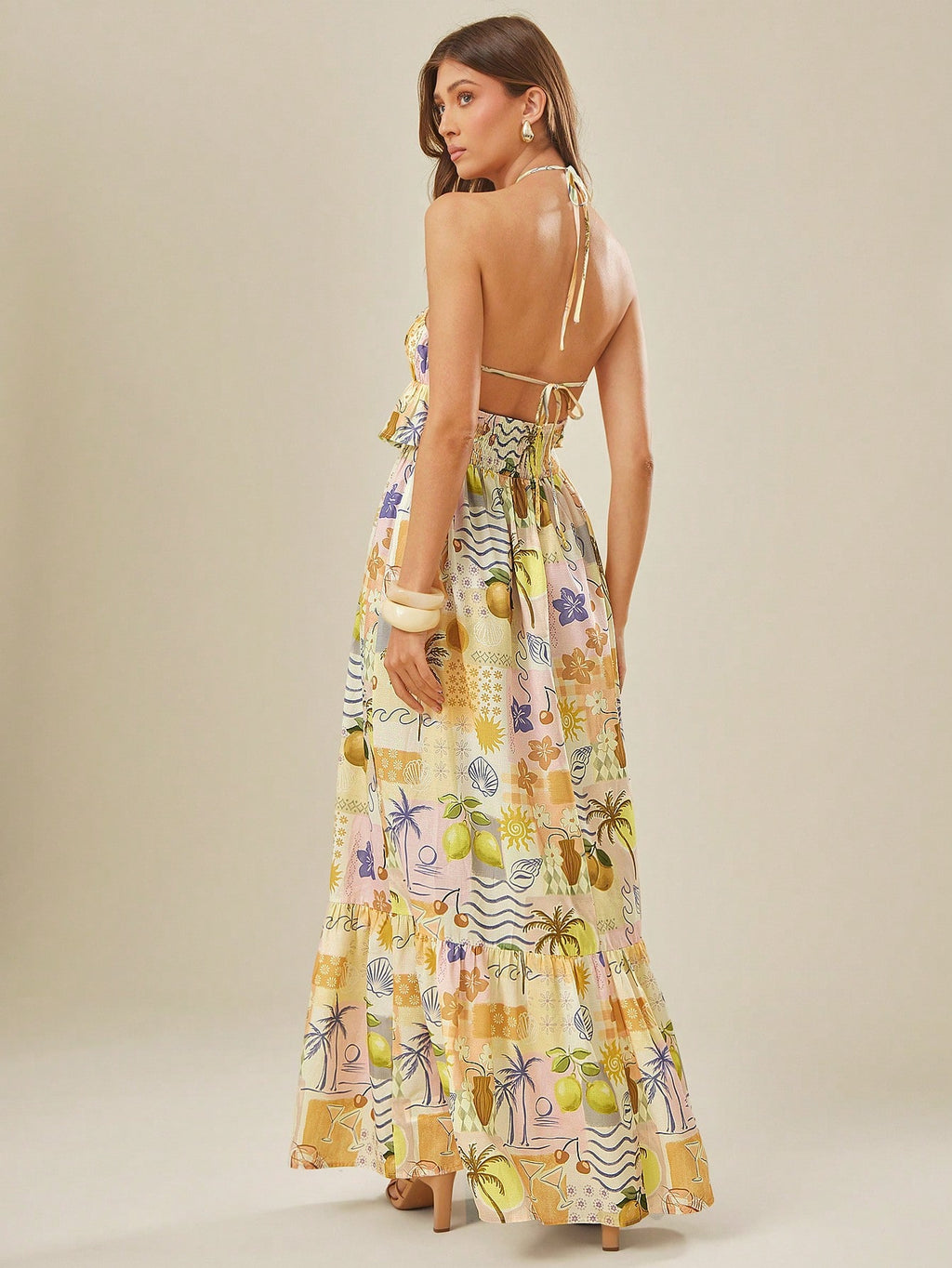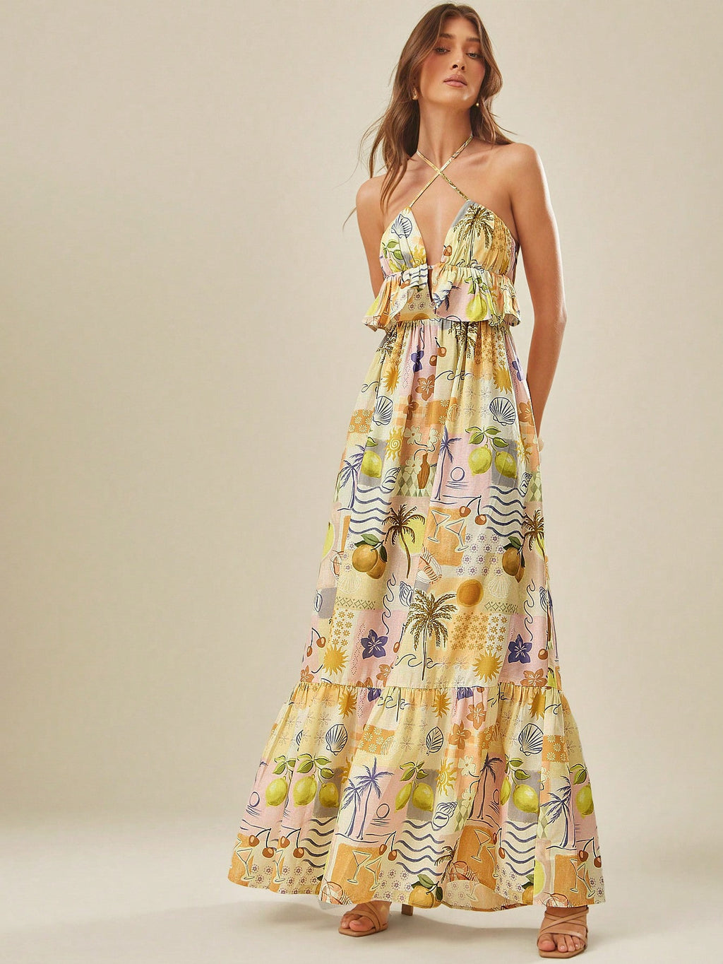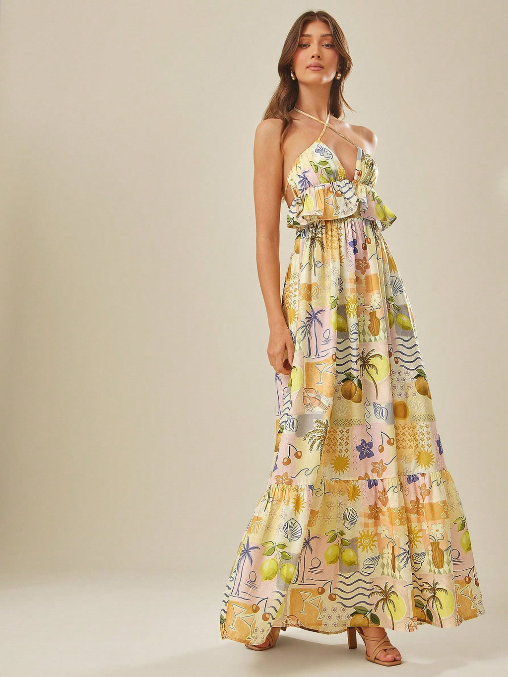 MIU Elegant Vacation Resort Print Halter Ruffle Bust Maxi Flouncy Maxi Dress