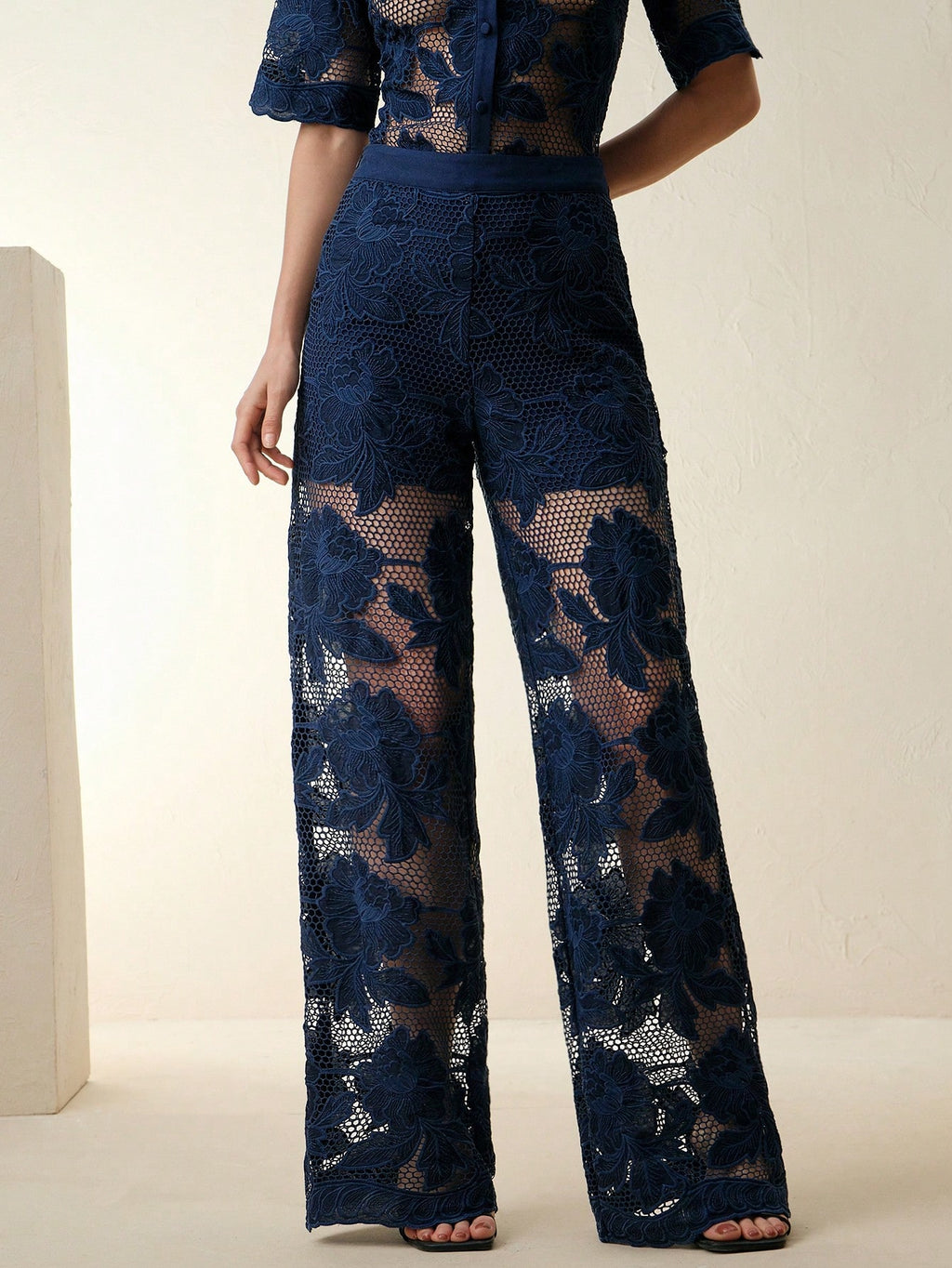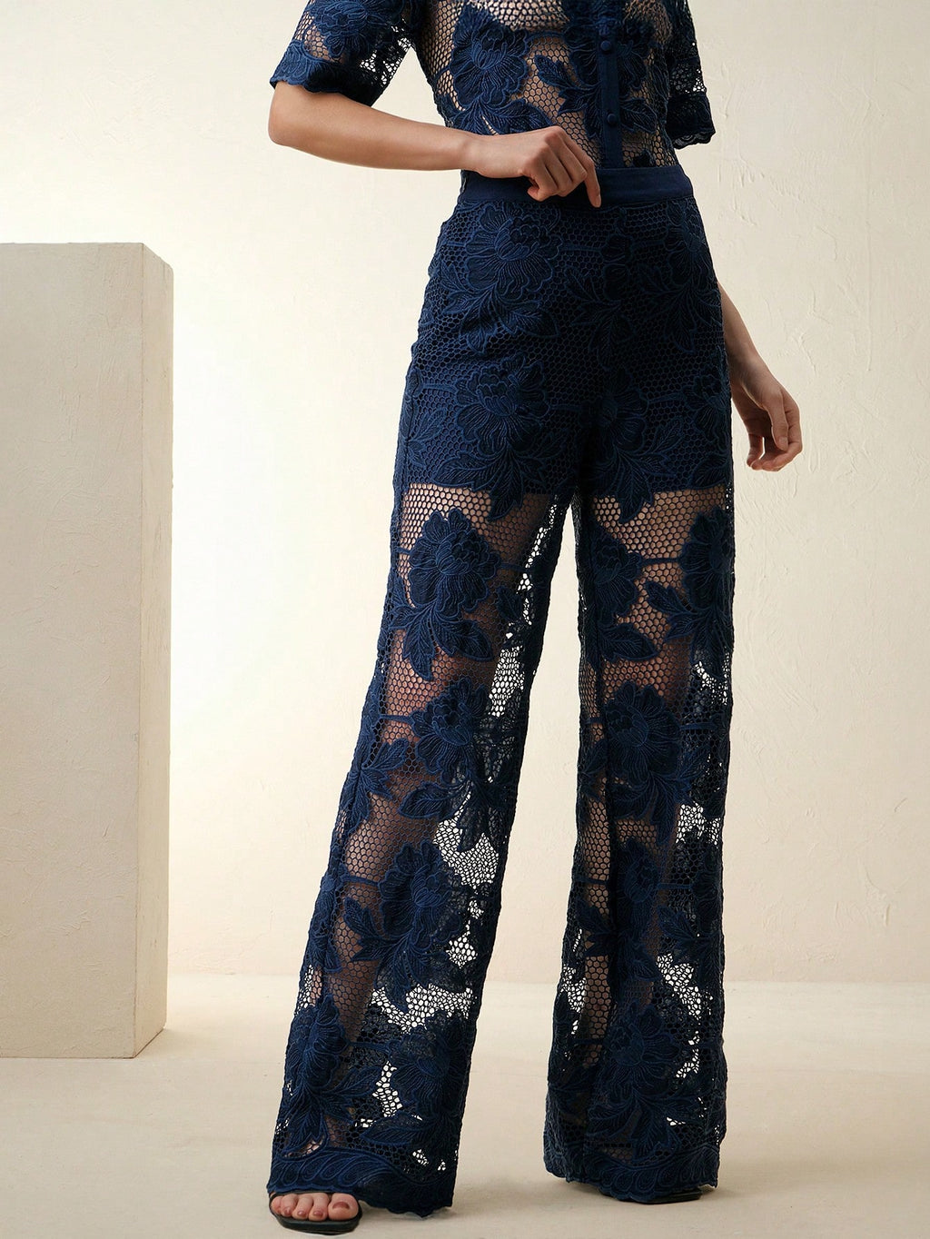 MIU Elenzga Inspired Blue Jumpsuit For Women Semi-Sheer Floral Lace Woven Fabric Long Wide-Leg