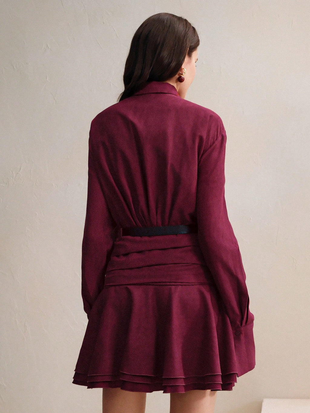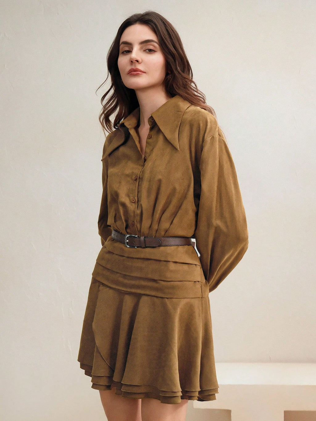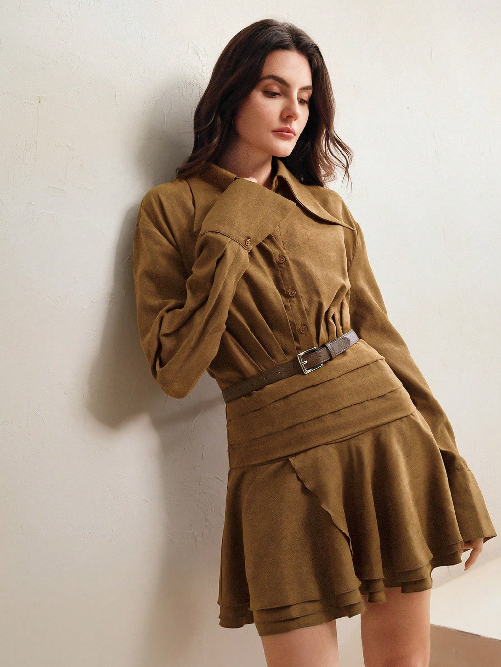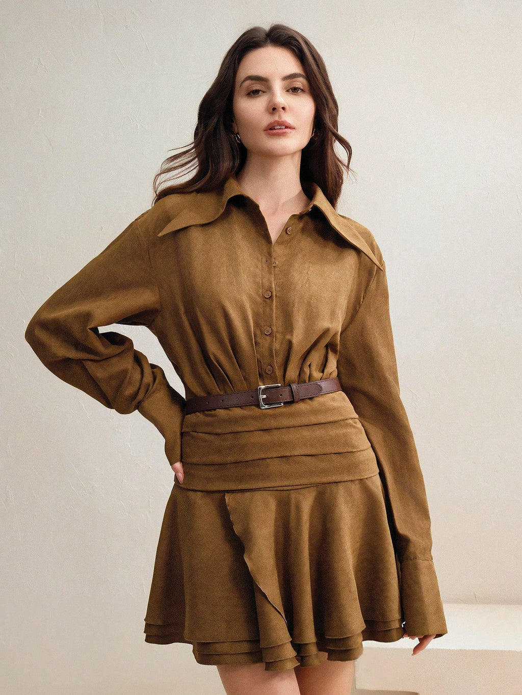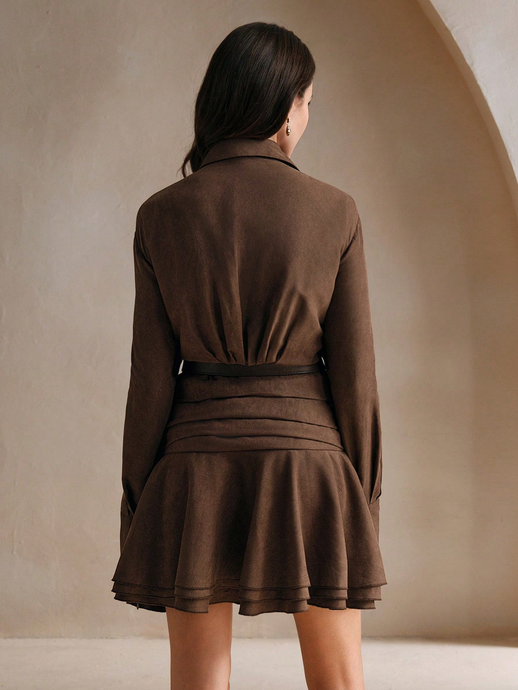 MIU European Unique Design Suede Ruffle Hem Casual Dress With Cinched Waist And Short Peplum Skirt Organza Women Outfit