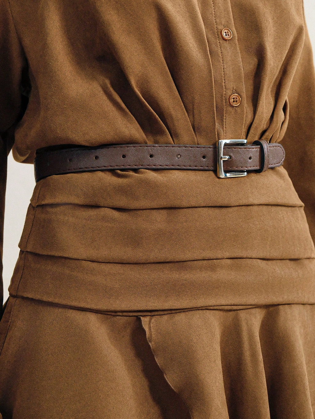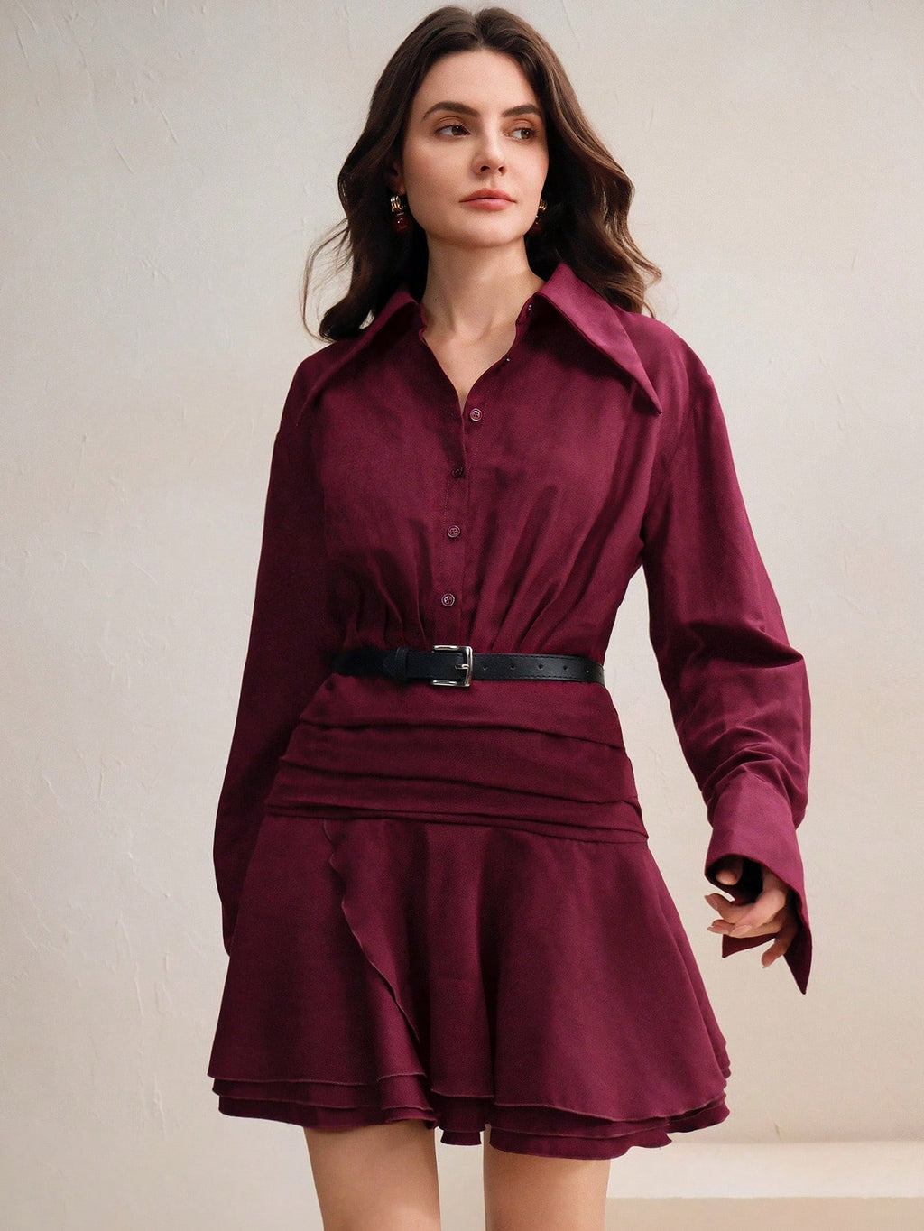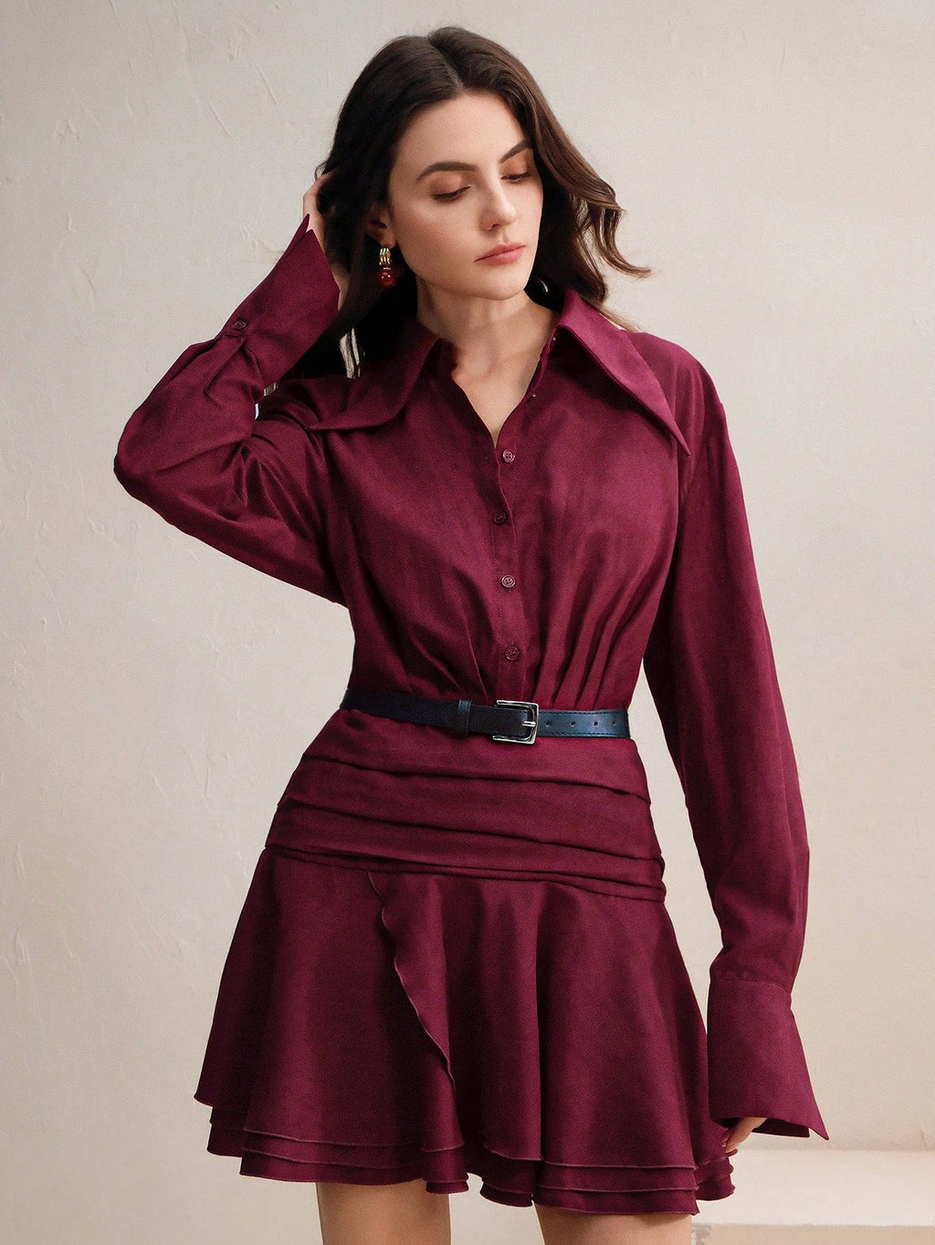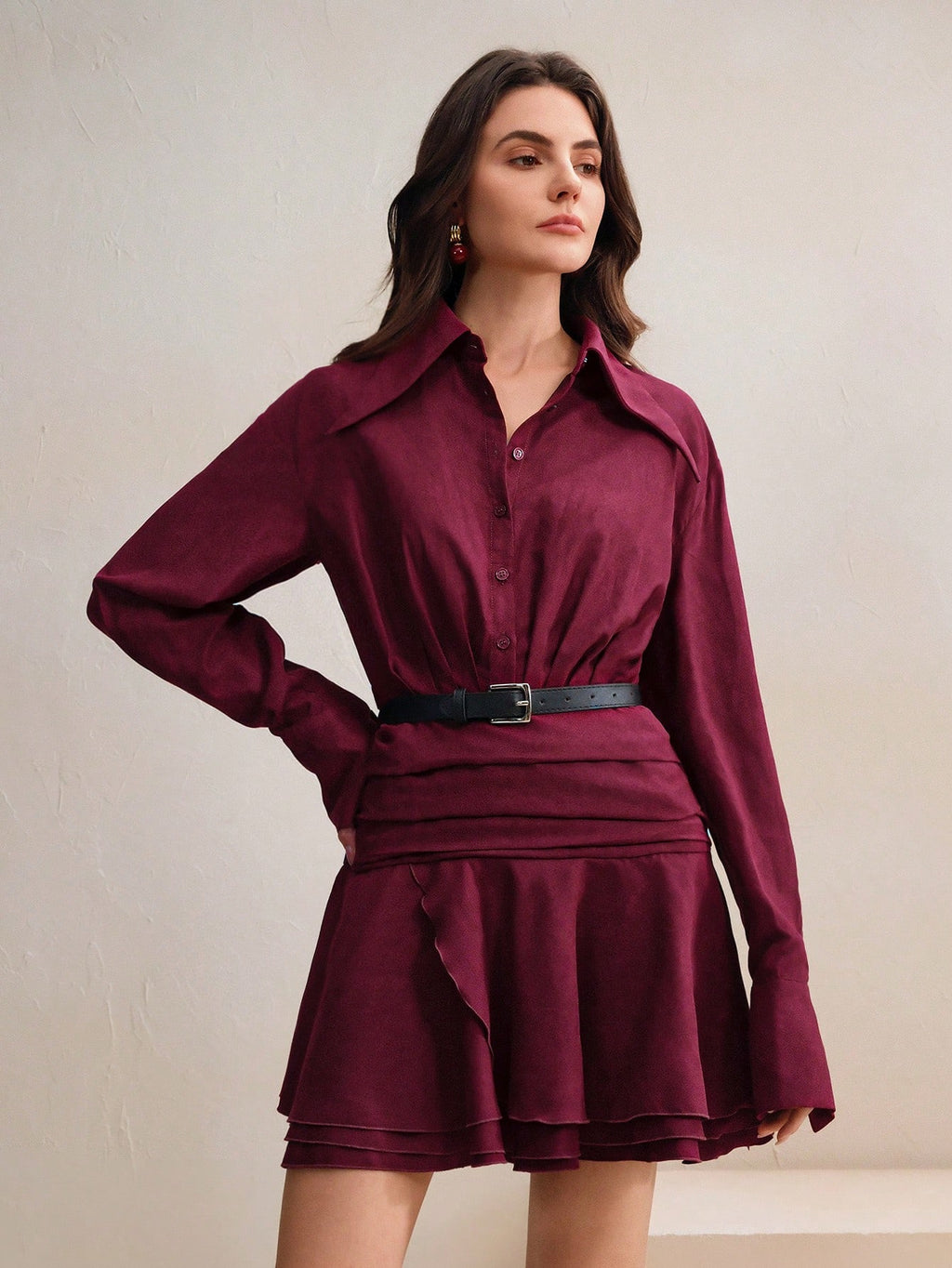 MIU European Unique Design Suede Ruffle Hem Casual Dress With Cinched Waist And Short Peplum Skirt Organza Women Outfit