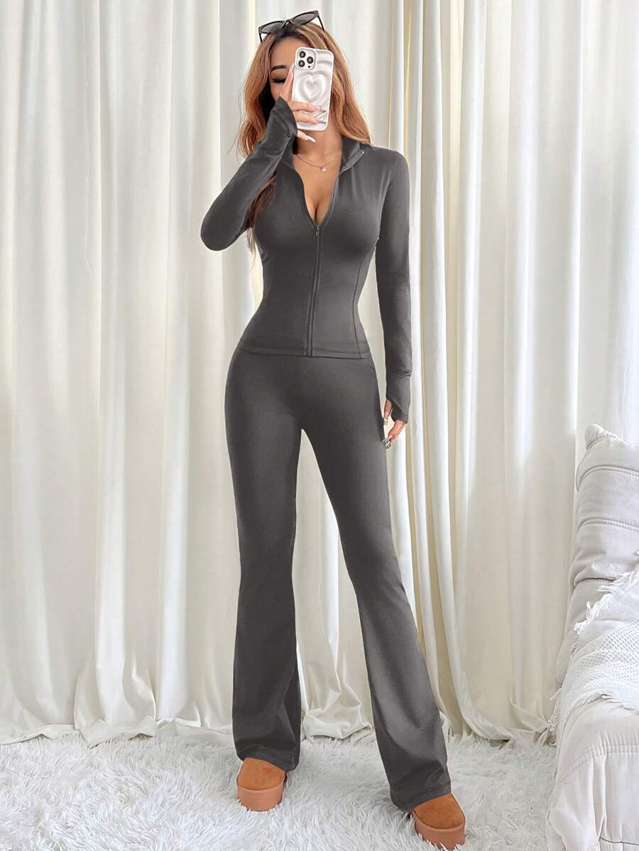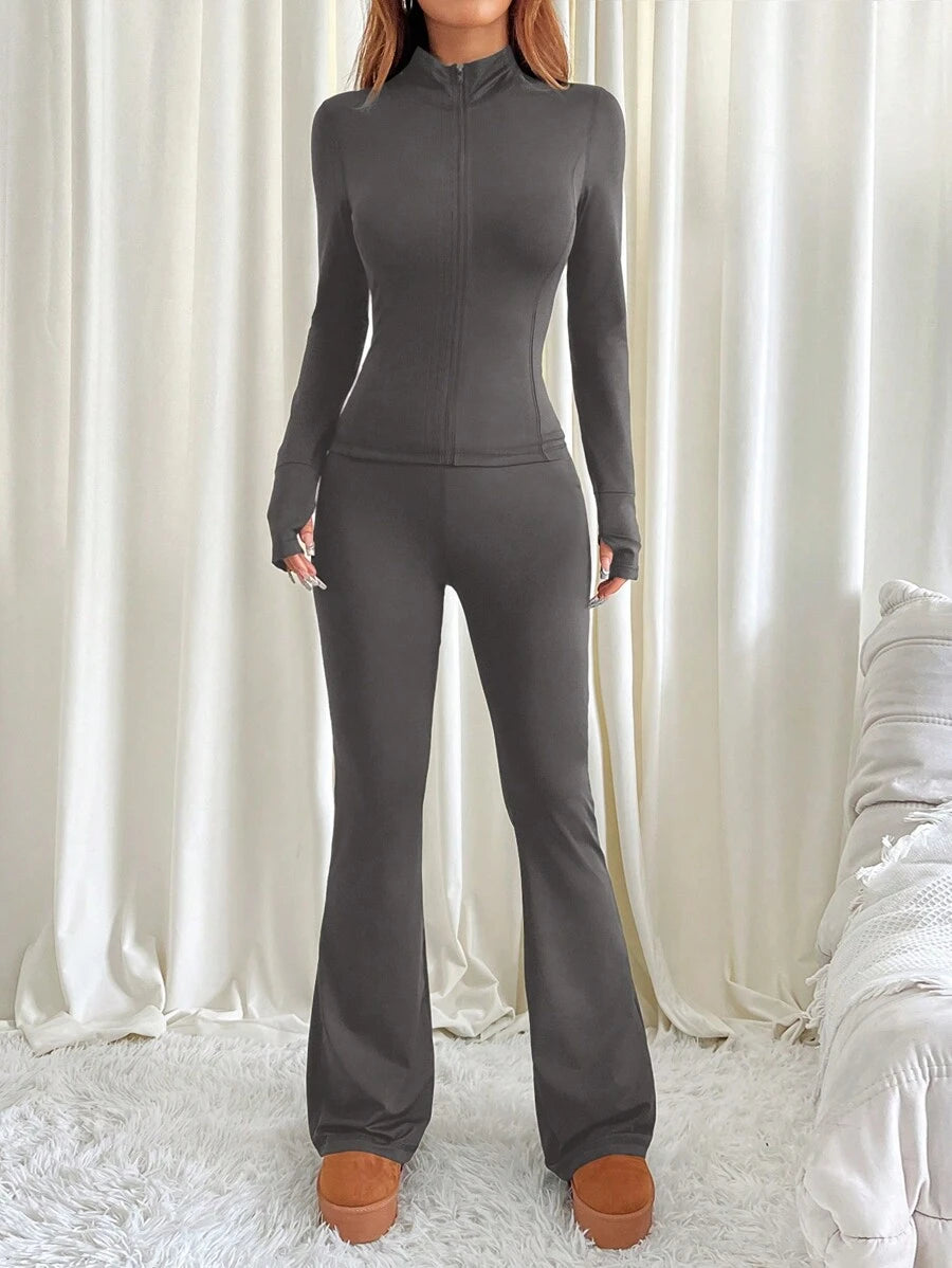MIU EZwear 2pcs Women Casual Solid Color Long Sleeve Top And Flared Pants Set, Autumn/Winter