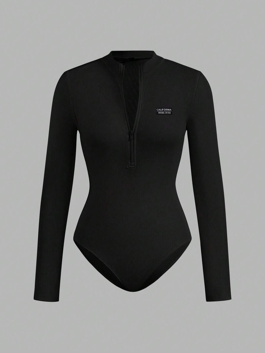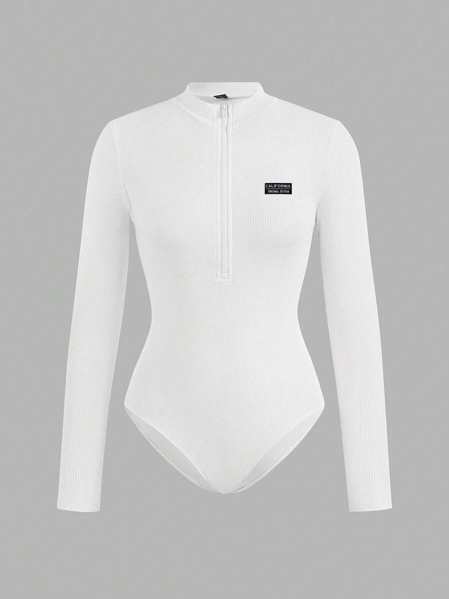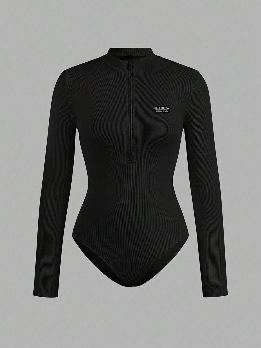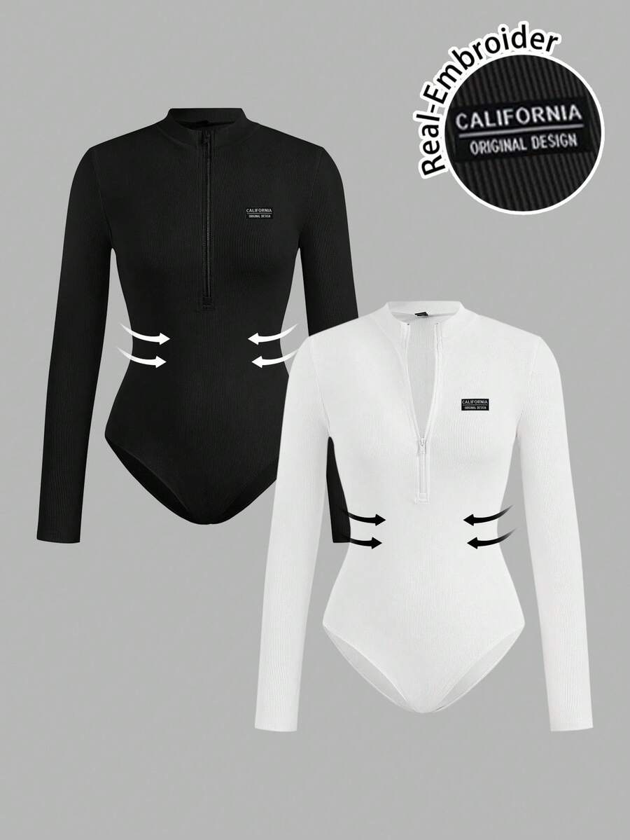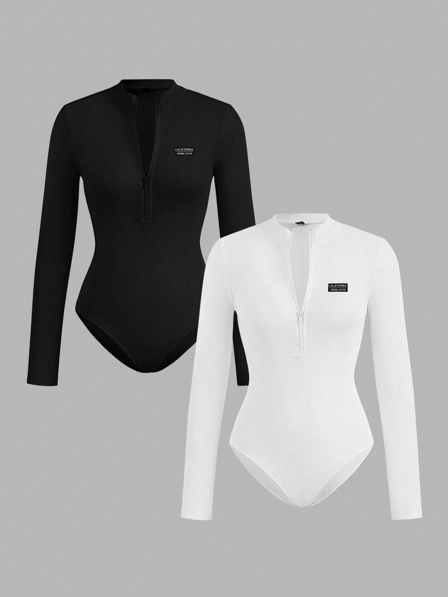 MIU EZwear 2pcs Women Casual Stand Collar Half Zip Front Skinny Bodysuit Set, Ribbed Fabric, Riding Horse Logo Print Autumn And Winter