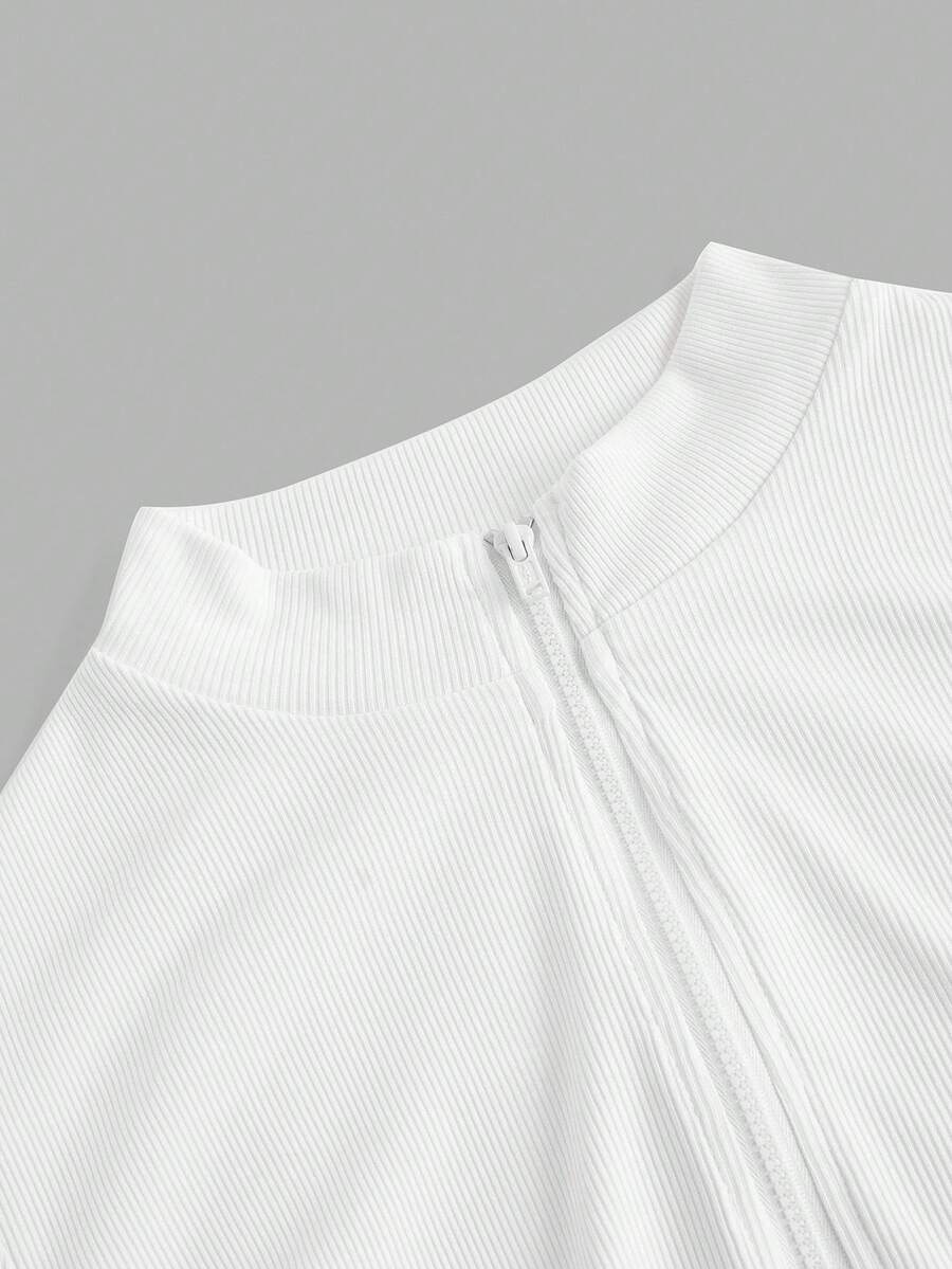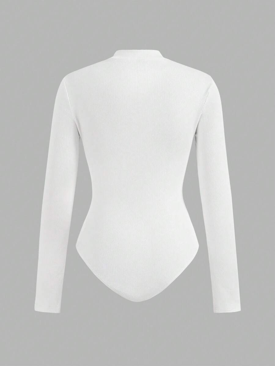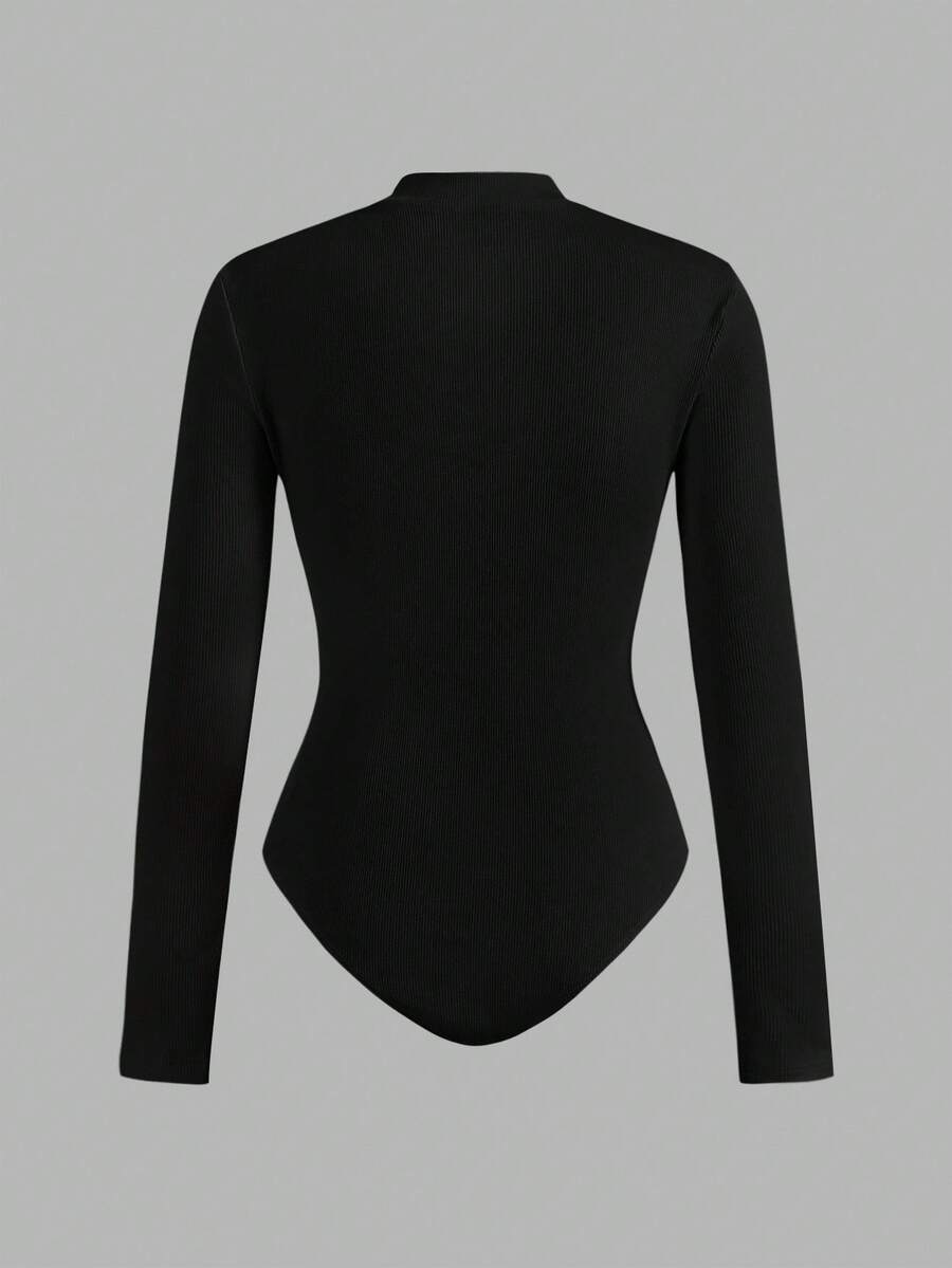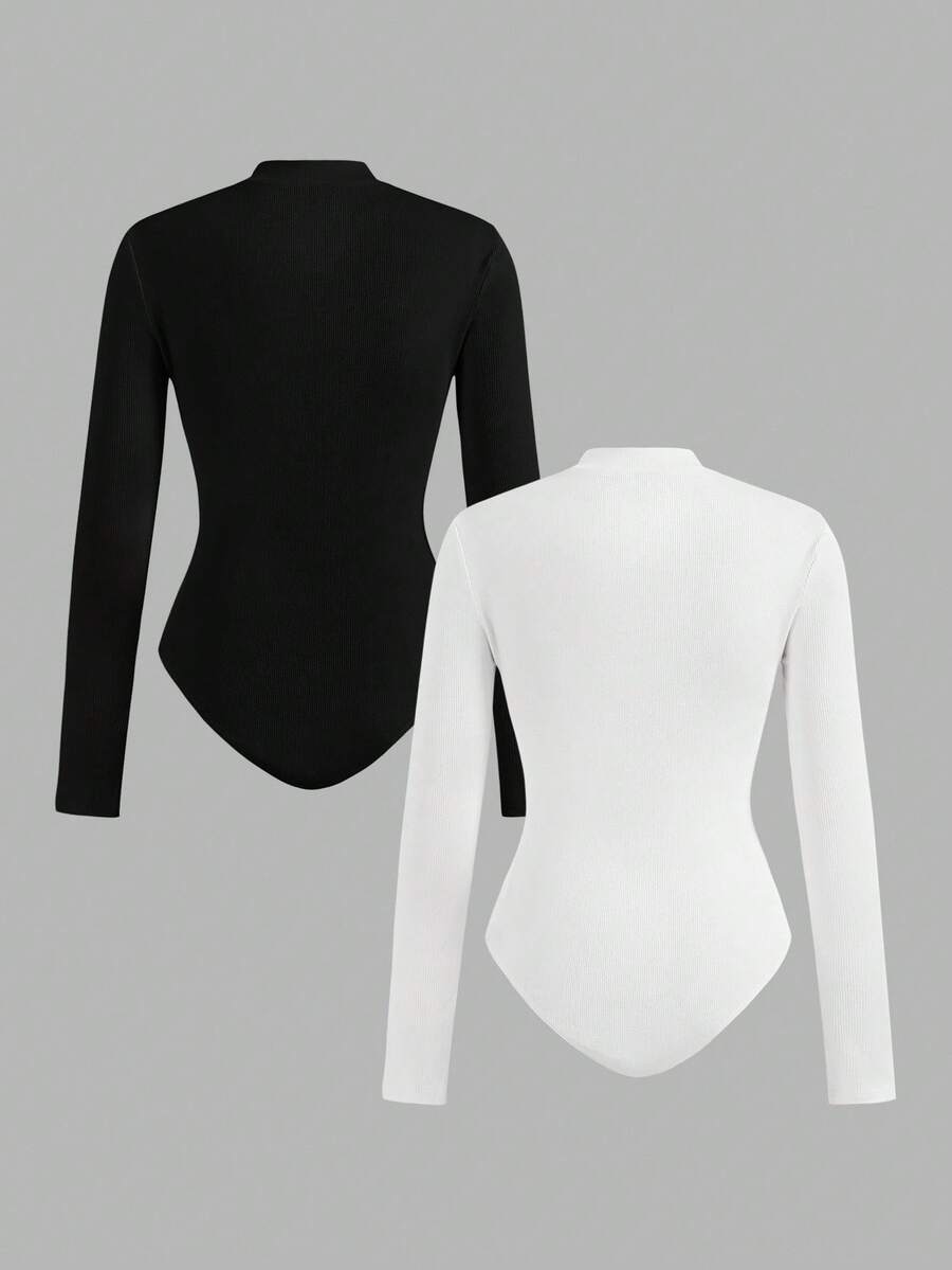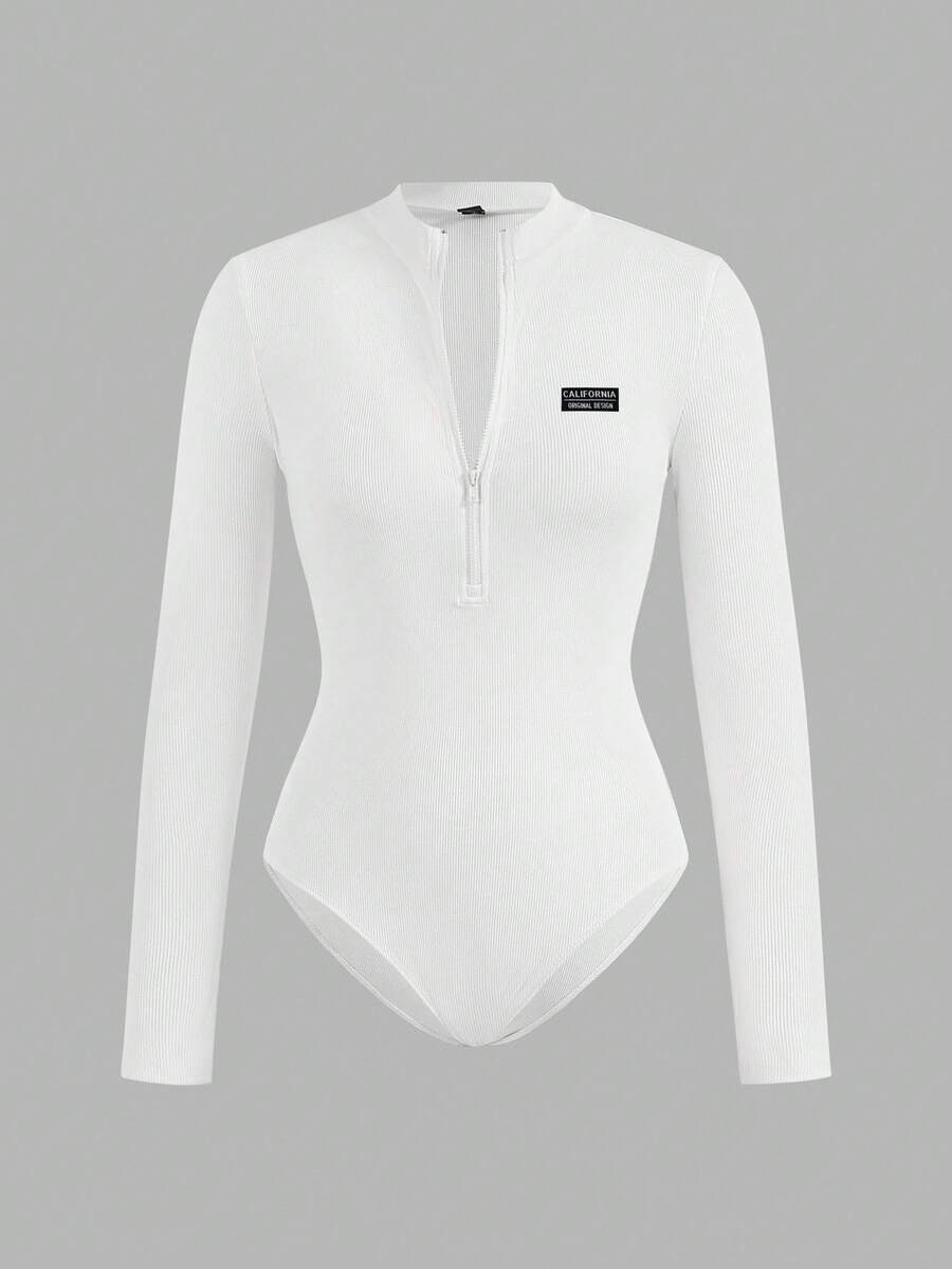 MIU EZwear 2pcs Women Casual Stand Collar Half Zip Front Skinny Bodysuit Set, Ribbed Fabric, Riding Horse Logo Print Autumn And Winter