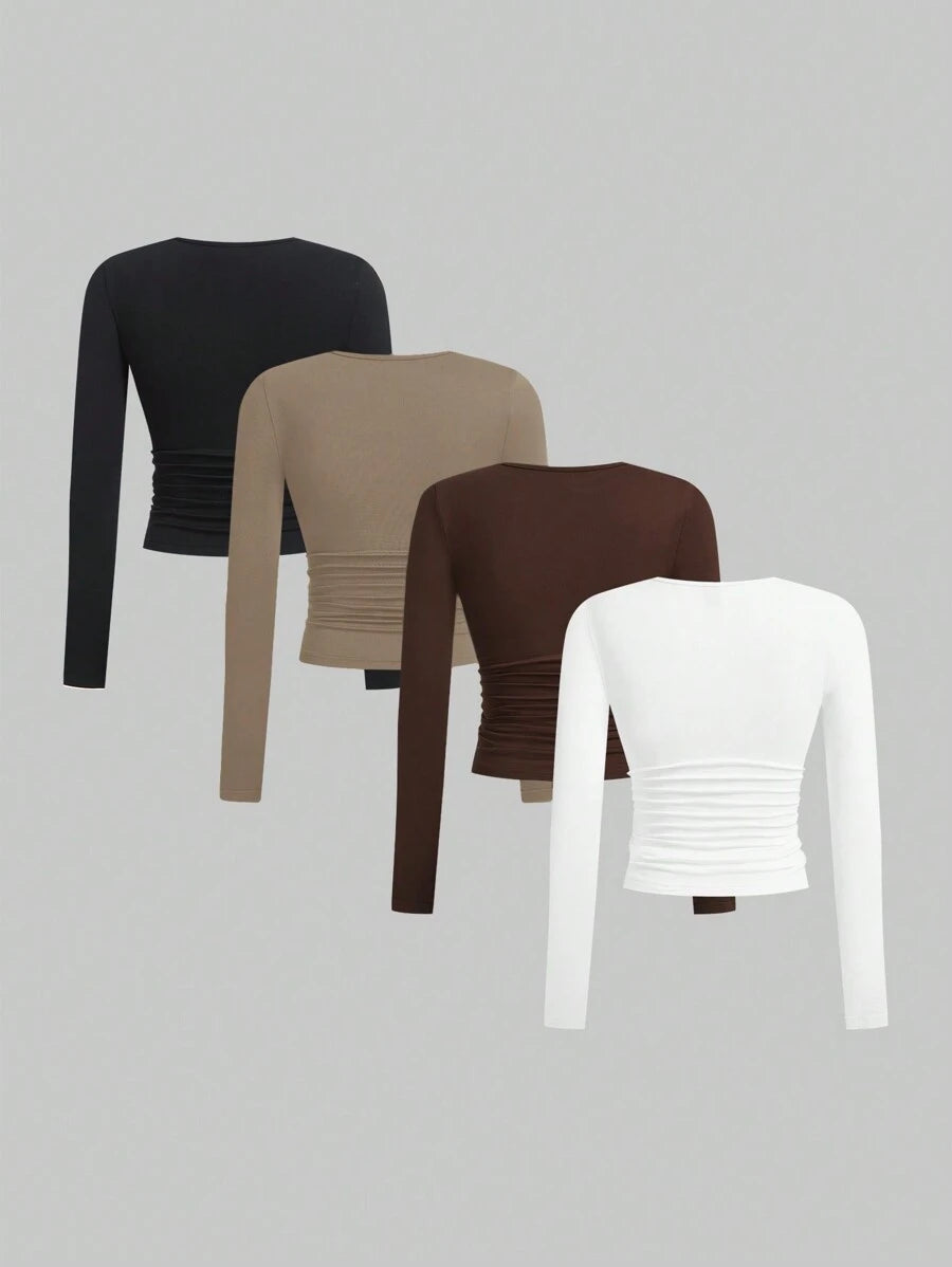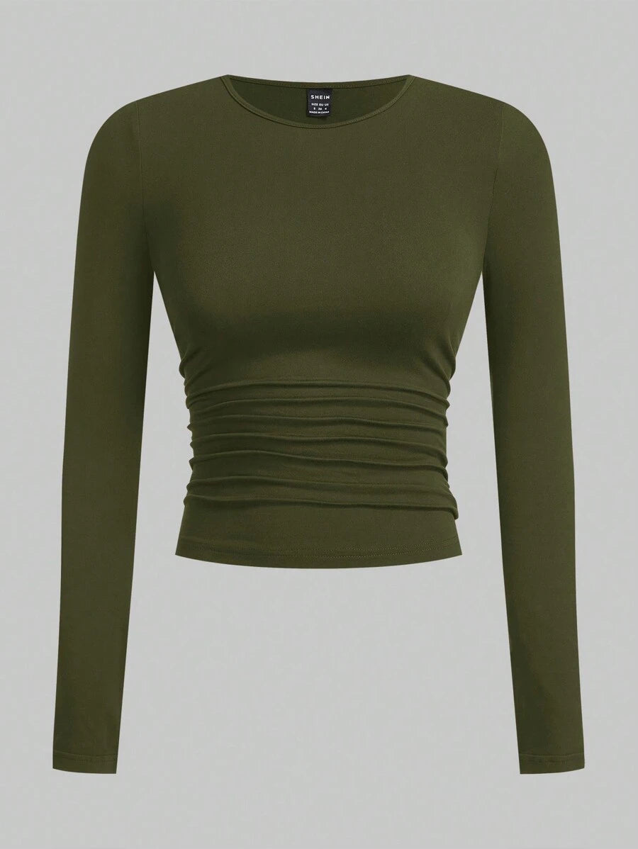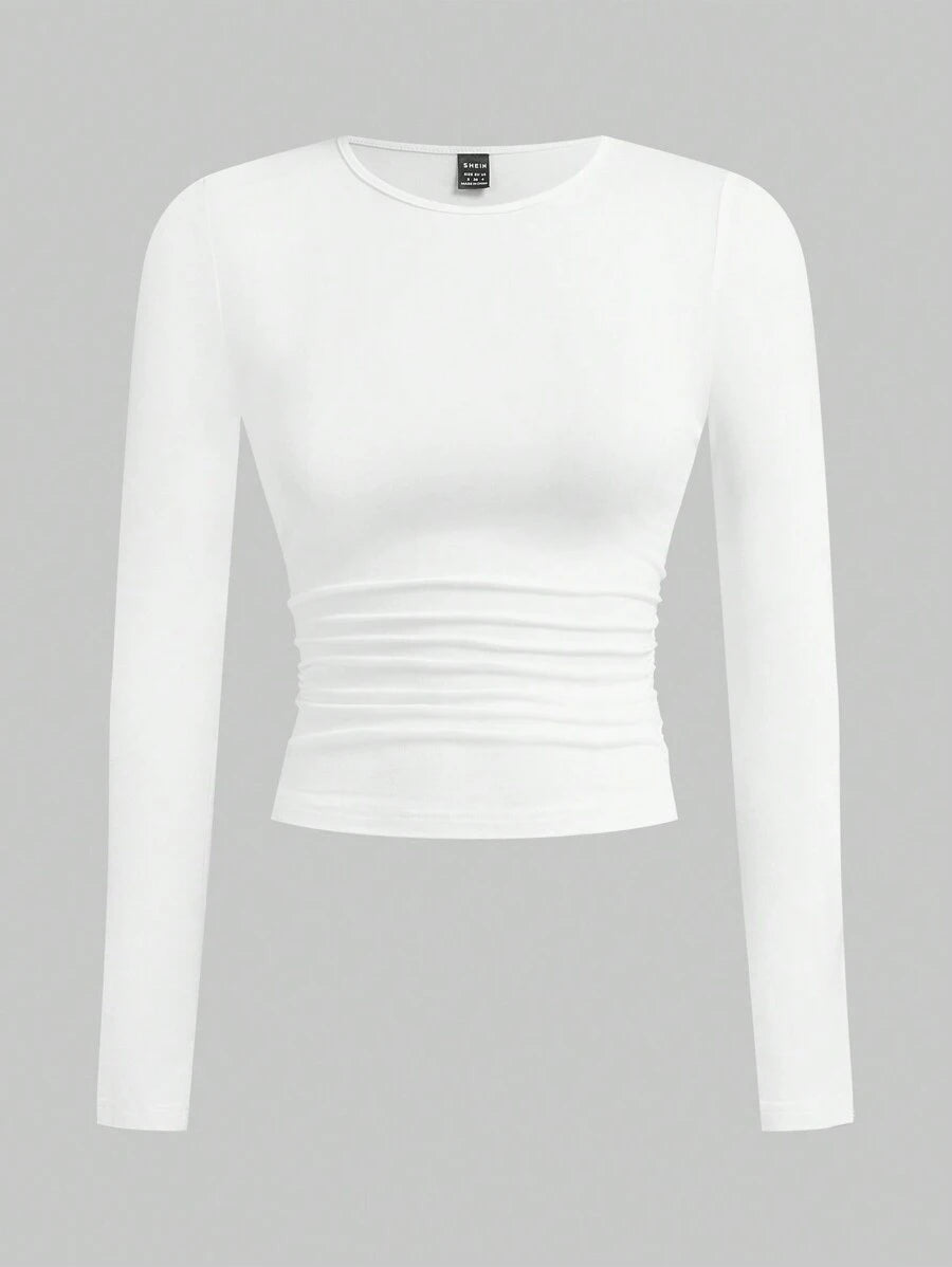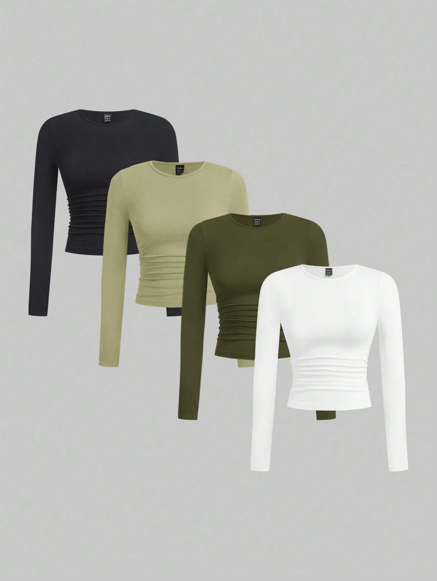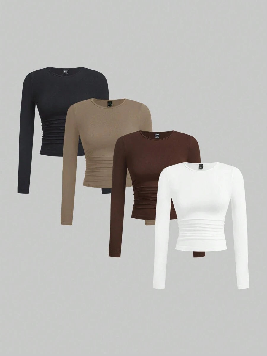 MIU EZwear Multi-Color Knitted Women's Round Neck Long Sleeve Ruched Bodycon T-Shirt