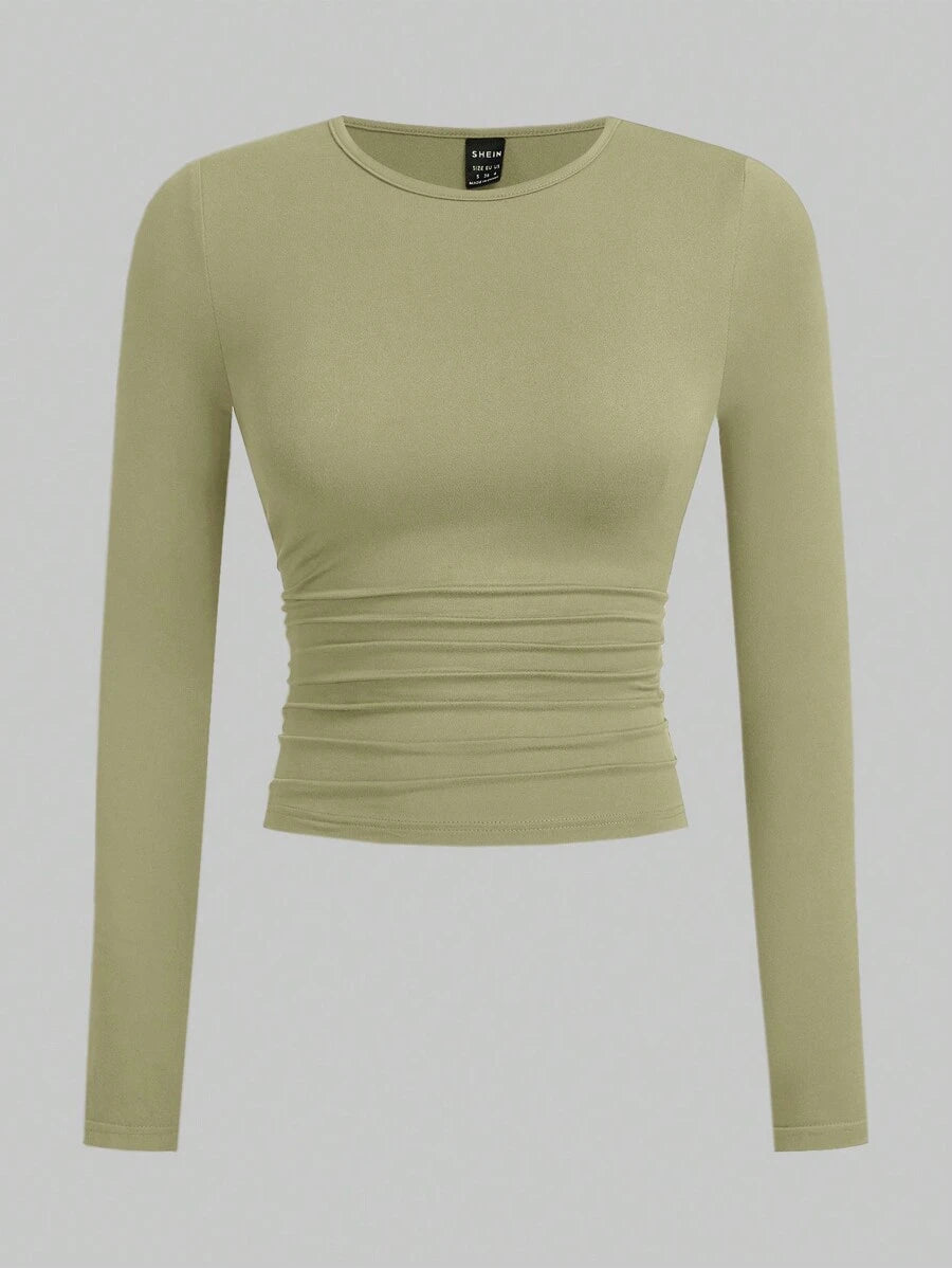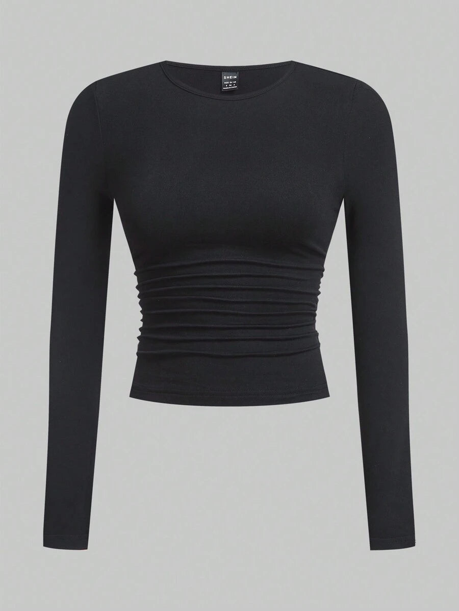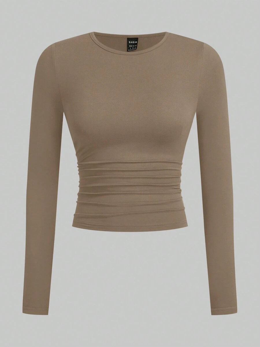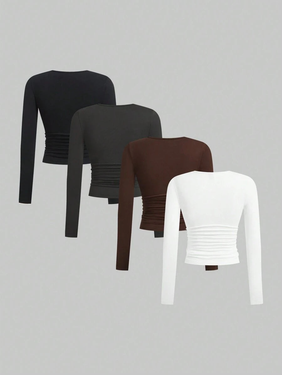 MIU EZwear Multi-Color Knitted Women's Round Neck Long Sleeve Ruched Bodycon T-Shirt