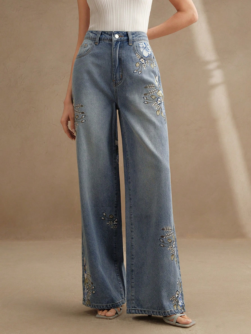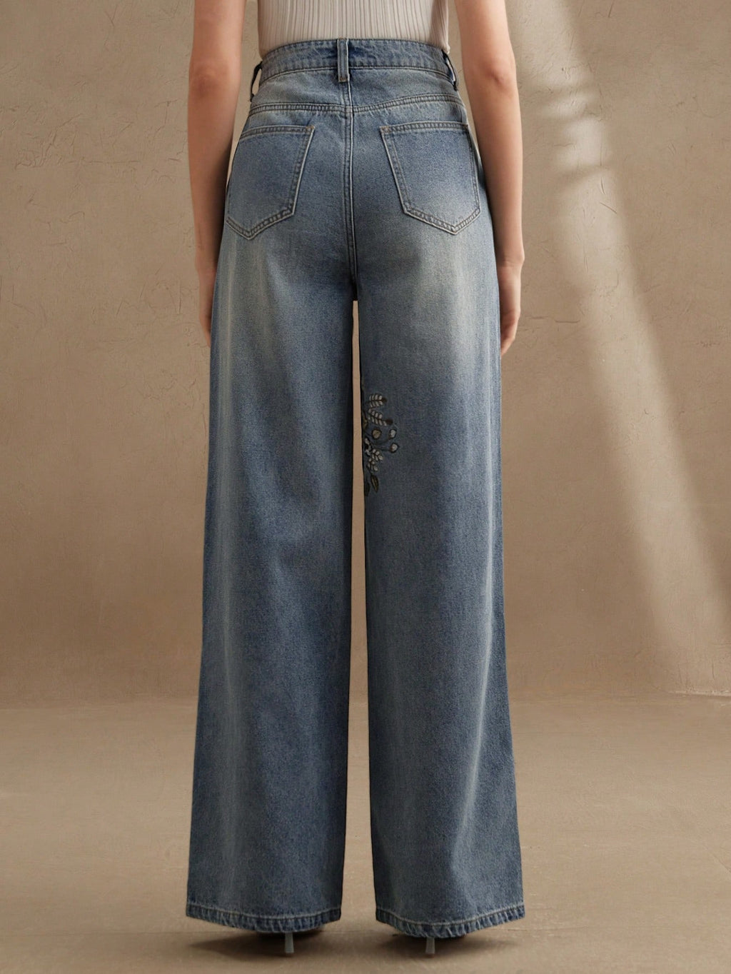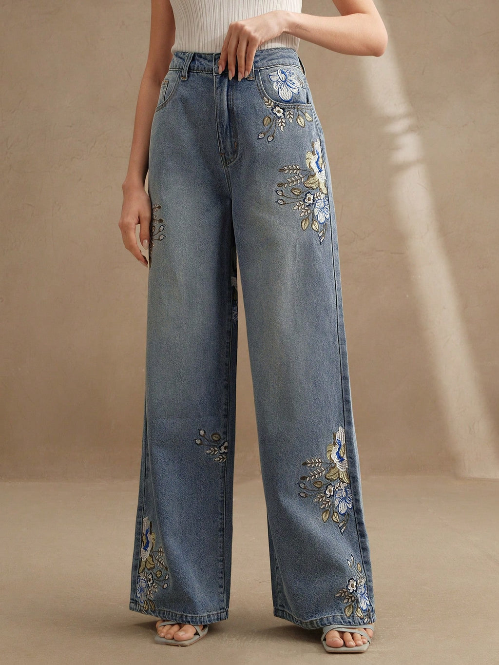 MIU Fashionable Embroidered Blue Denim Straight-Leg Pants For Women