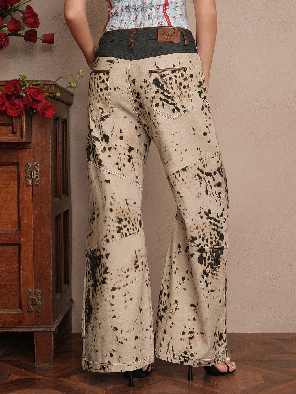 MIU Fashionable Low-Waist Slimming Patchwork Vintage Leopard Print Pleated Straight Leg Jeans