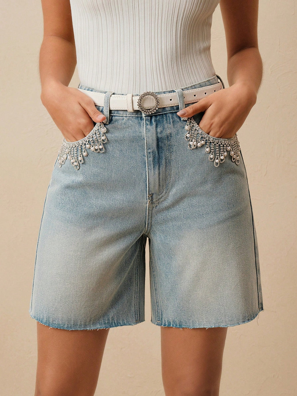 MIU Fashionable Rhinestone Pearl Button Casual Denim Women Shorts