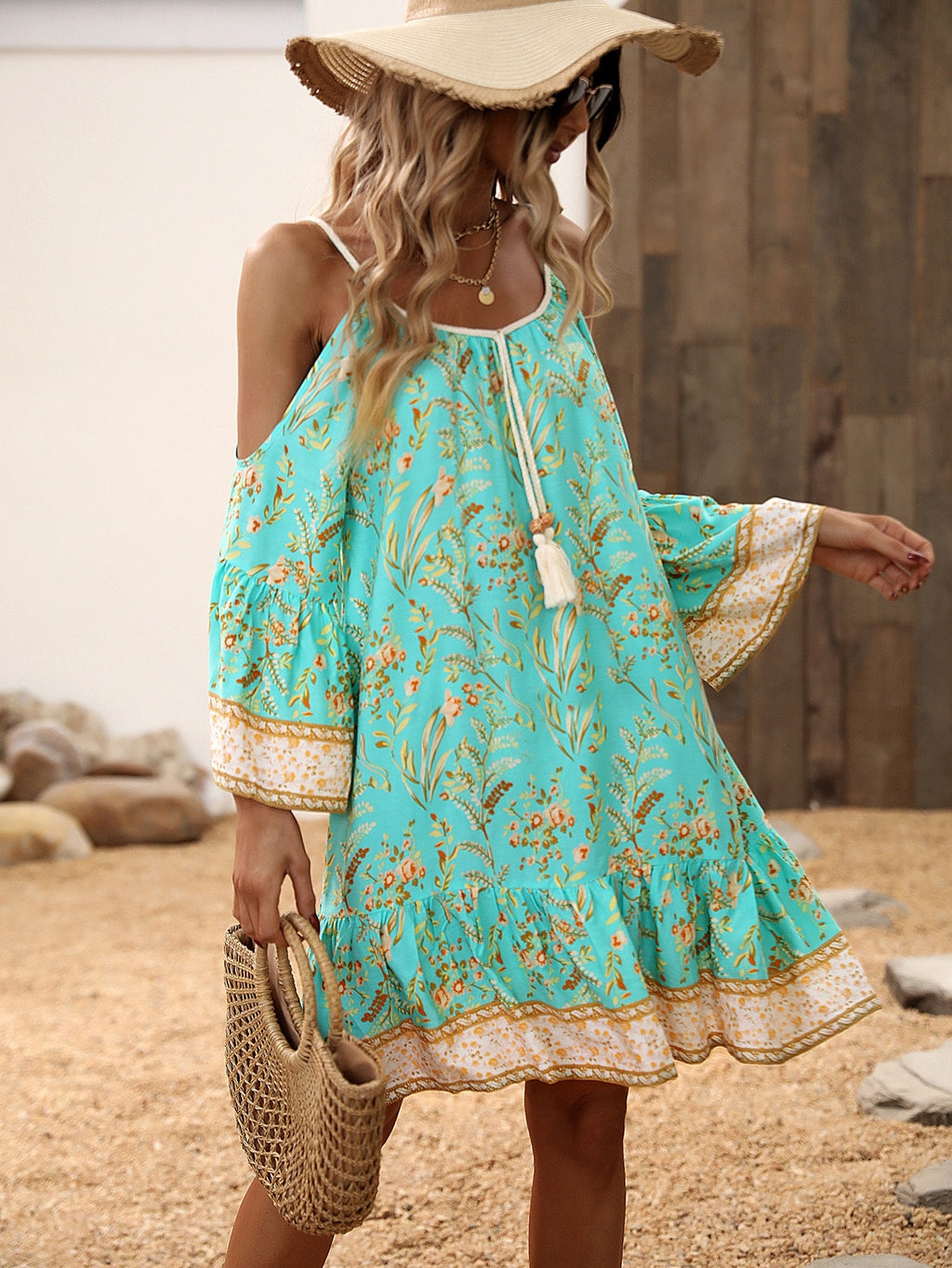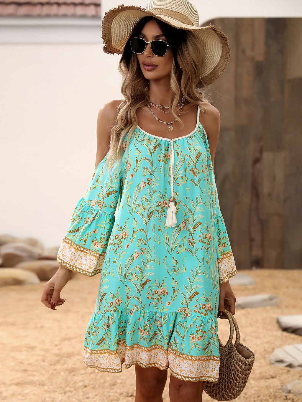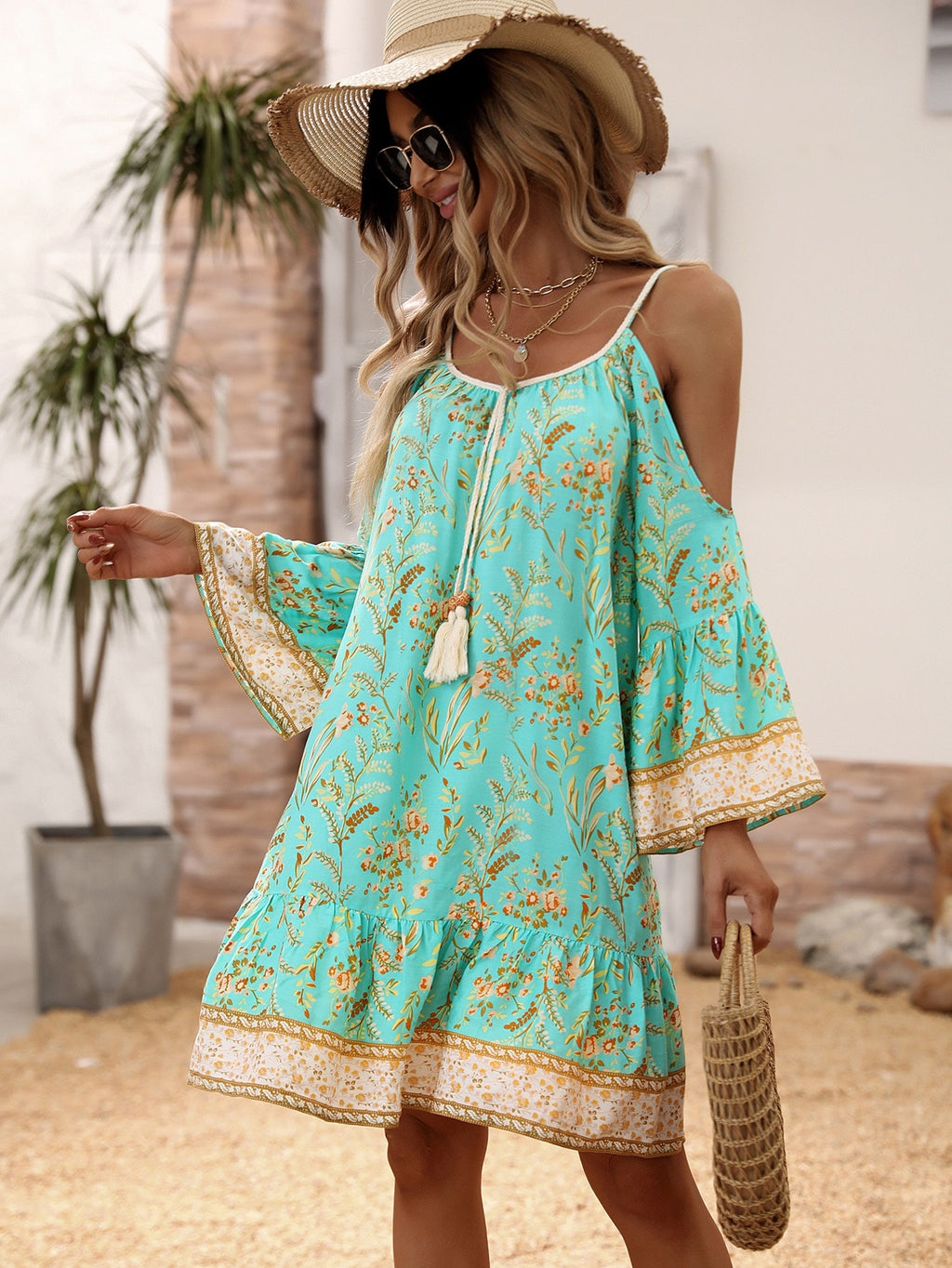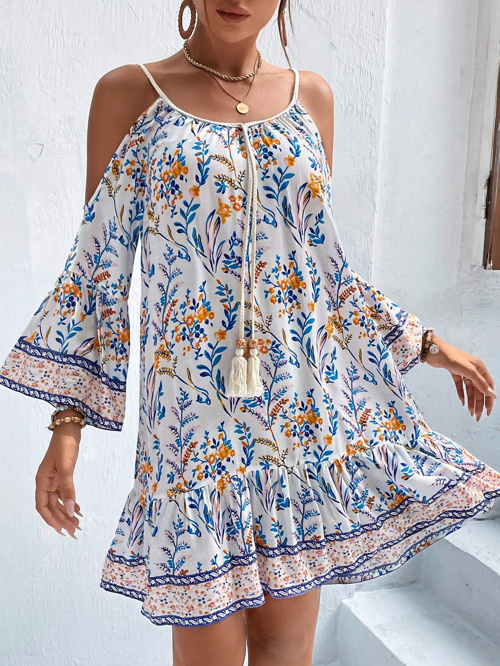 MIU Floral Print Cold Shoulder Tassel Trim Ruffle Hem Dress Vacation Beach Outfits Women
