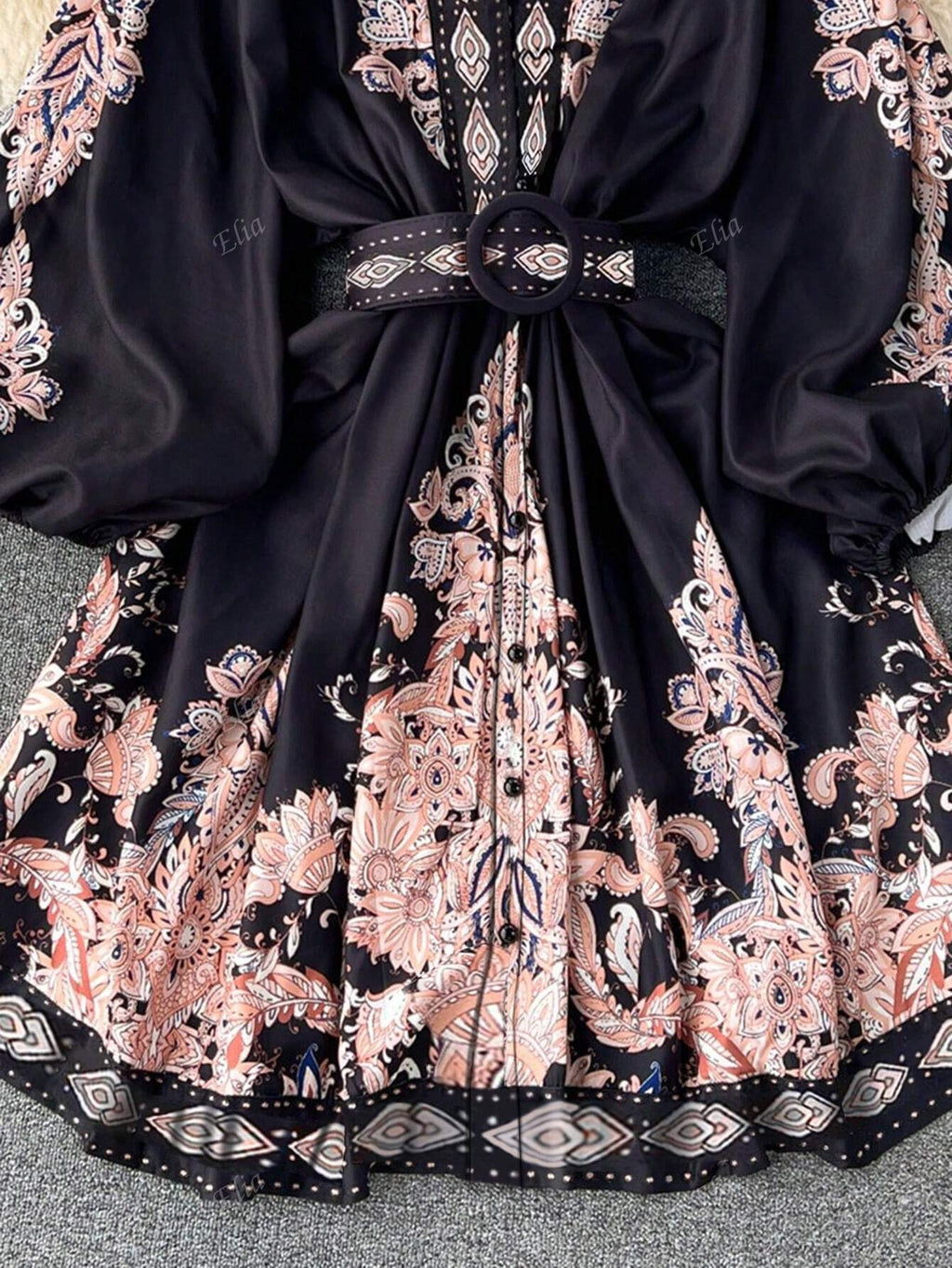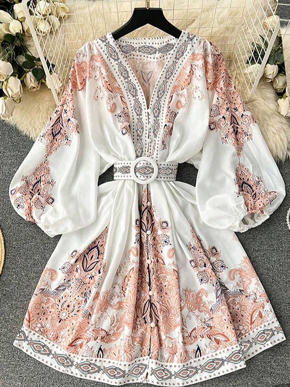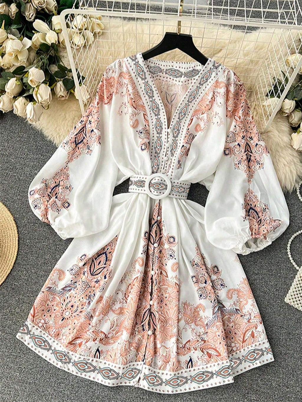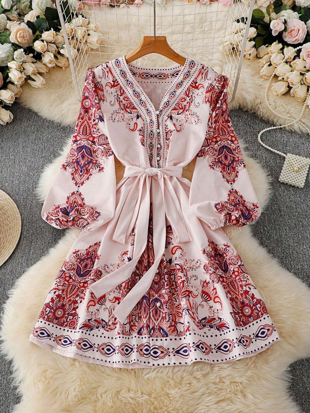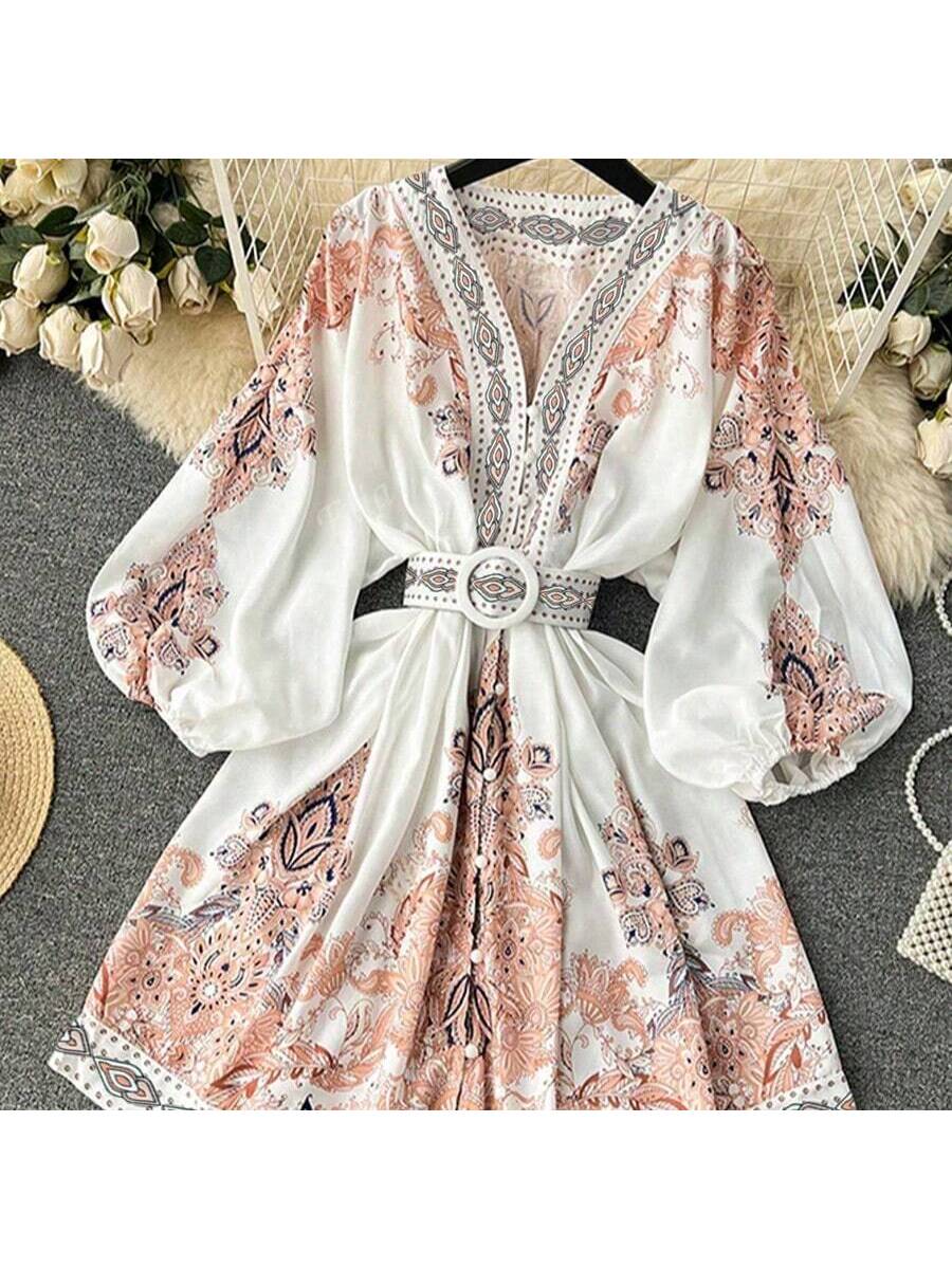 MIU Floral Print Lantern Sleeve Button-Front Dress, Boho Style, Long-Sleeved Short Floral Slim-Fitting Skirt For Women, Spring And Summer, Resort Wear