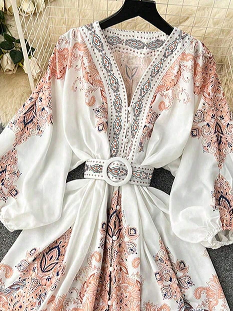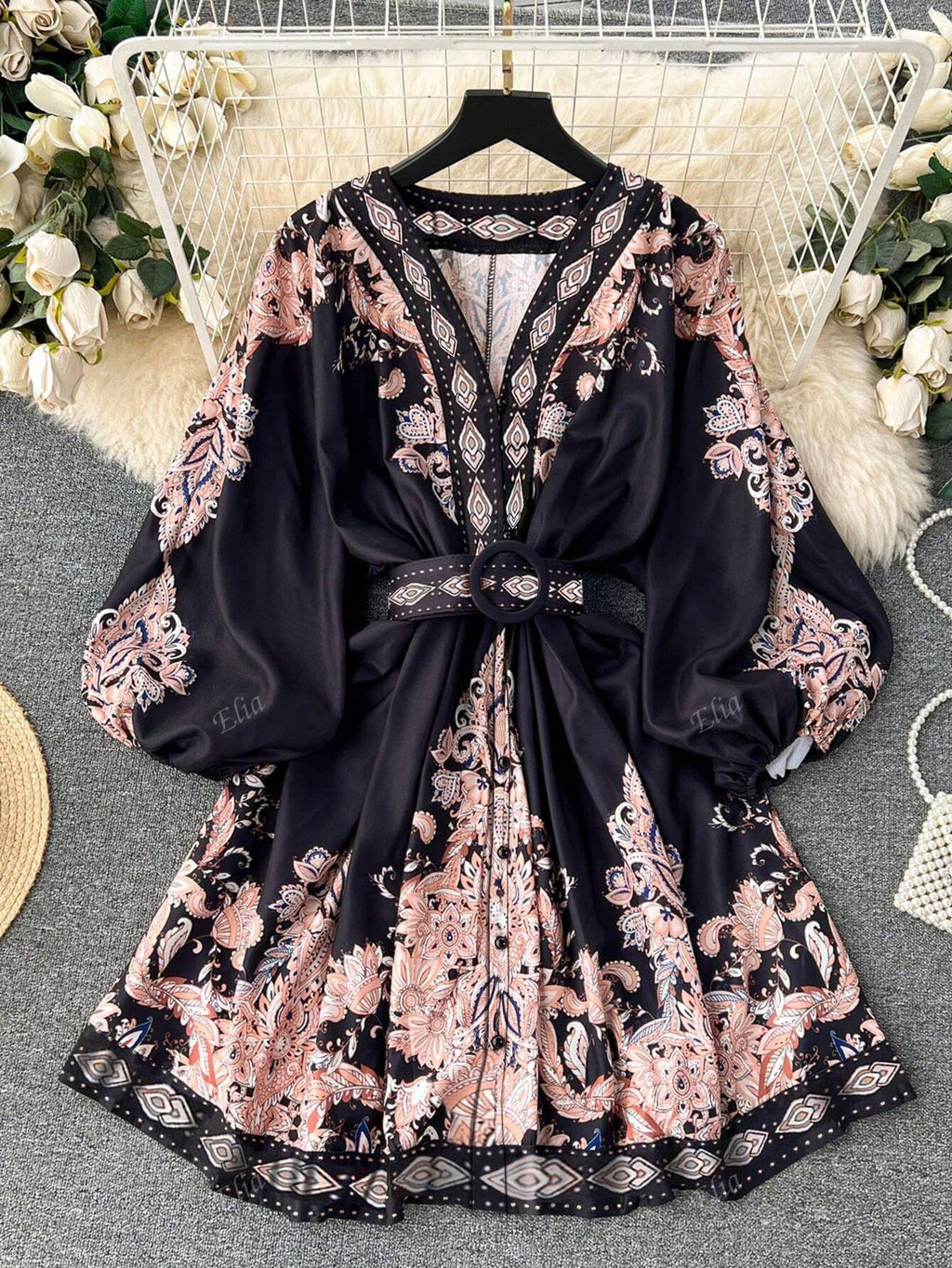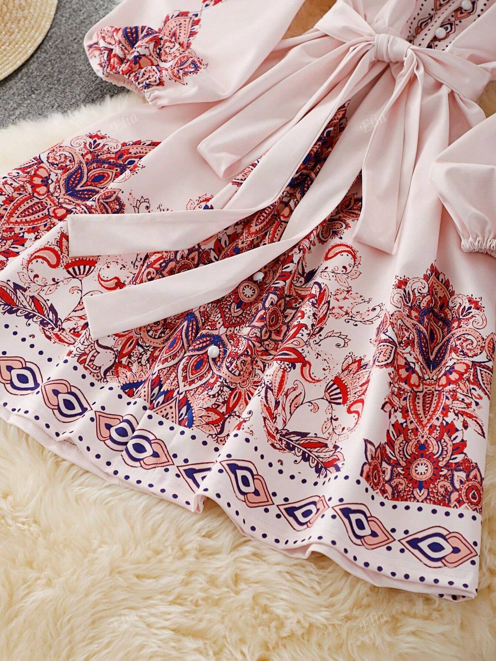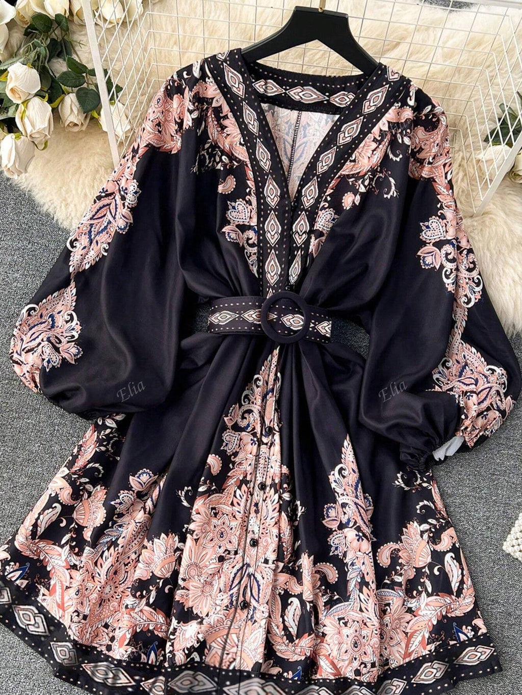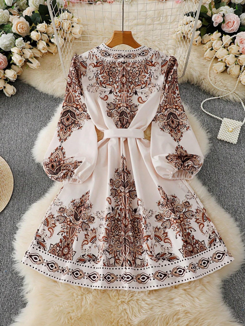 MIU Floral Print Lantern Sleeve Button-Front Dress, Boho Style, Long-Sleeved Short Floral Slim-Fitting Skirt For Women, Spring And Summer, Resort Wear