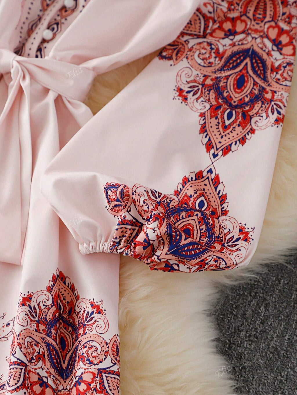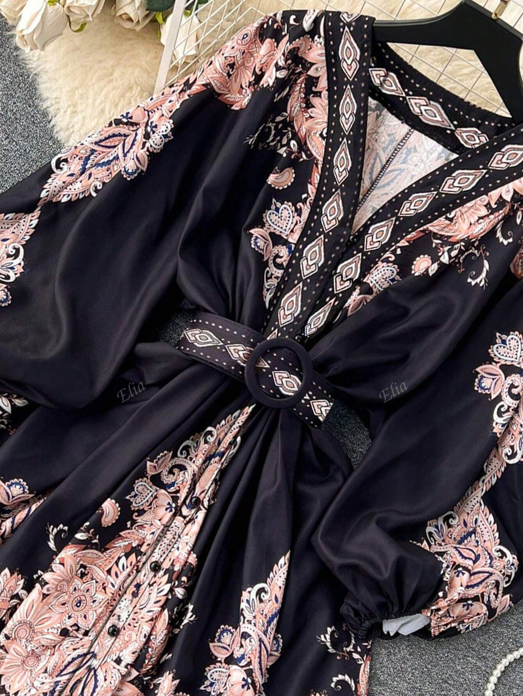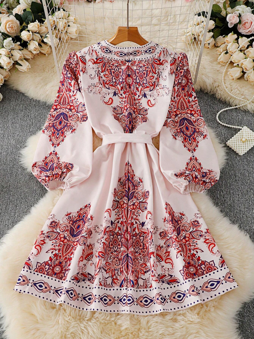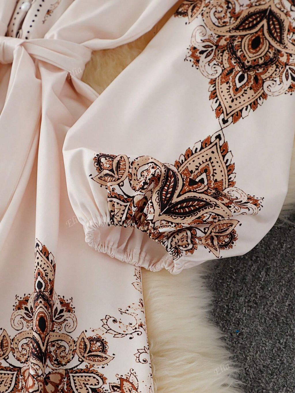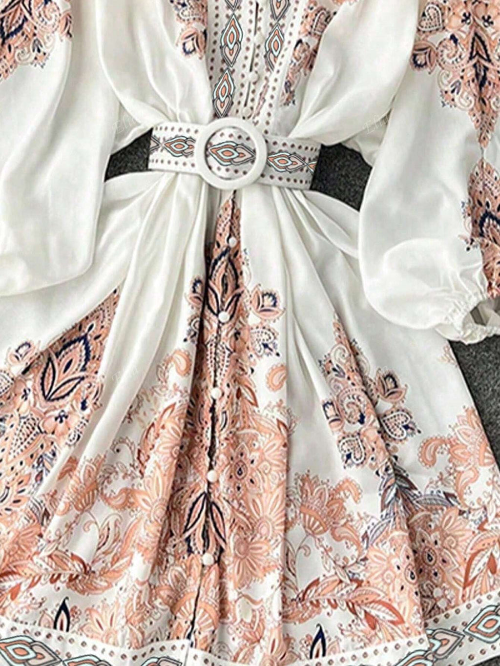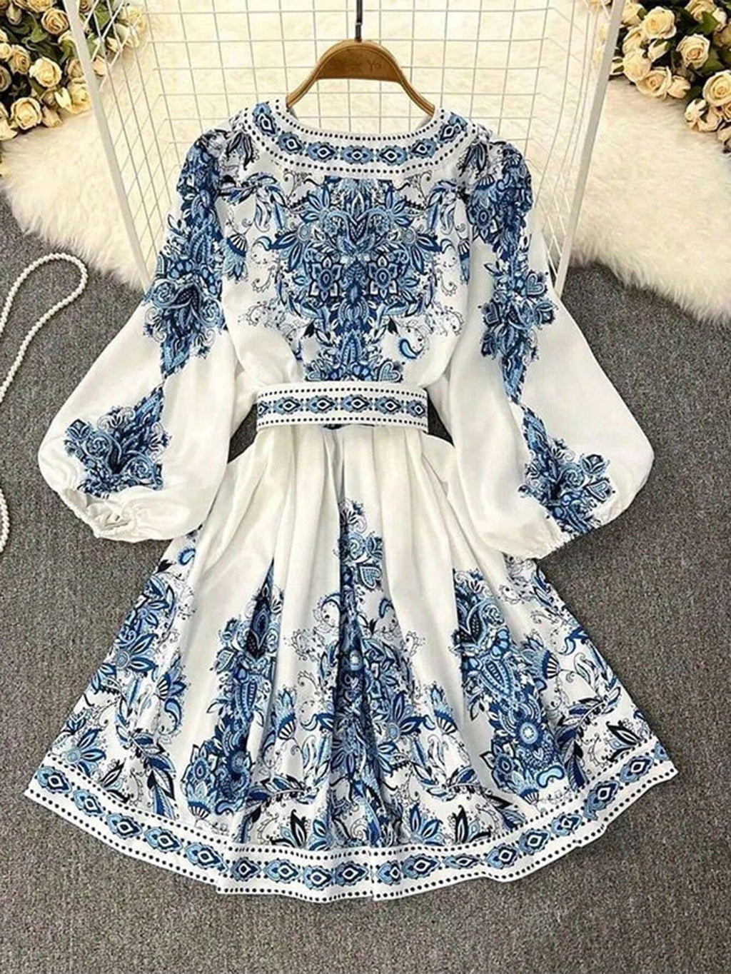 MIU Floral Print Lantern Sleeve Button-Front Dress, Boho Style, Long-Sleeved Short Floral Slim-Fitting Skirt For Women, Spring And Summer, Resort Wear