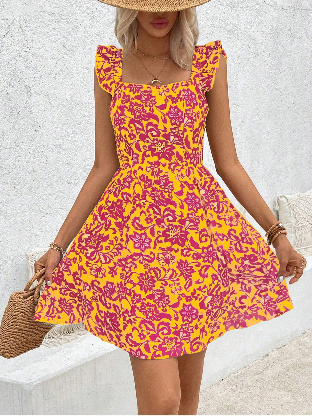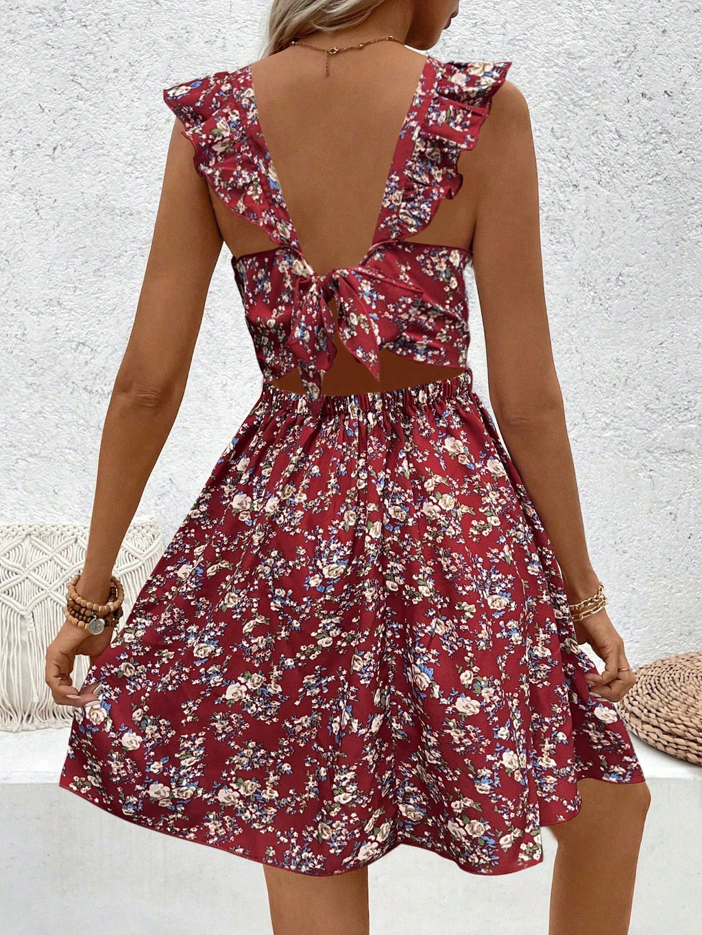 MIU Floral Printed Hollow Out Hem Ruffle Trim Decorated Dress Vacation Beach Outfits Women