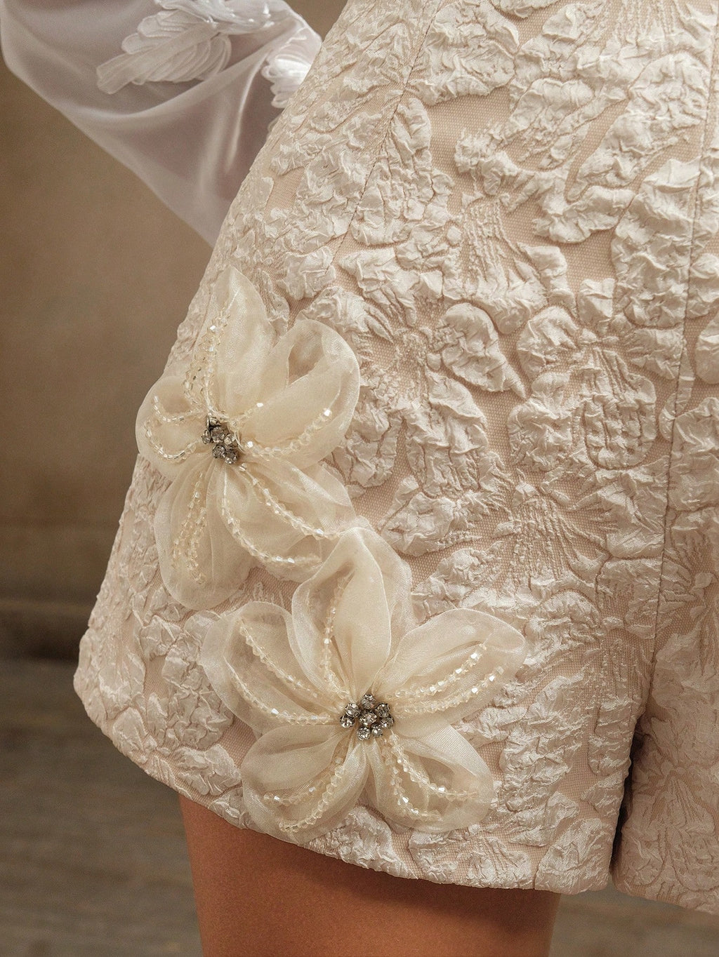 MIU French Elegant Embossed Handmade 3D Beaded Flower A-Line Shorts