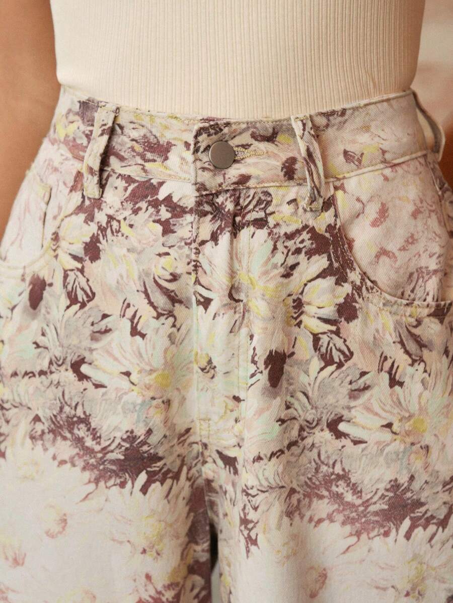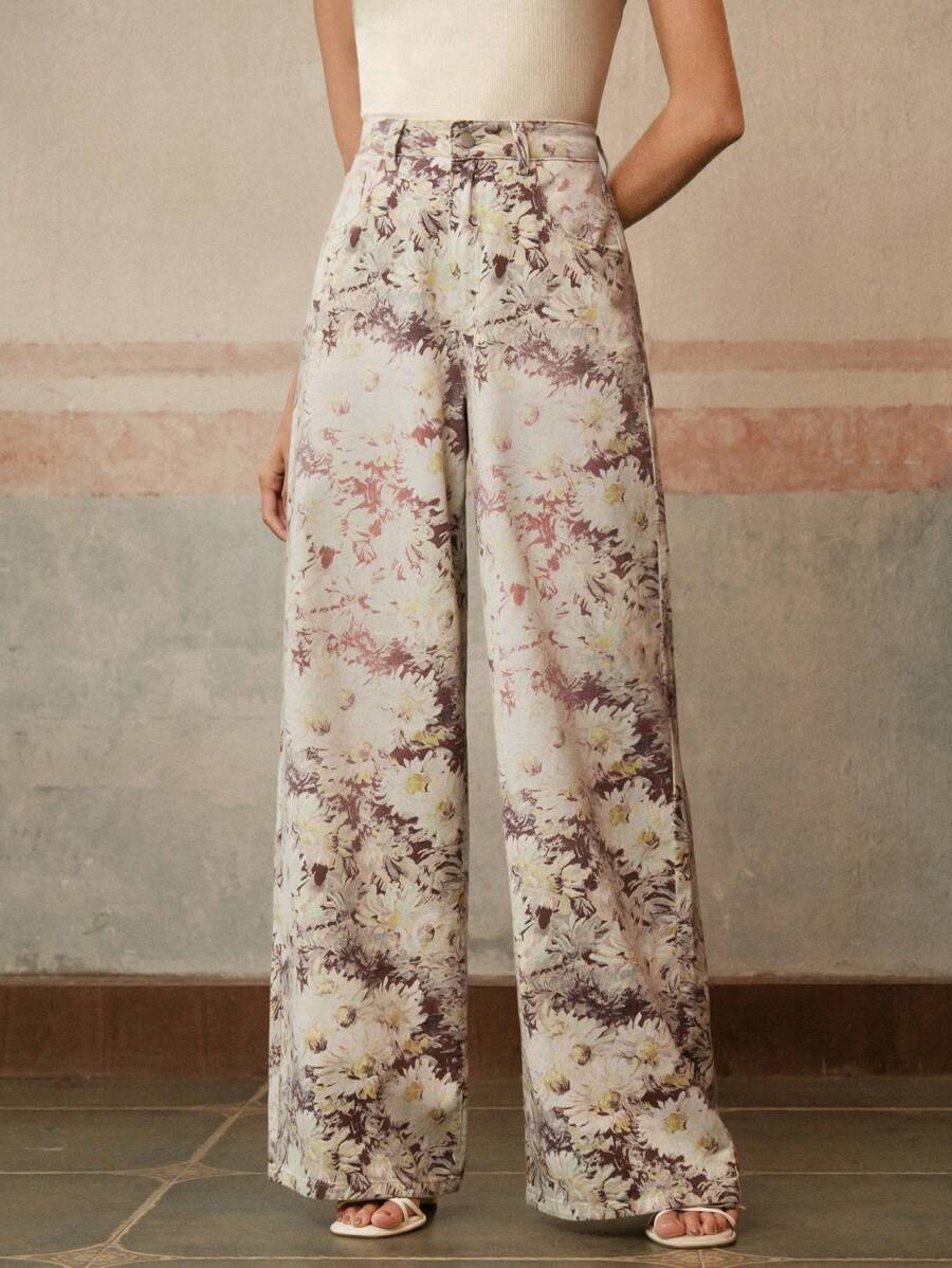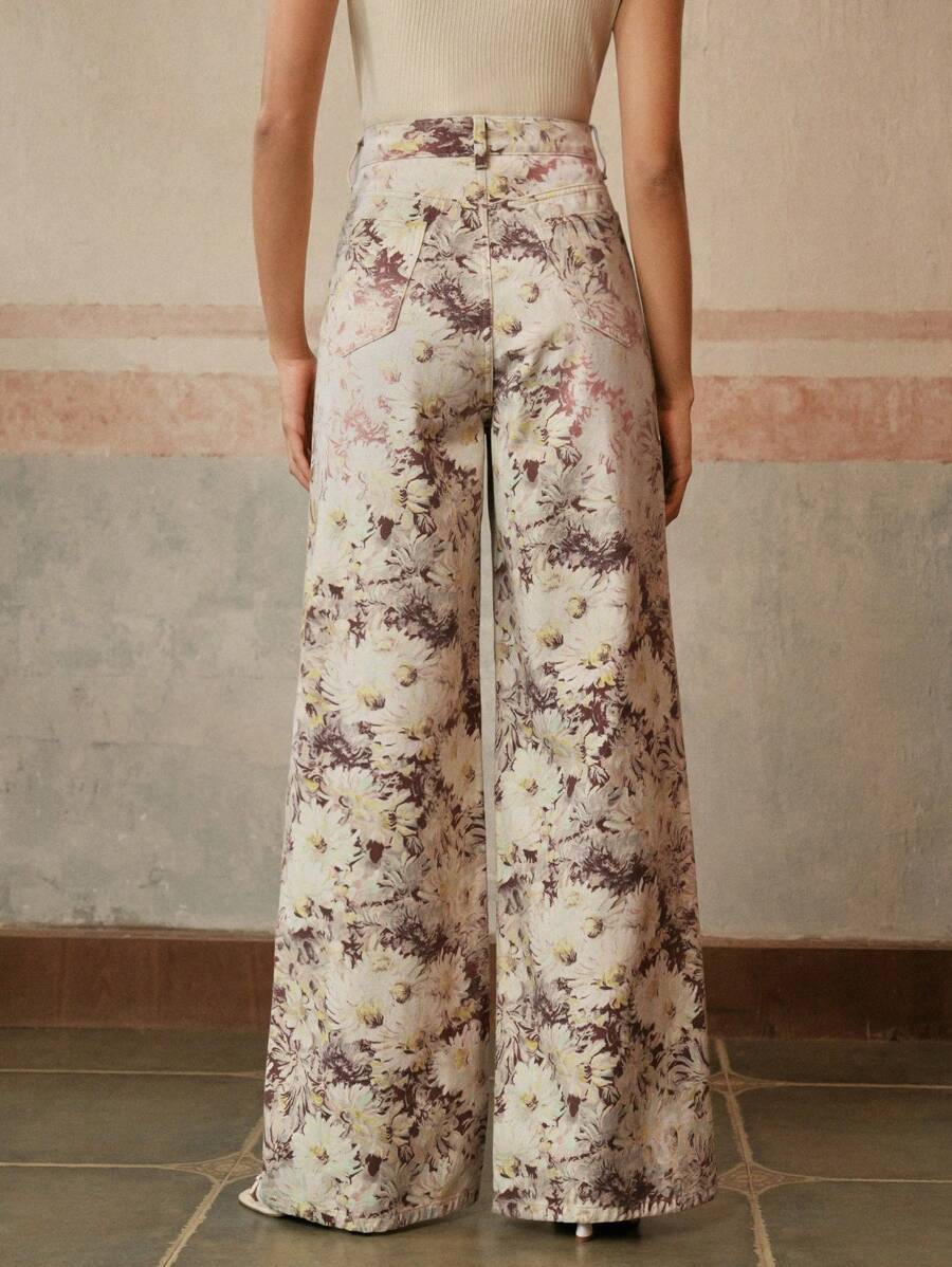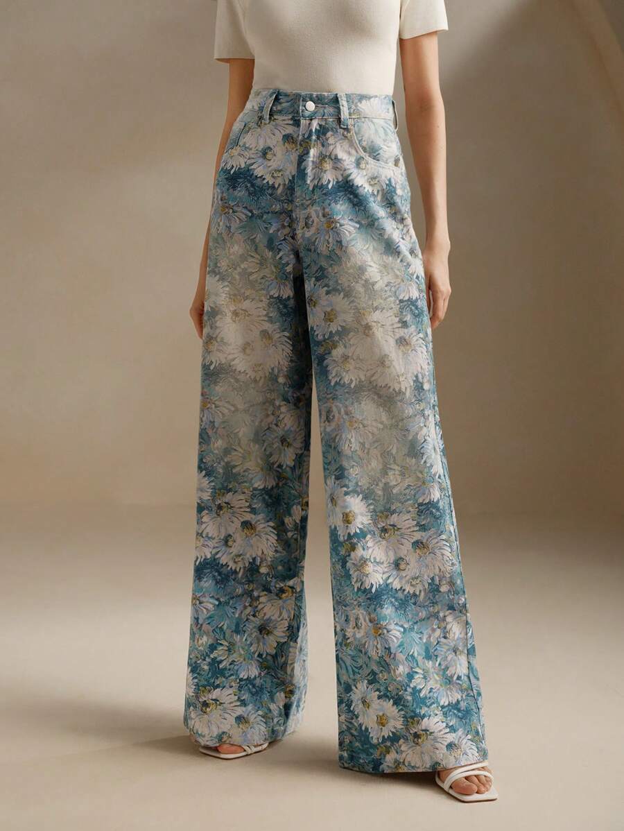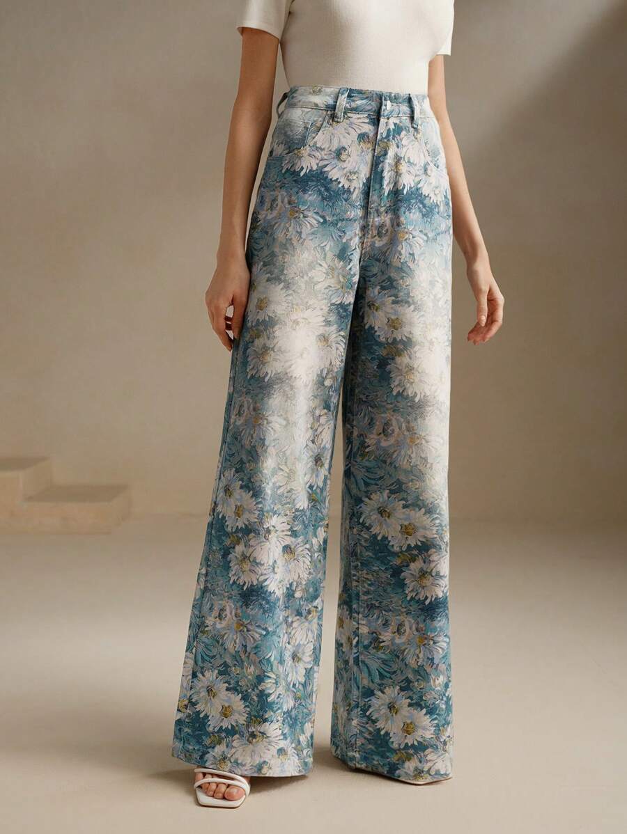 MIU High-Waist Wide Leg Vintage Print Jeans For Women, Business Casual, Elegant, Suitable For Holidays